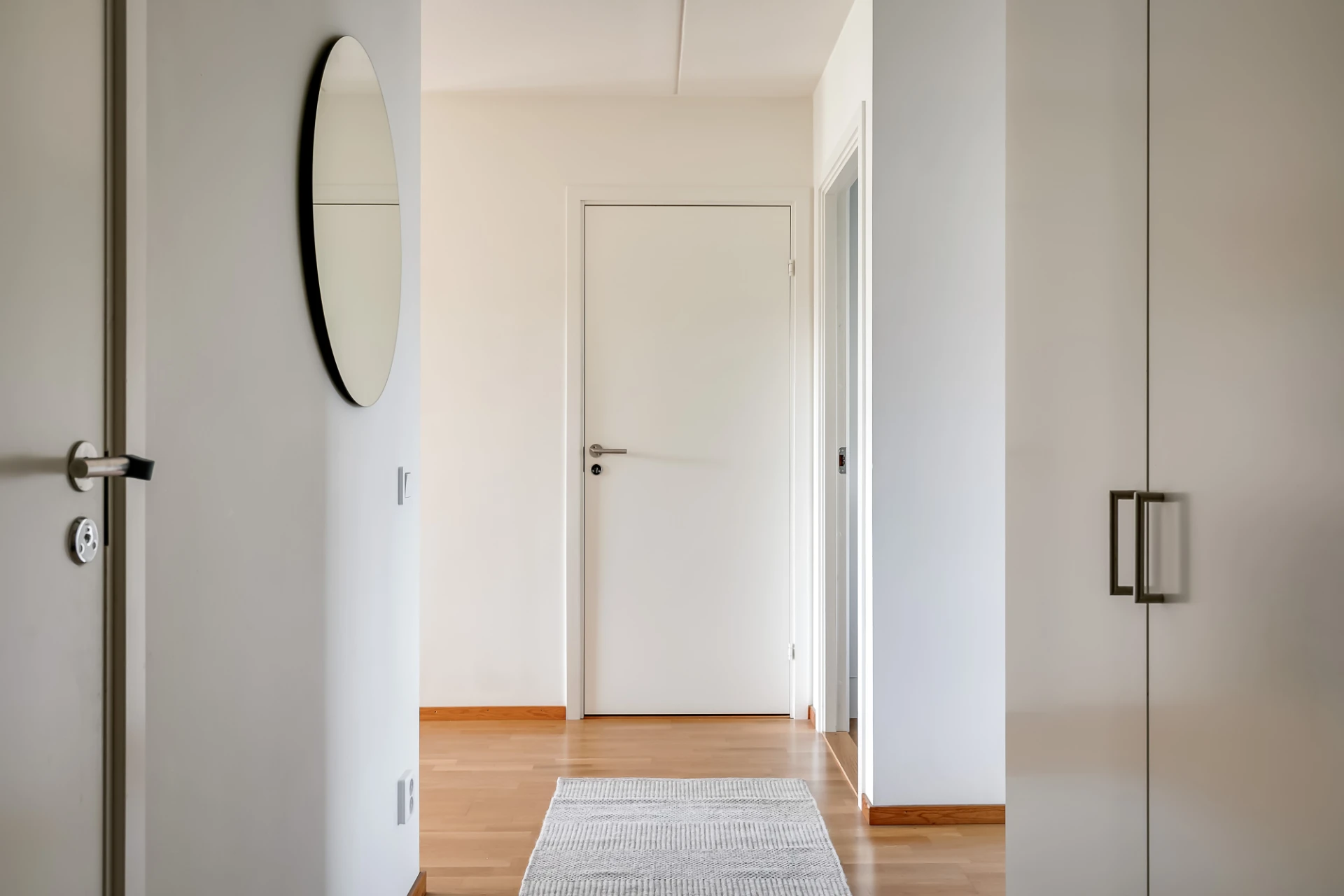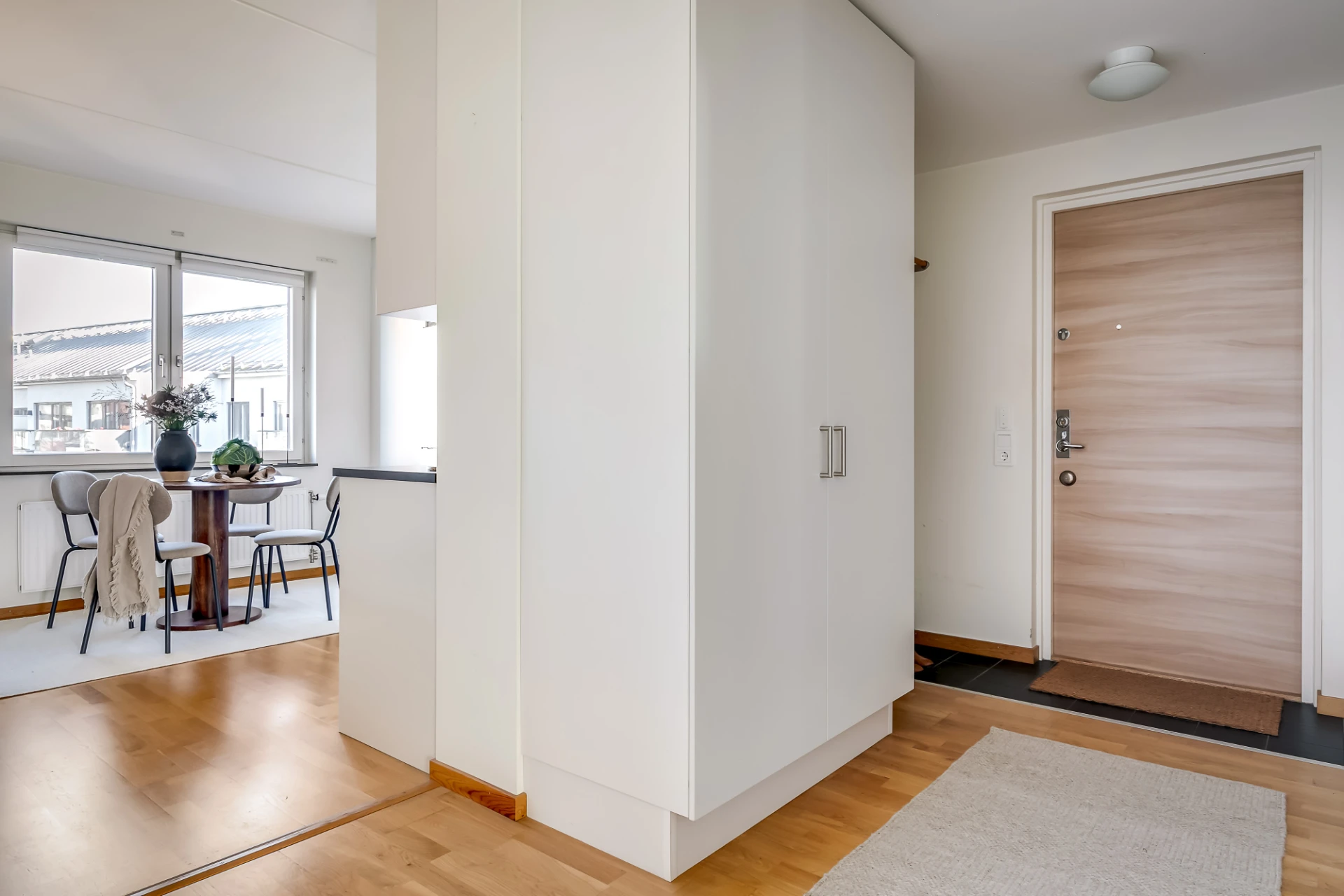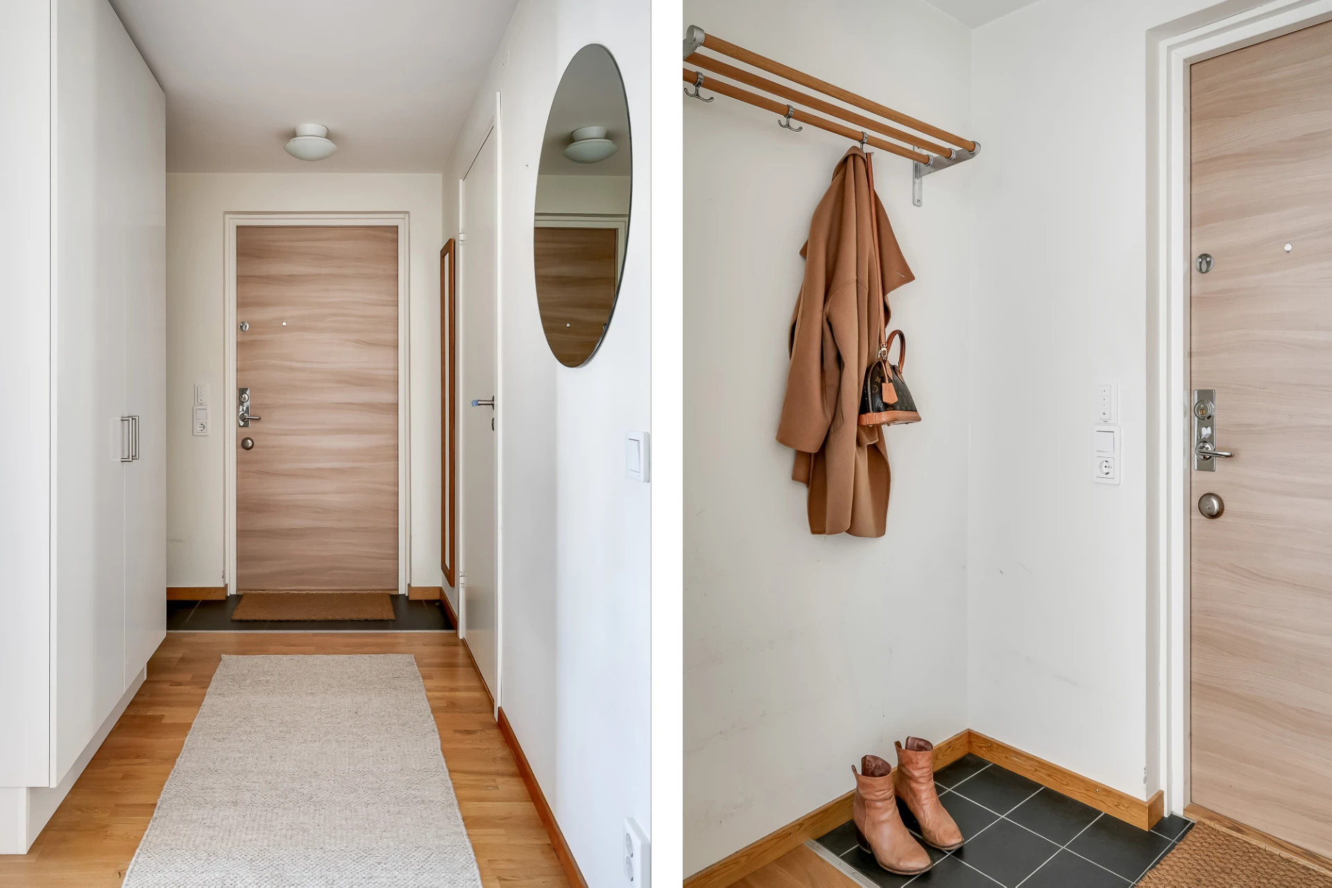 Träfärgad säkerhetsdörr, hatthylla i trä från Essem Design, garderob, vita väggar och svart klinker på golv vid entrén.