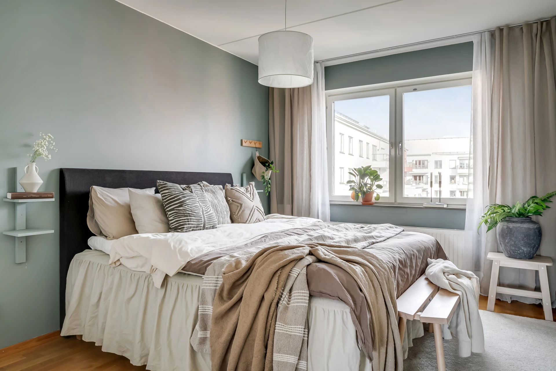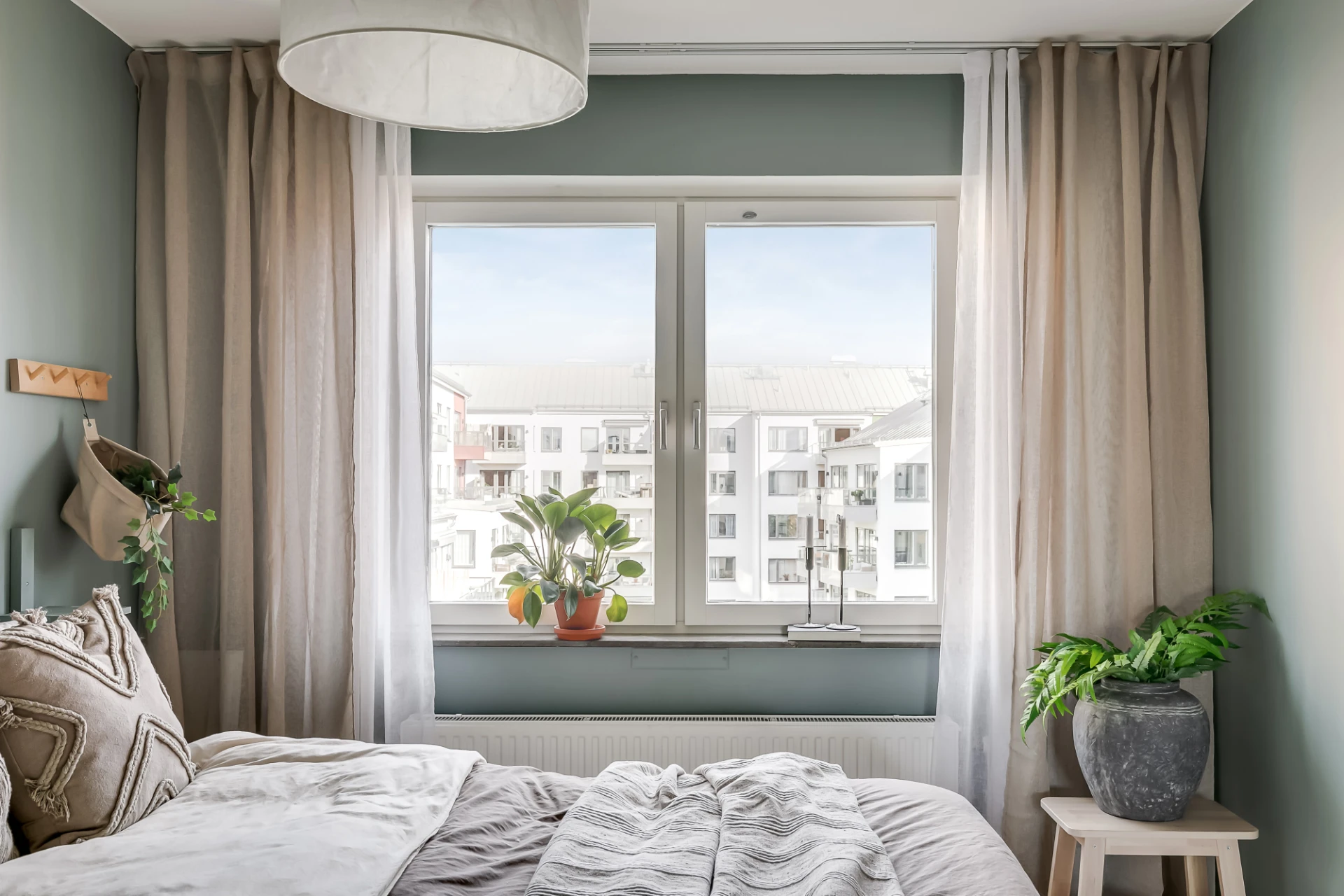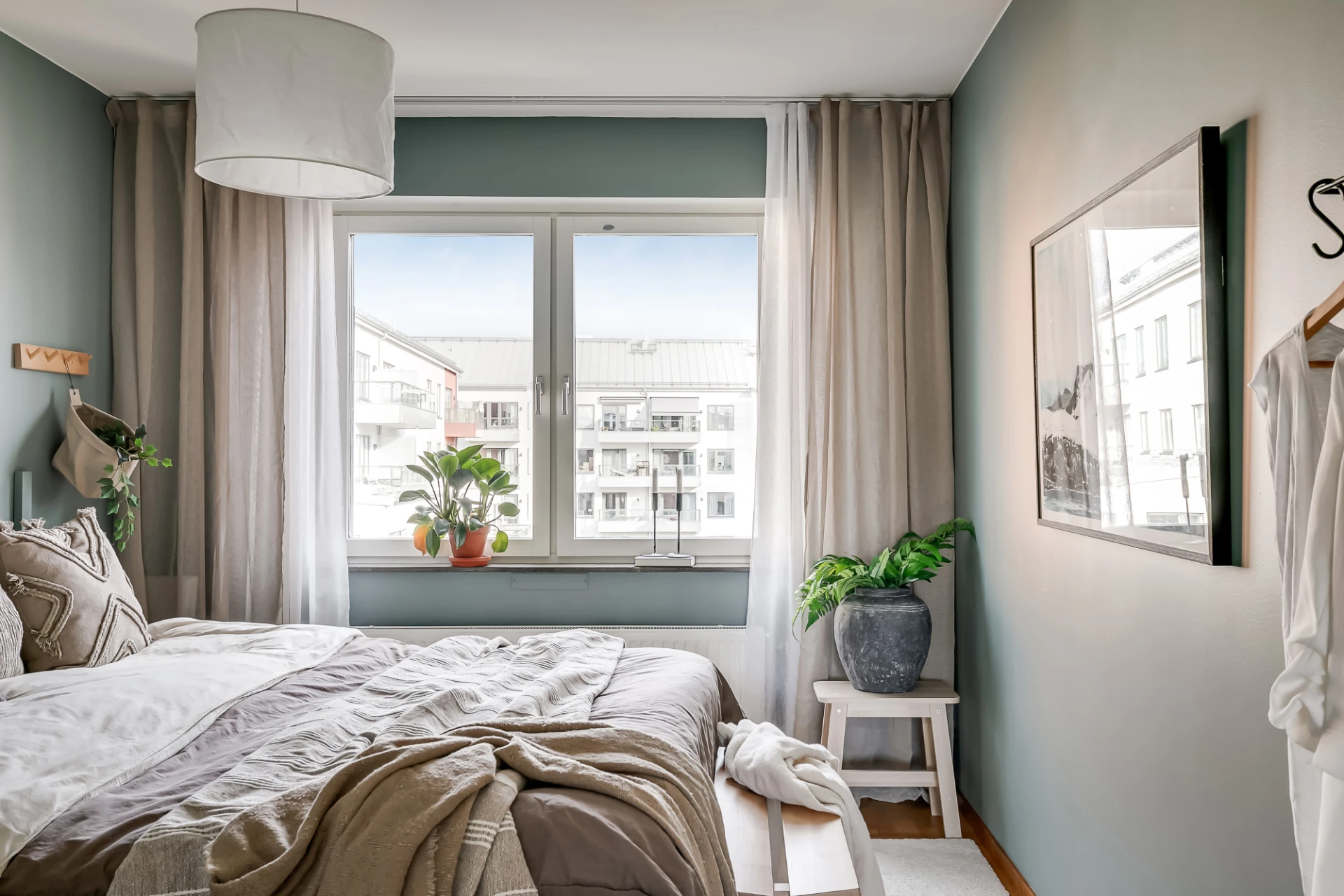 Ett fönster mot Fyrvaktarkroken och granngård. Dubbla takskenor för gardiner, garderob, och väggar i gråblått. Dubbelsäng, nattduksbord, sängbänk och stol ryms.