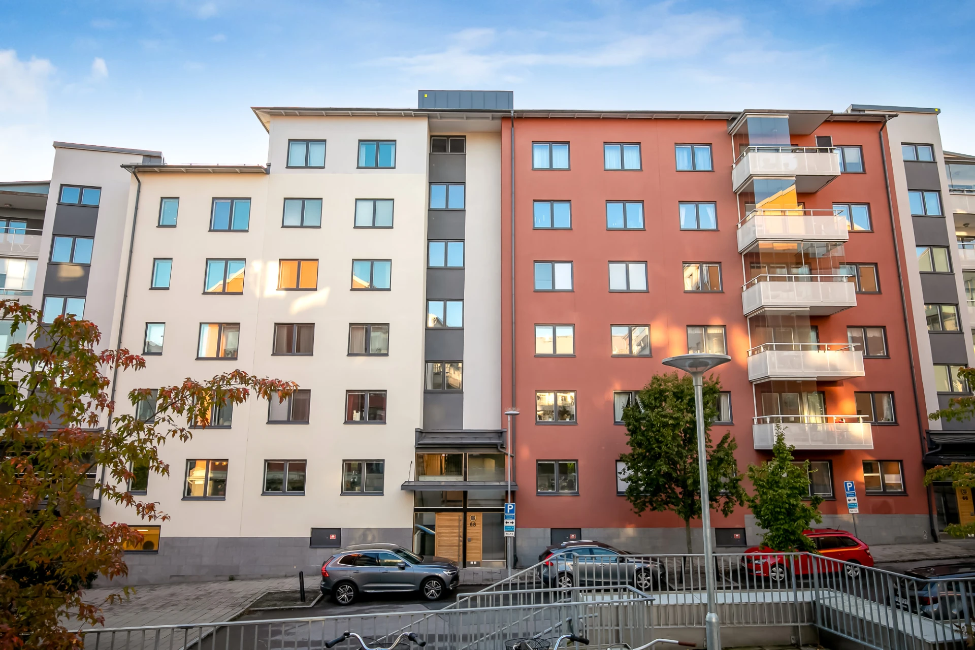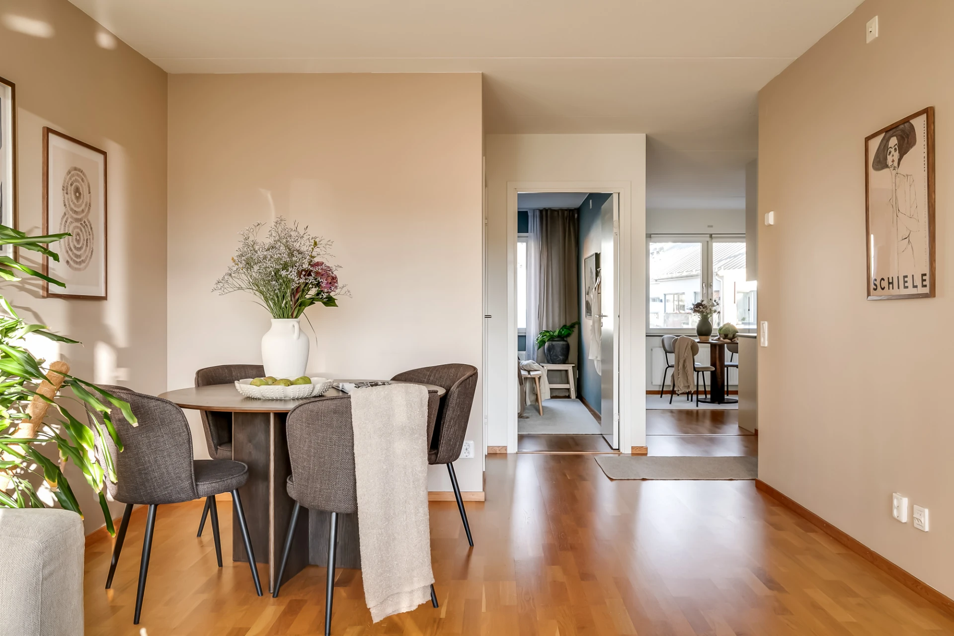 Tvåluftsfönster i nischer med fönsterbänkar i gråbrunmelerad natursten. Alla fönsterpartier inklusive balkongdörr är utrustad med rullgardiner förutom i sovrum. Genomgående planlösning och golv i ekparkett från Kährs, låg golvlist i trä som matchar parketten, släta dörrar, målade väggar samt takhöjd om ca 250 cm. Samtliga vitvaror från Electrolux. All väggfast inredning går i vitt om inget annat anges.