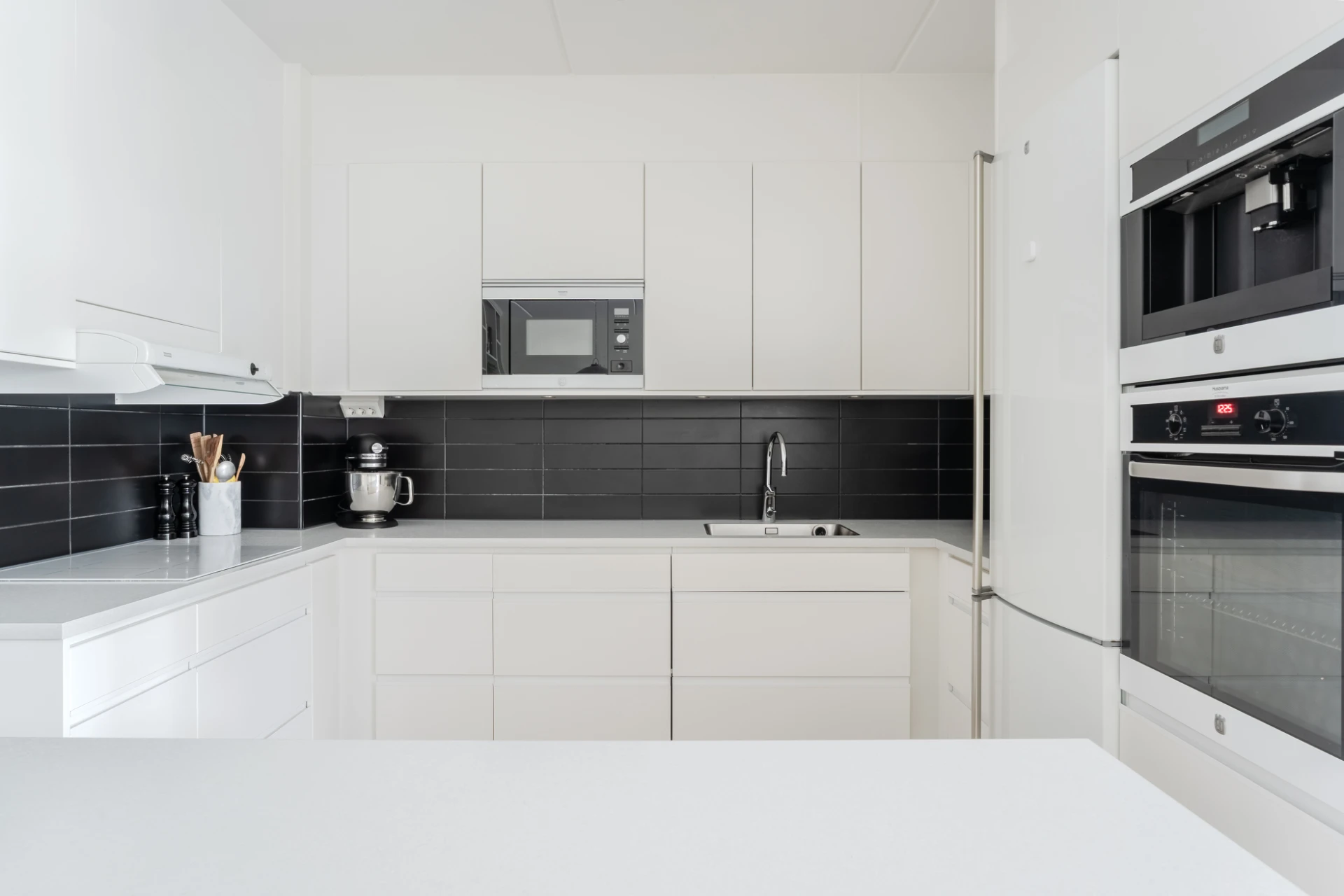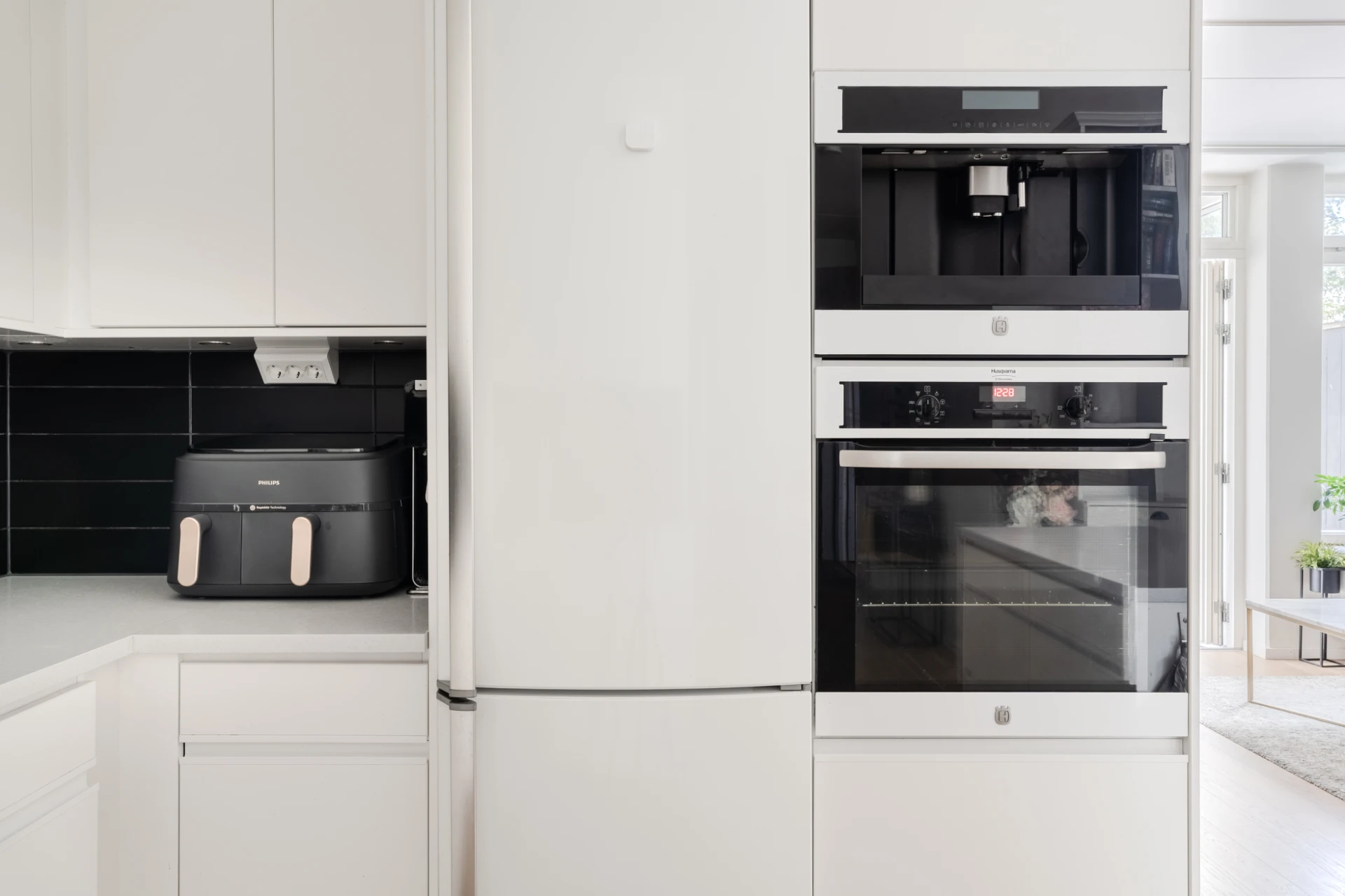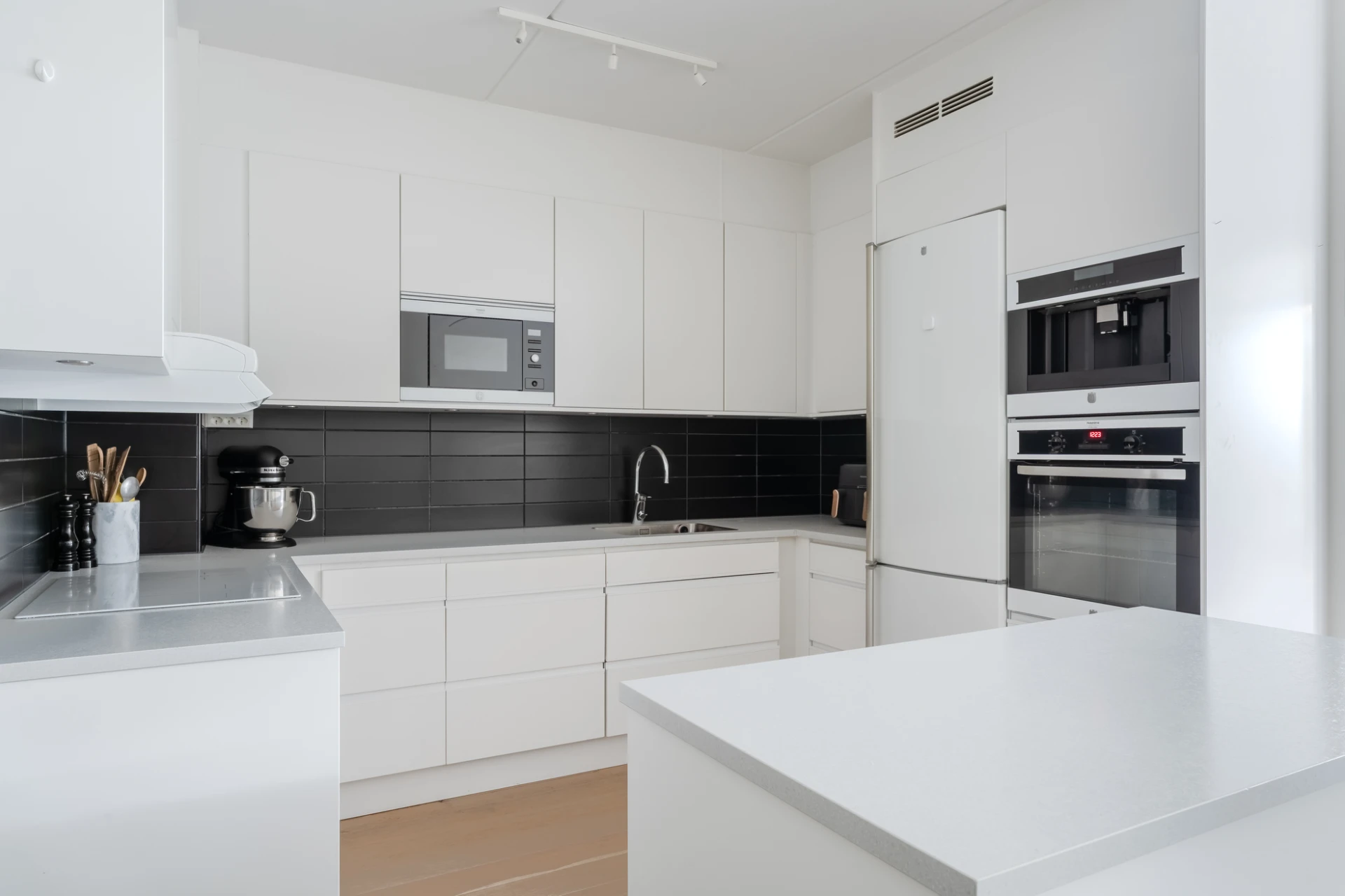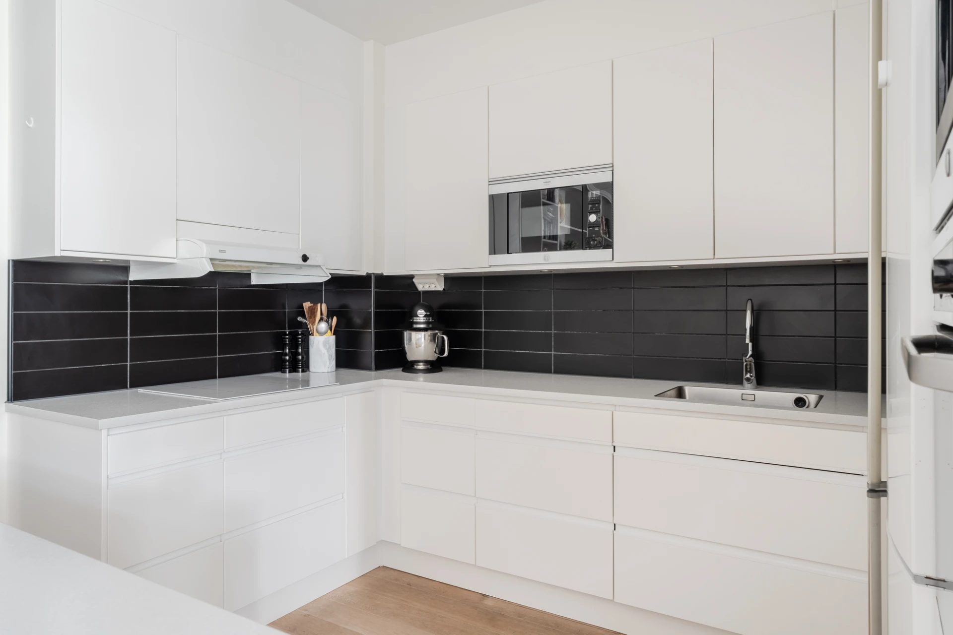 Parkettgolv och ljusmålade väggar. Vit köksinredning från Vedum med svart kakel ovan bänkskivan. Den maskinella köksutrustningen består av kombinerad kyl/frys, induktionshäll, fläkt, inbyggd ugn, inbyggd mikro samt diskmaskin. Intill köket finns plats för ett större matbord.