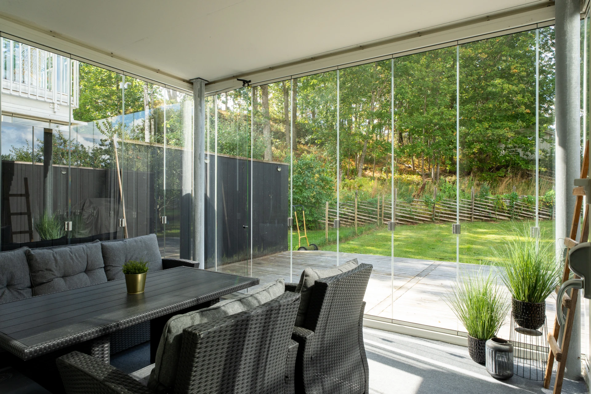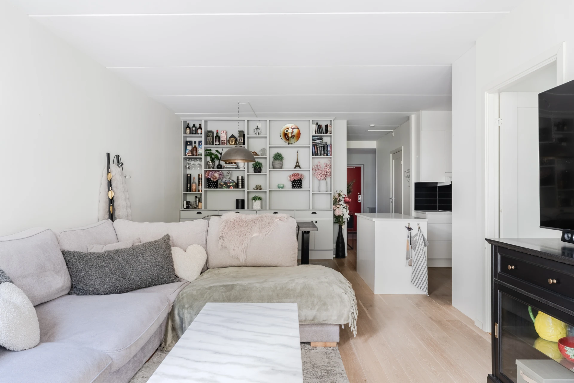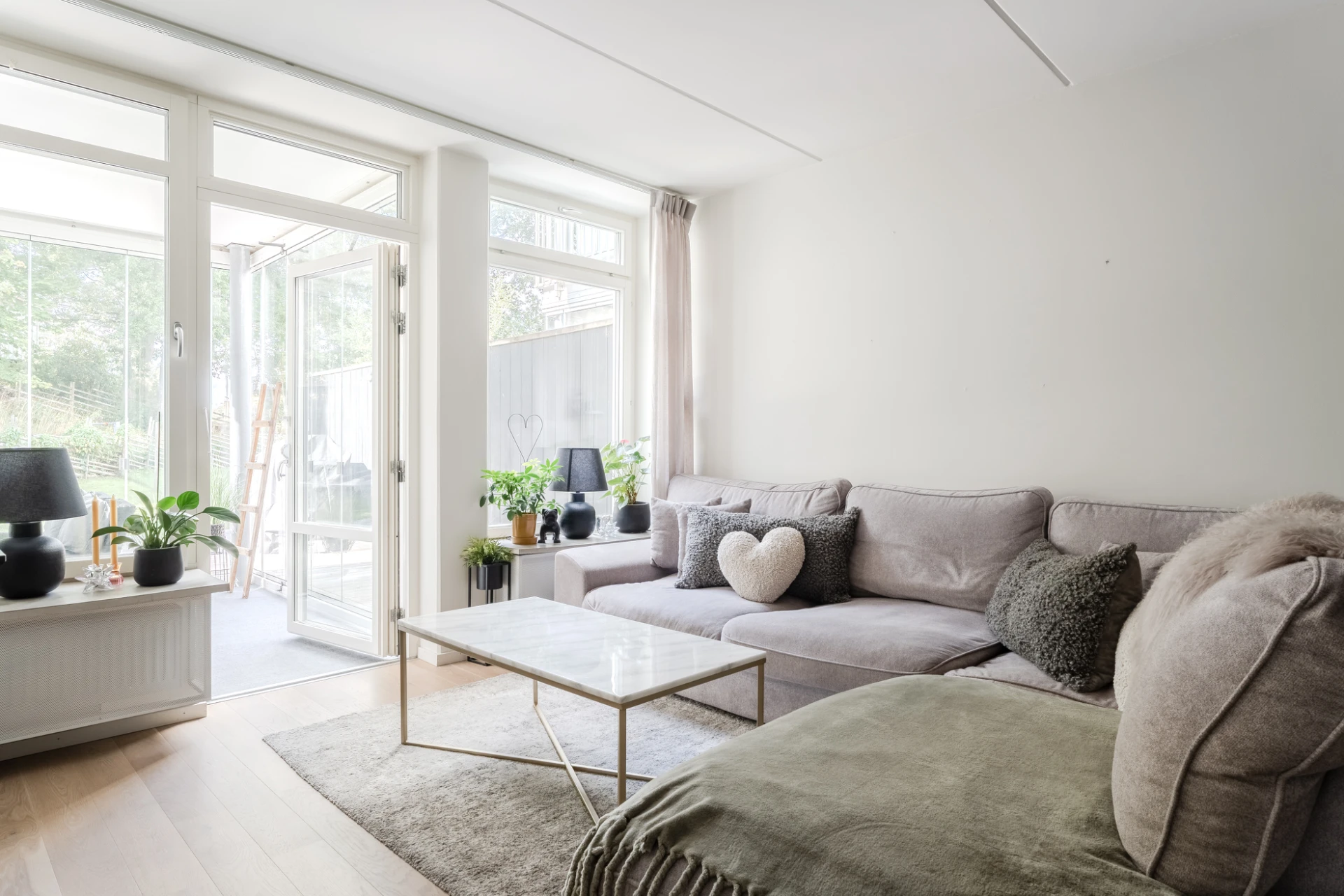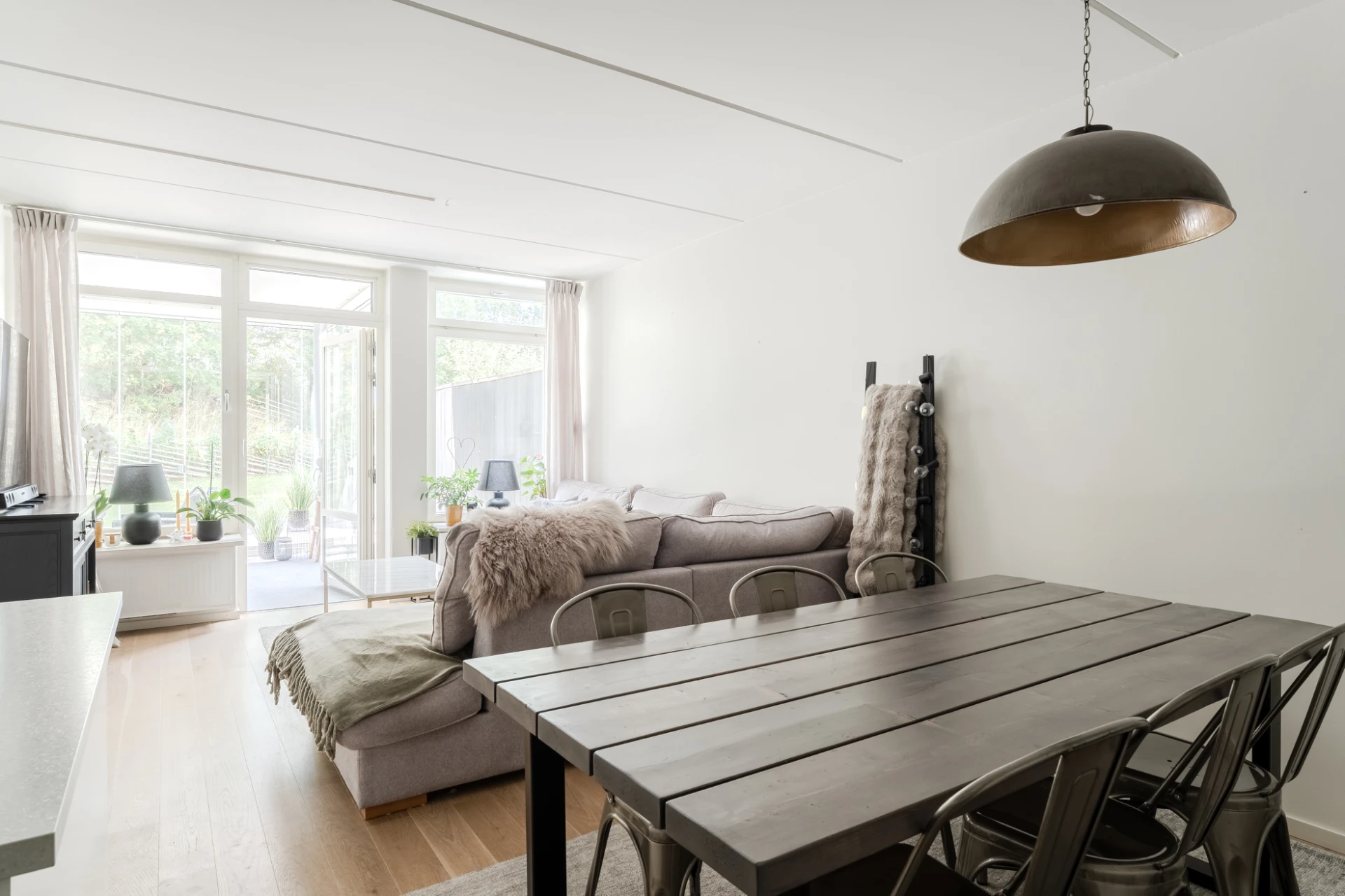 Ljut parkettgolv och ljusmålade väggar. Plats för soffgrupp och övrigt möblemang. Från vardagsrummet nås bostadens inglasade uterum och gräsmatta.