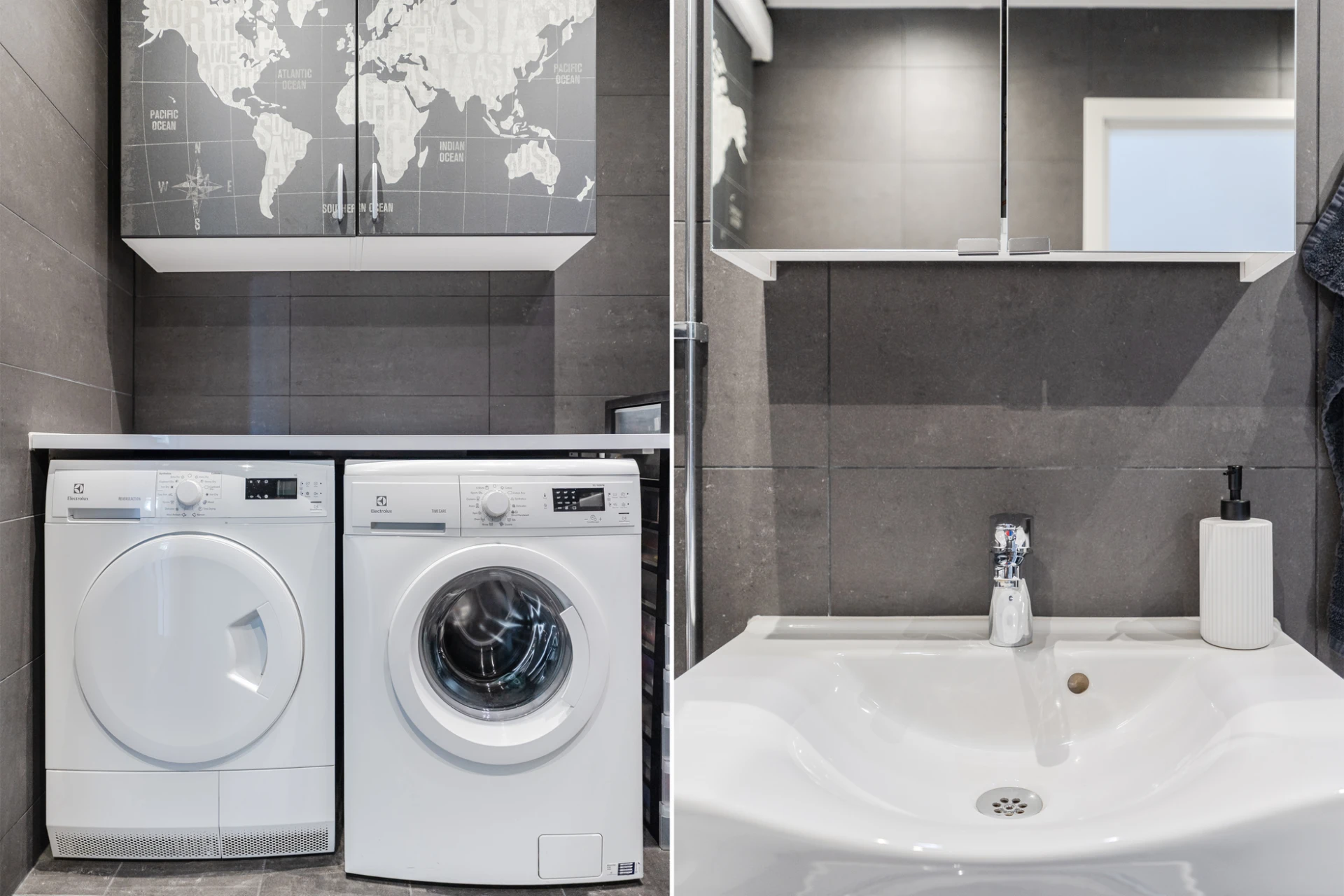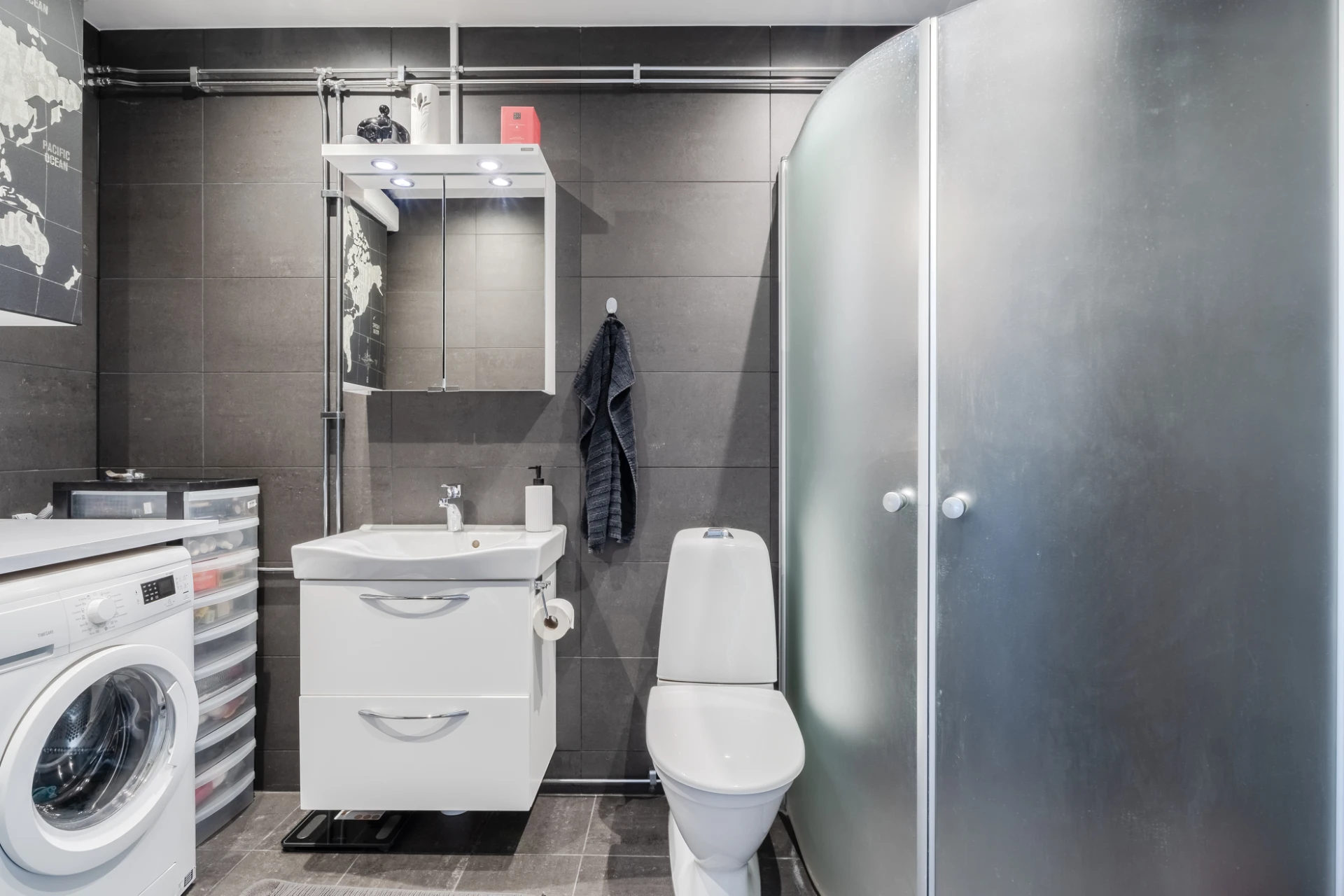 Svart klinkergolv med golvvärme (elburen) oh helkaklade väggar i svart. Här finns wc, handfat med kommod, spegelskåp och dusch med vikbara glasdörrar. Badrummet är även utrustat med tvättmaskin och torktumlare.