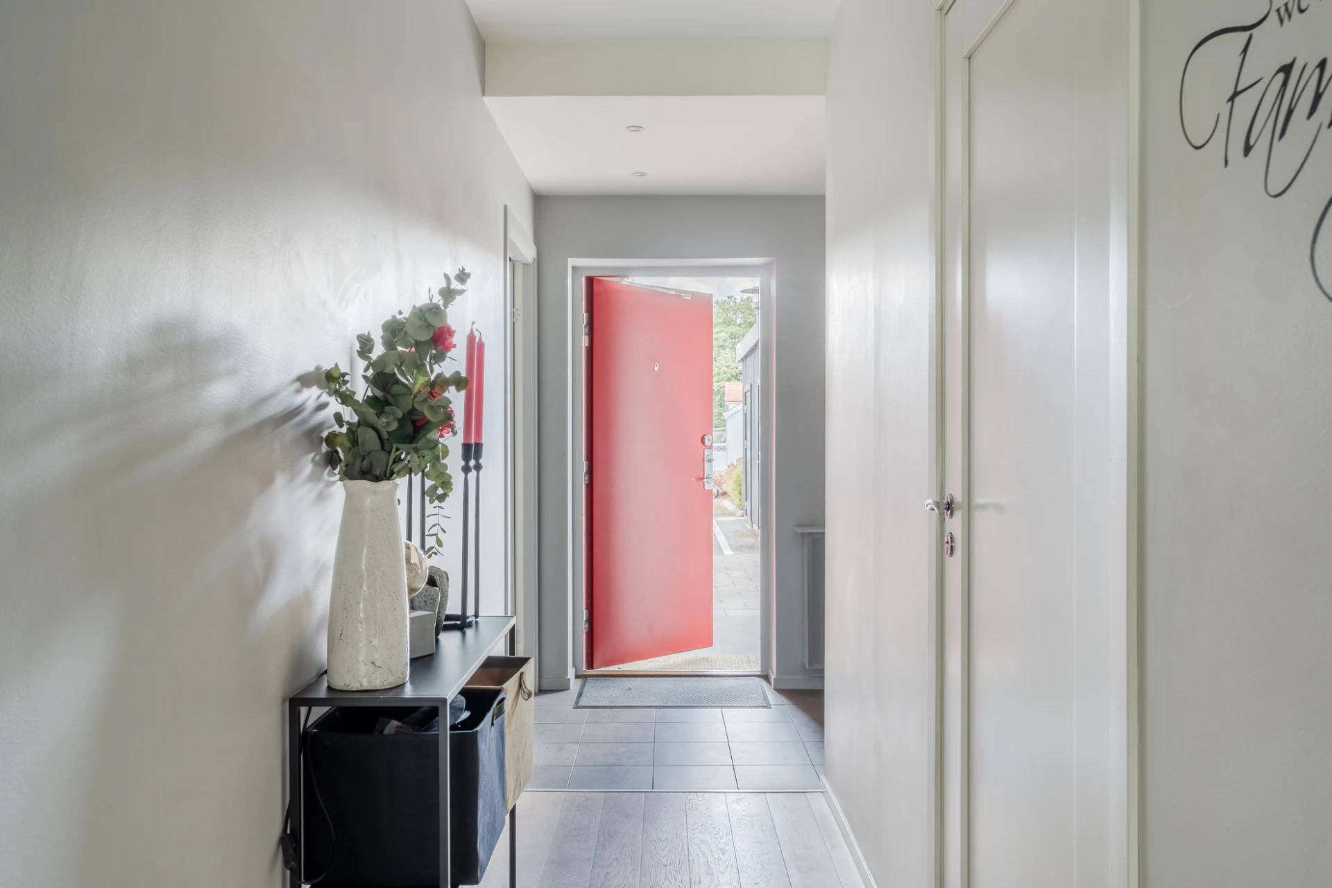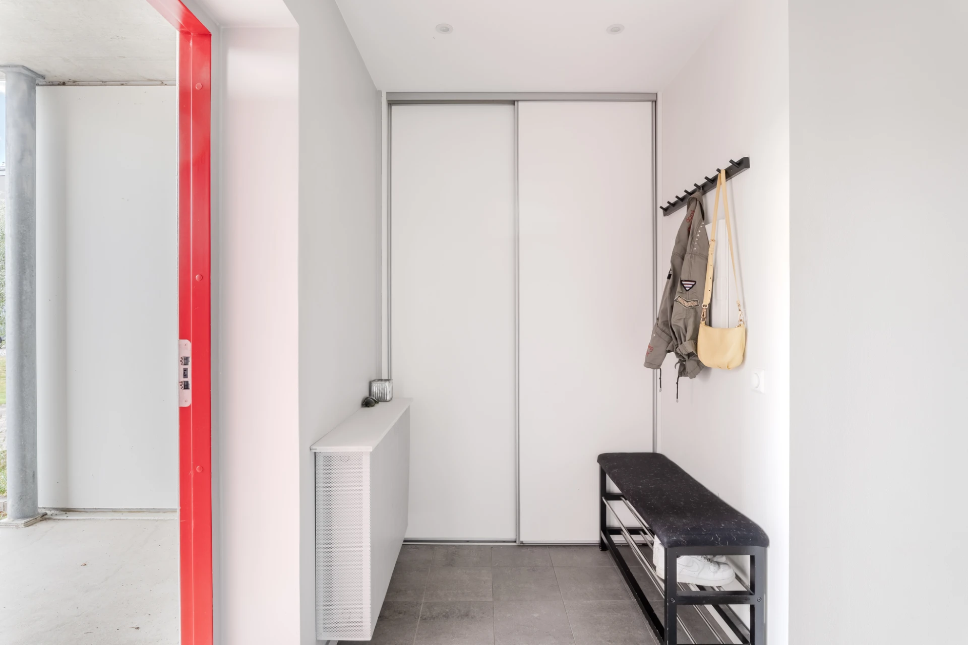 Grått klinkergolv och ljusa väggar. Här finns gott om avhängning i en platsbyggd garderob med skjutdörrar. I taket sitter infällda spotlights.