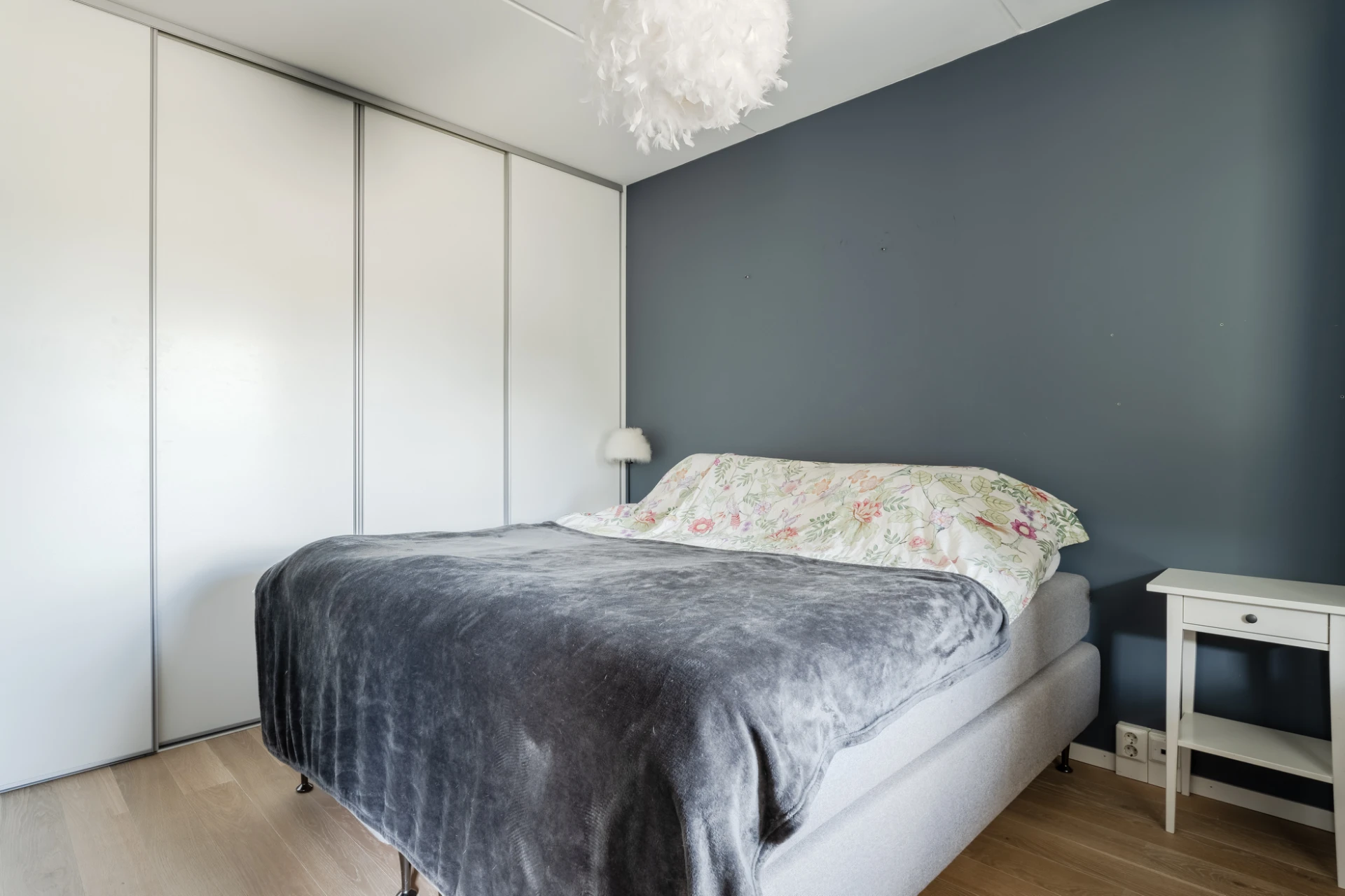 Parkettgolv och väggar målade i mörkblå ton. Plats för dubbelsäng och tillhörande möblemang. En garderobsvägg ger plats för kläder och tillhörigheter.