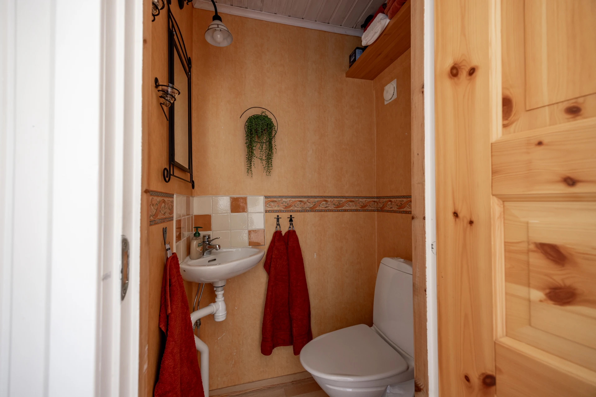 Parkettgolv och tapetserade väggar. Här finns wc, handfat och spegel.