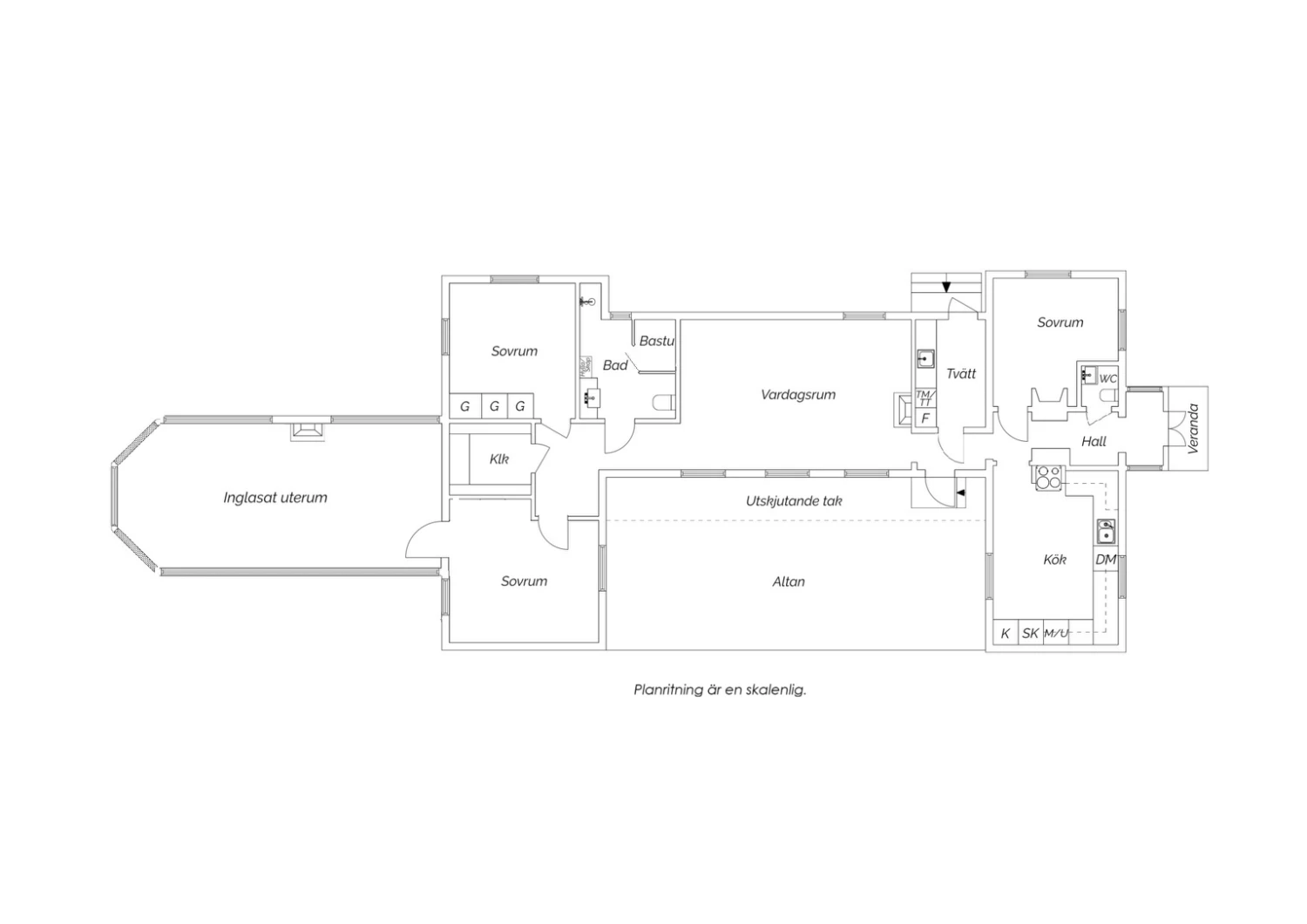 Ventilation: Frånluftsfläkt i badrum och tvättstuga samt ventiler i alla rum.