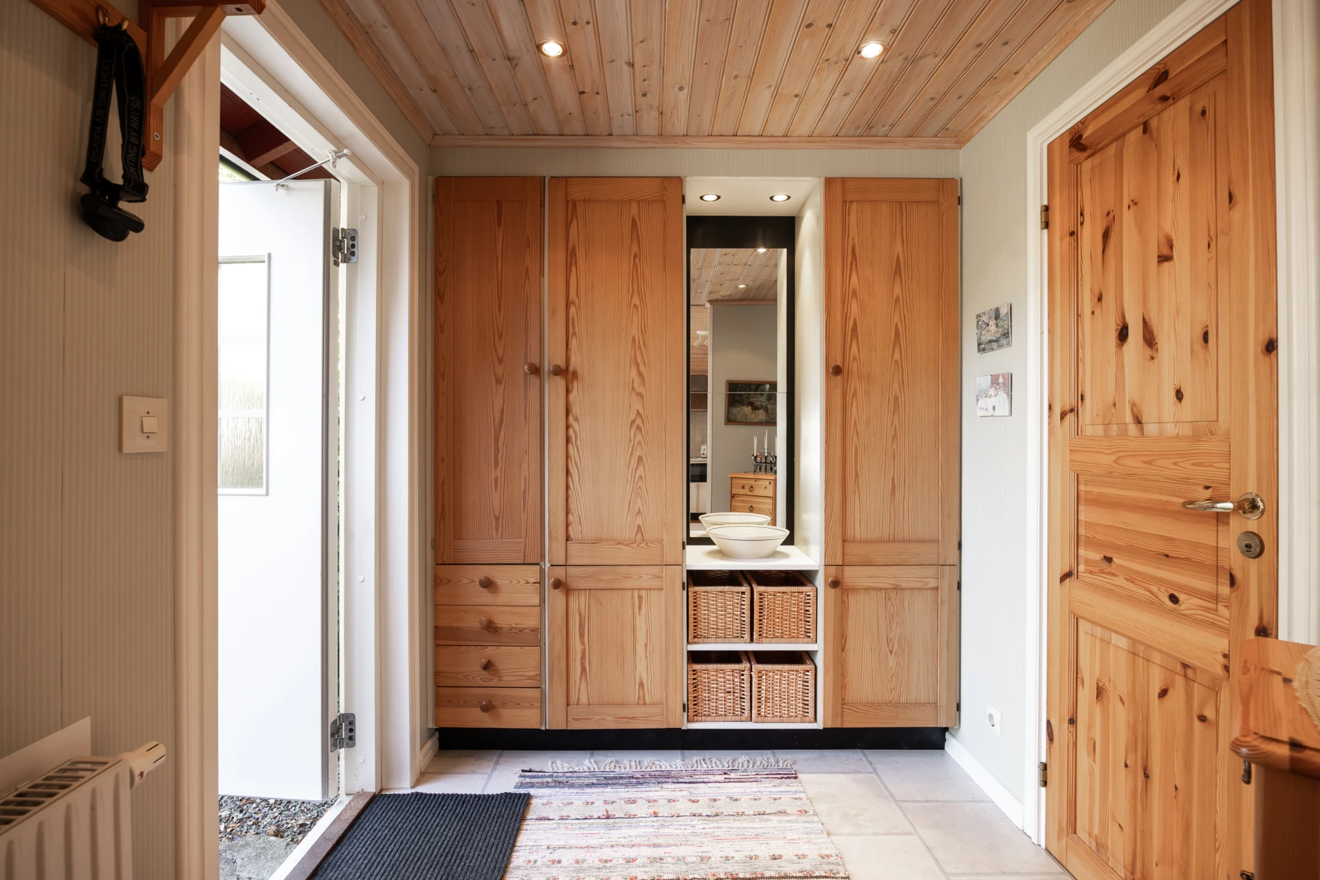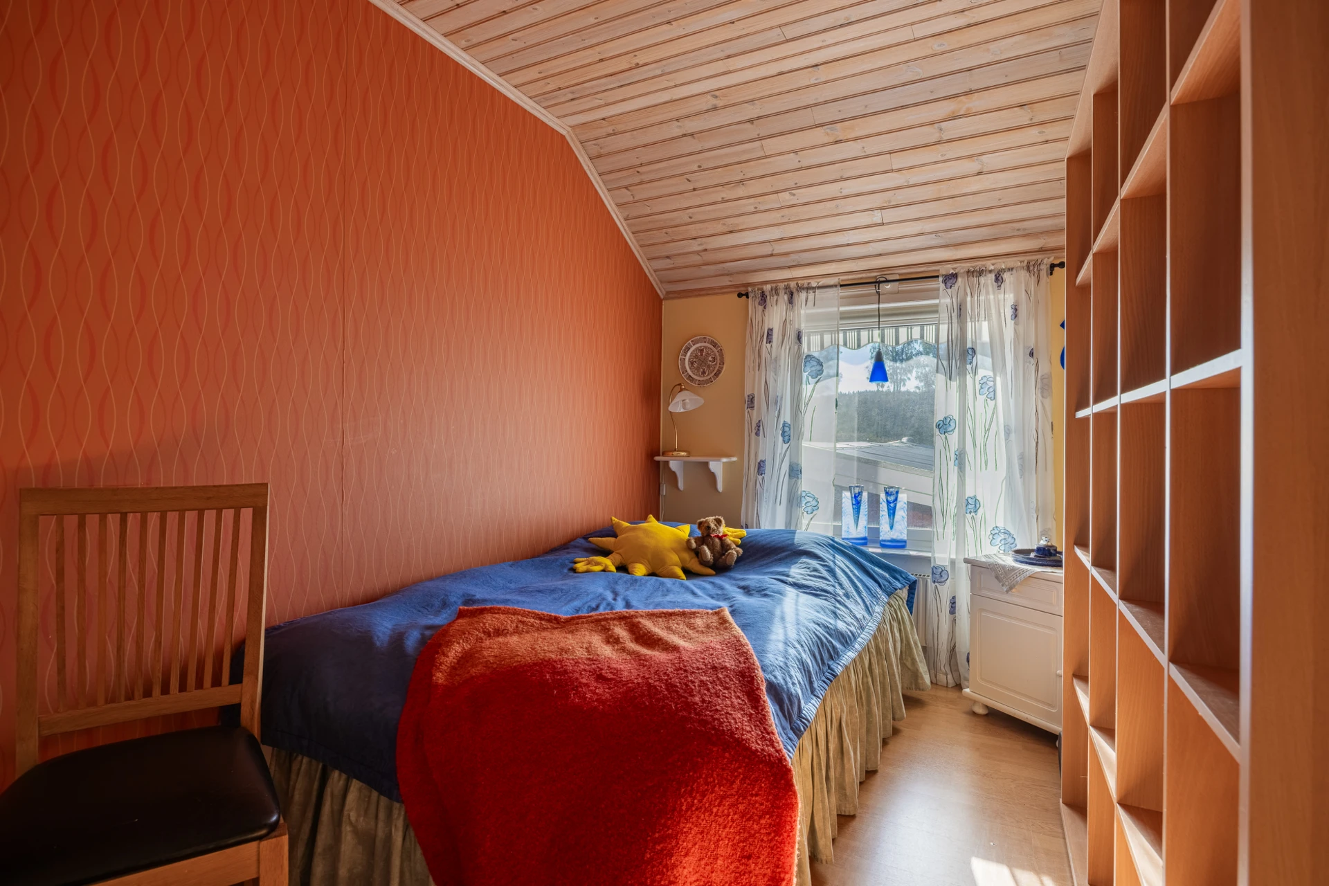 Parkettgolv med golvvärme och tapetserade väggar. En garderobsvägg med spegelskjutdörrar ger gott om plats för kläder och tillhörigheter.