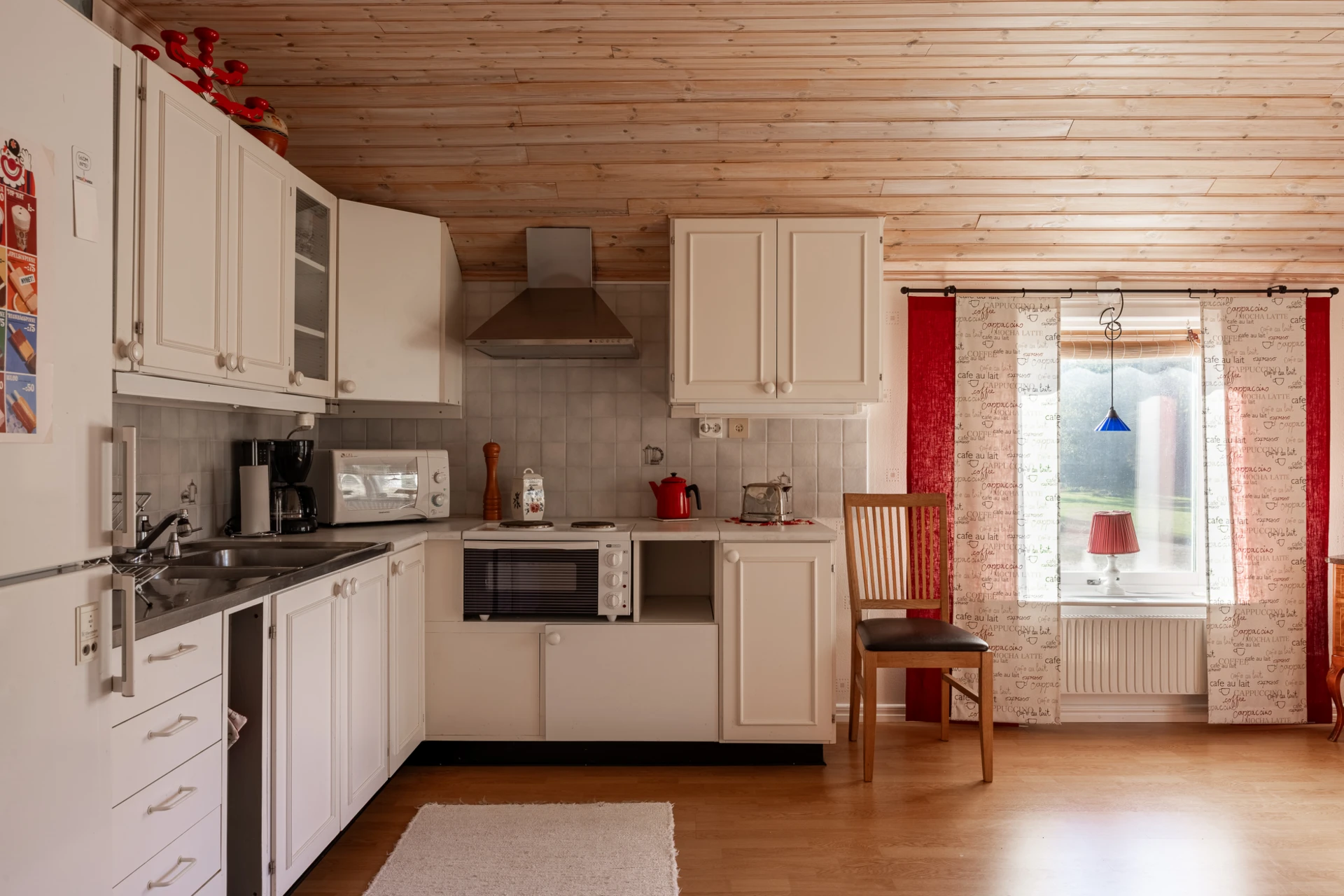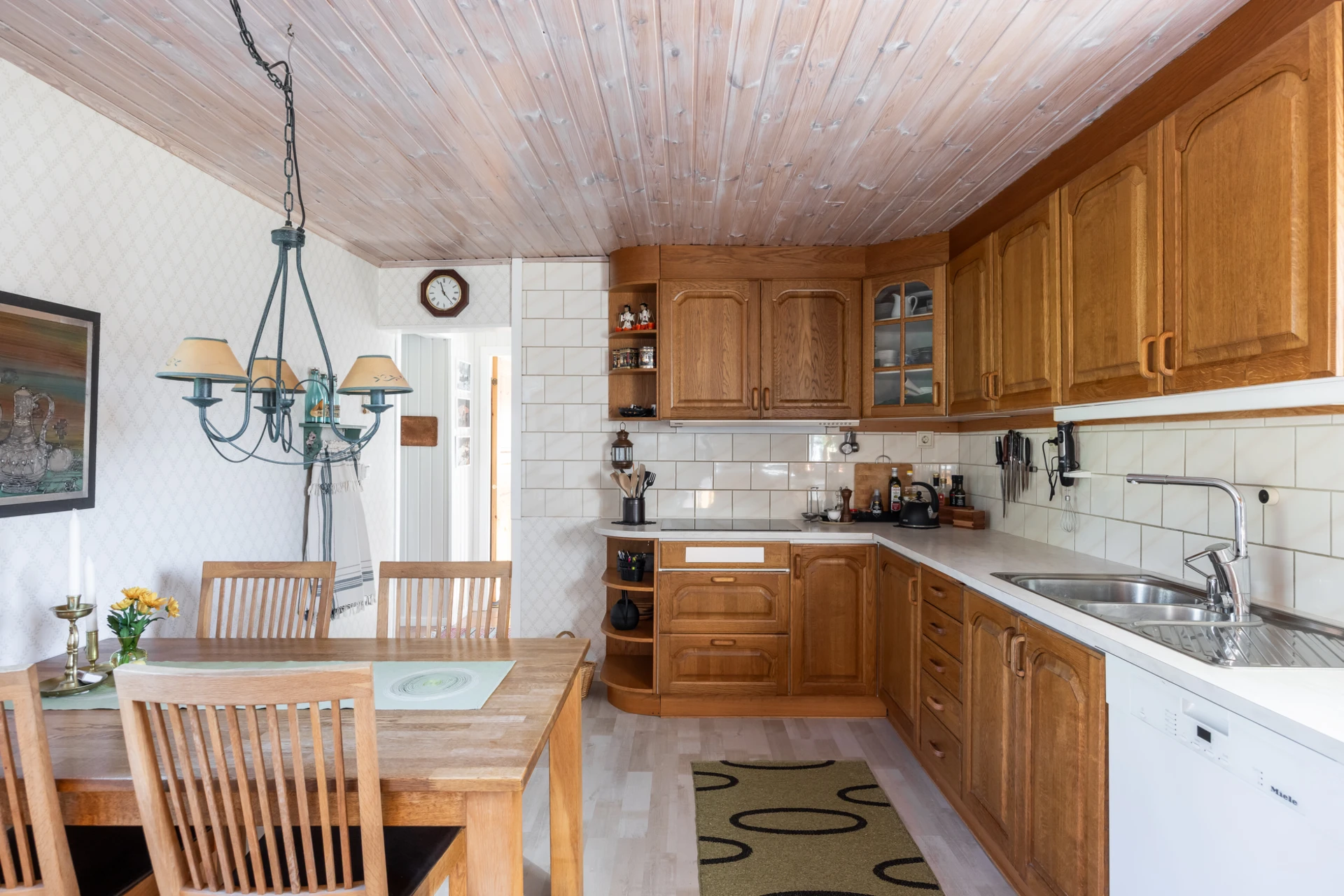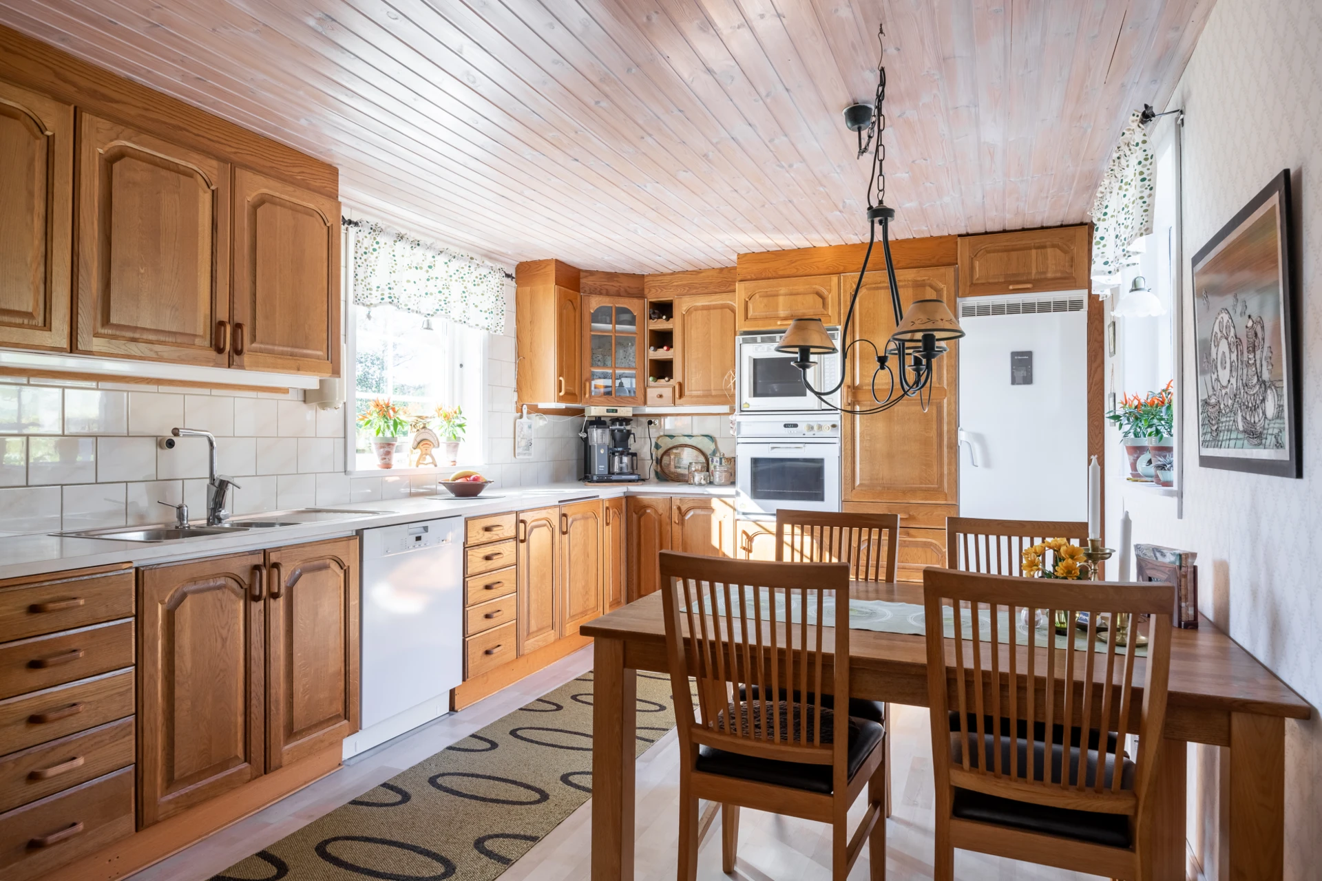Laminatgolv med golvvärme och tapetserade väggar. Köksinredning i ek från Marbodal med vitt kakel ovan bänkskivan i laminat. Den maskinella utrustningen består av kyl i fullhöjd (frys i fullhöjd finns belägen i tvättstugan), induktionshäll, fläkt (Gaggenau -2025), inbyggd ugn, inbyggd mikro samt diskmaskin (Miele -2017). Köket har gott om både arbetsytor och förvaringsutrymmen. Intill fönstret ryms ett matbord.