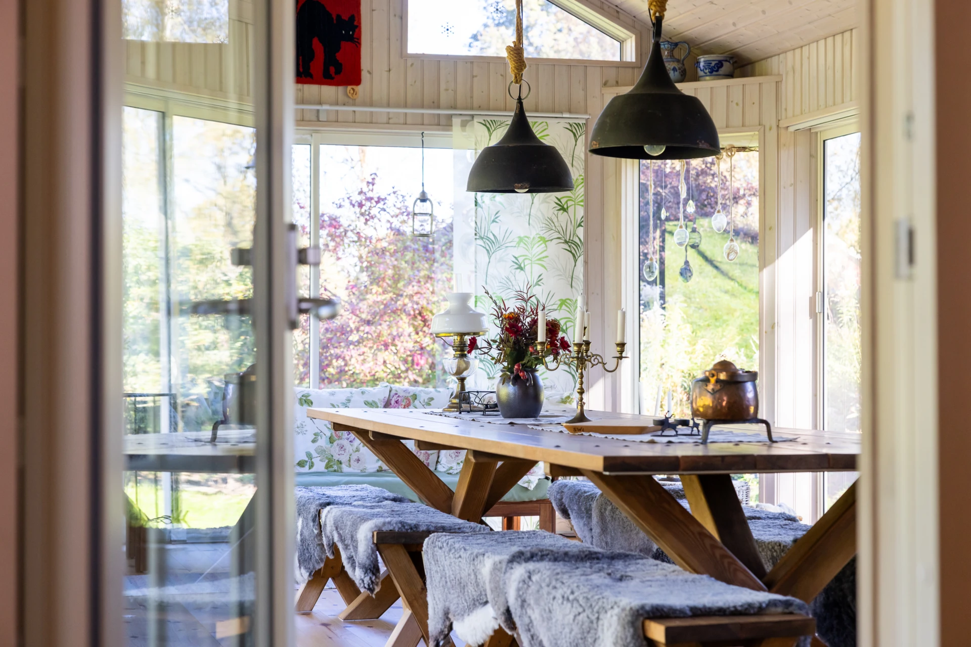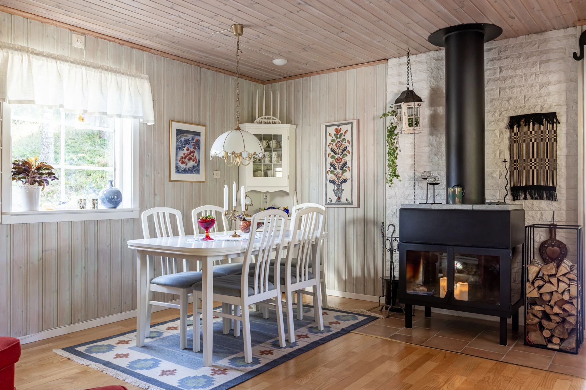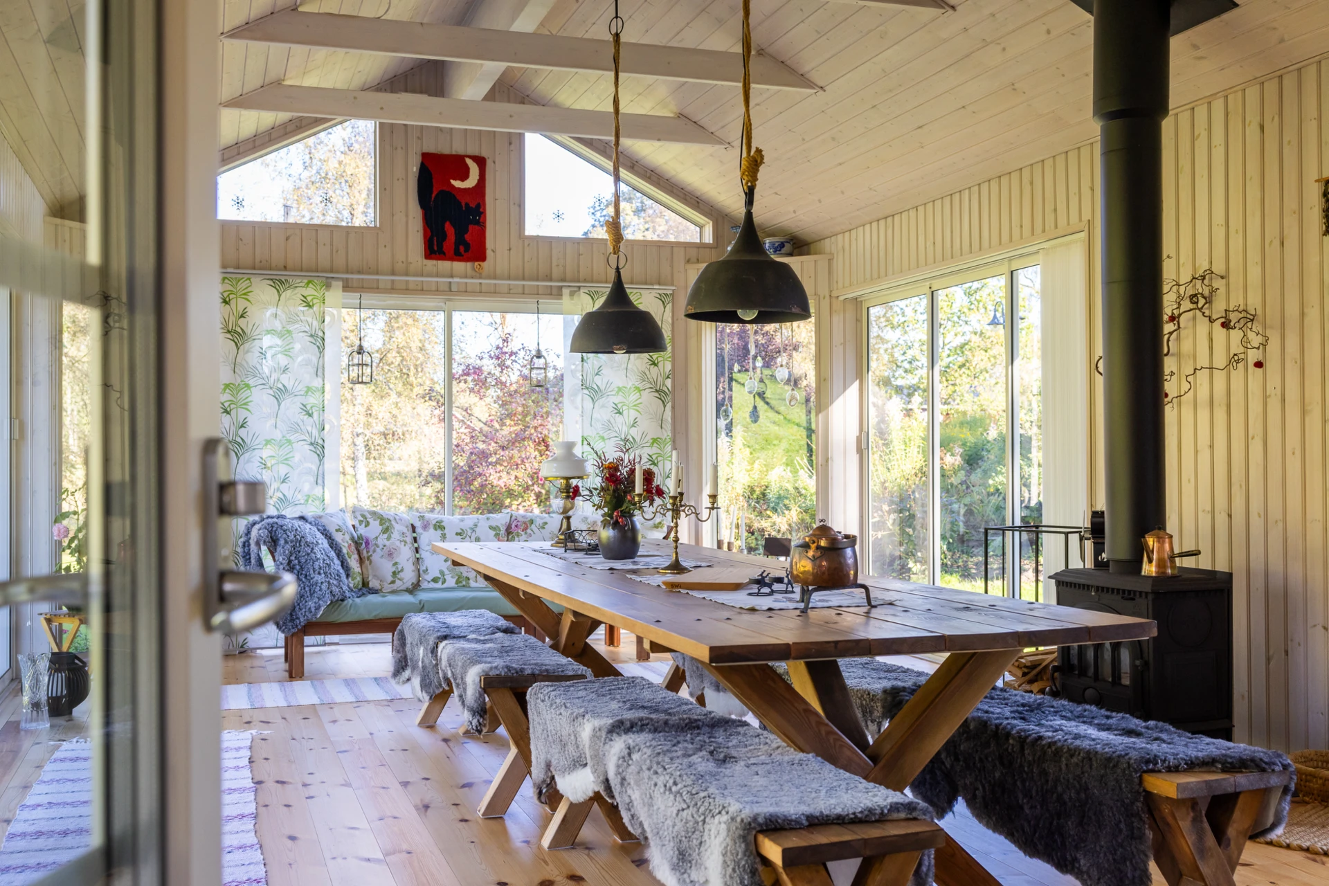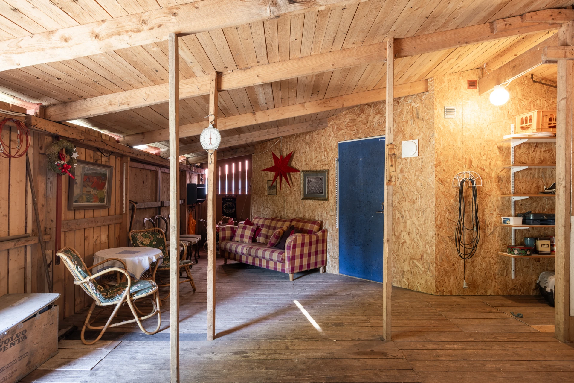Isolerat uterum om ca 36 med trägolv och väggar med träpanel. Här ryms både matsalsgrupp och övrigt möblemang. En braskamin ger värme och ljus, här finns även luftvärmepump.