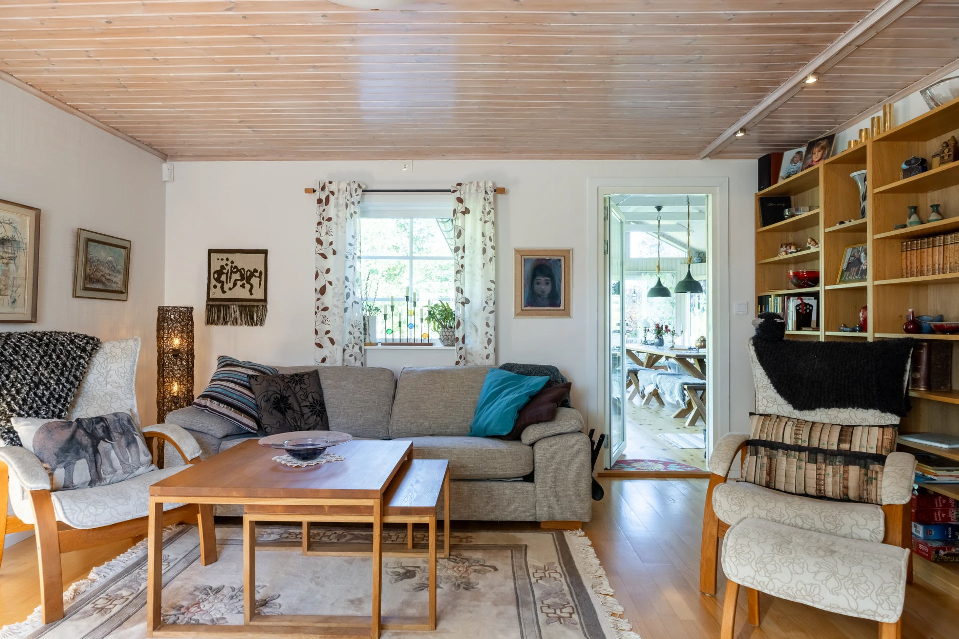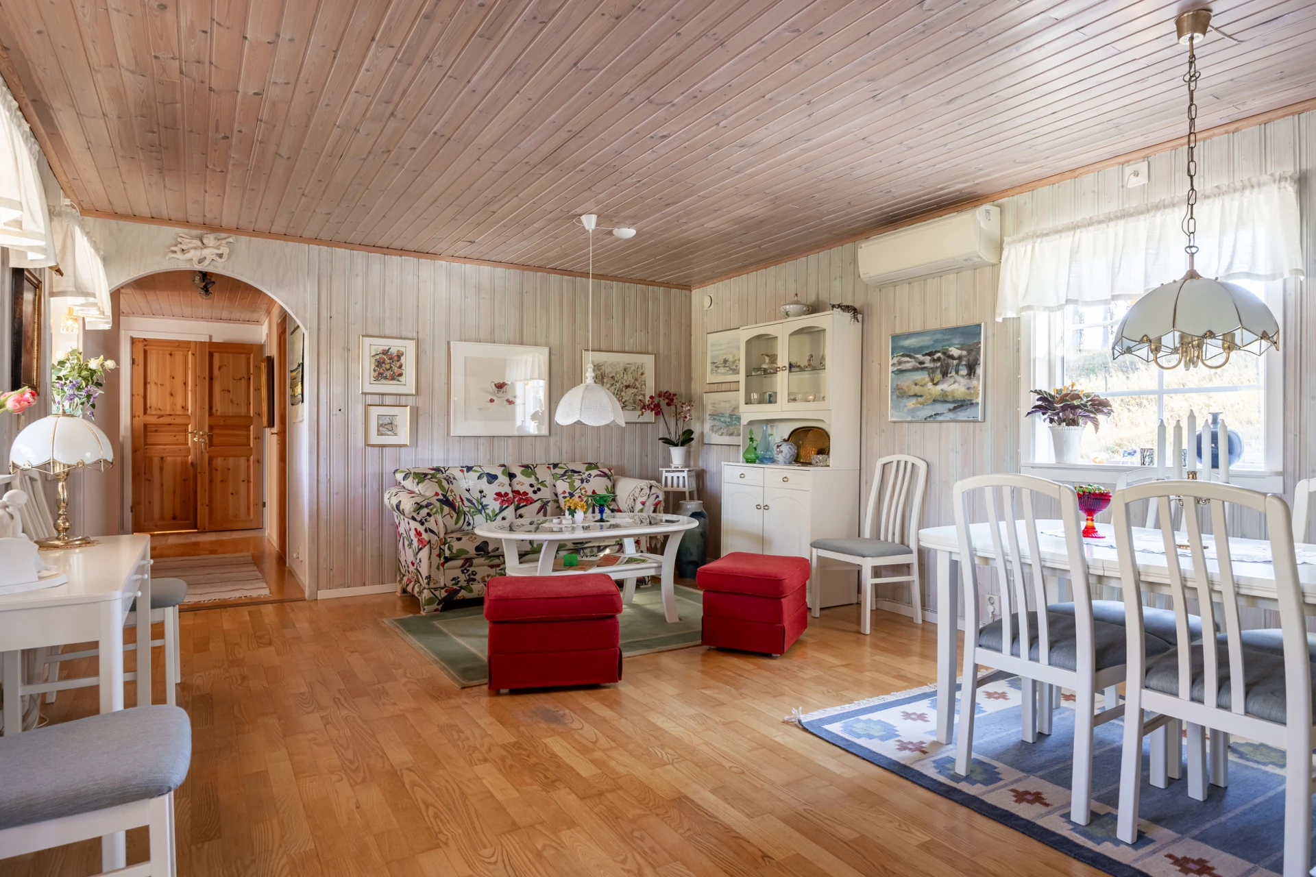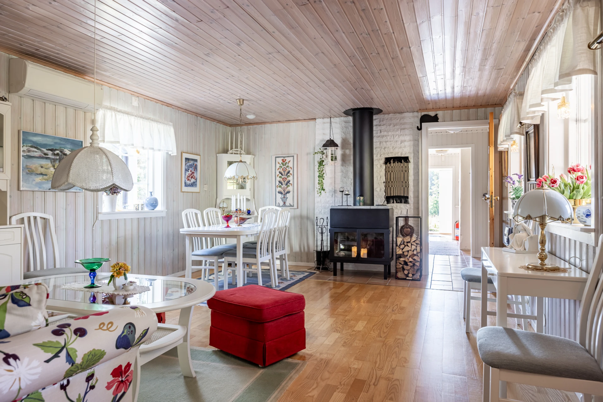 Parkettgolv med golvvärme och väggar klädda med ljus träpanel. Plats för soffgrupp och övrigt möblemang. En eldstad skänker värme och ljus. Från vardagsrummet nås bostadens altan.