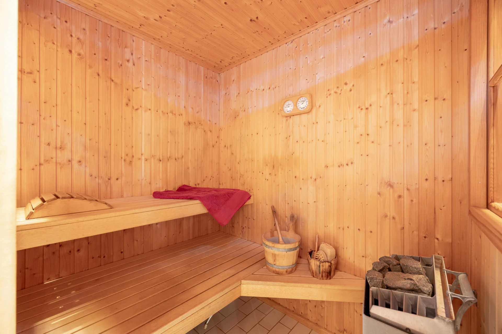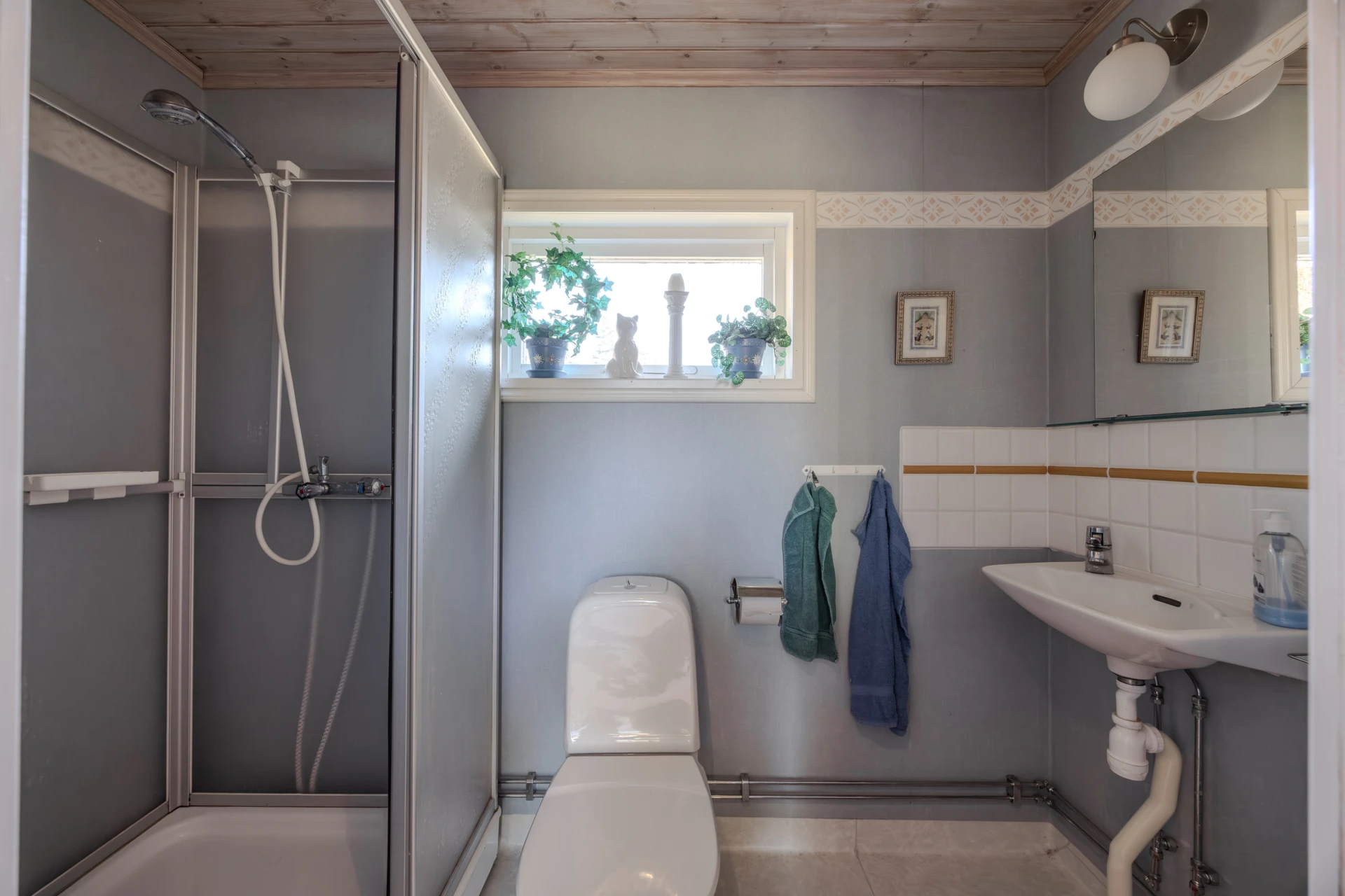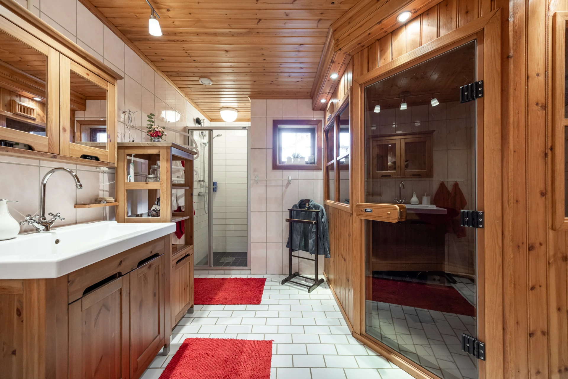 Klinkergolv med golvvärme och helkaklade väggar. Här finns vägghängd wc, handfat med kommod, spegelskåp, dusch samt handdukstork. Badrummet har även bastu.