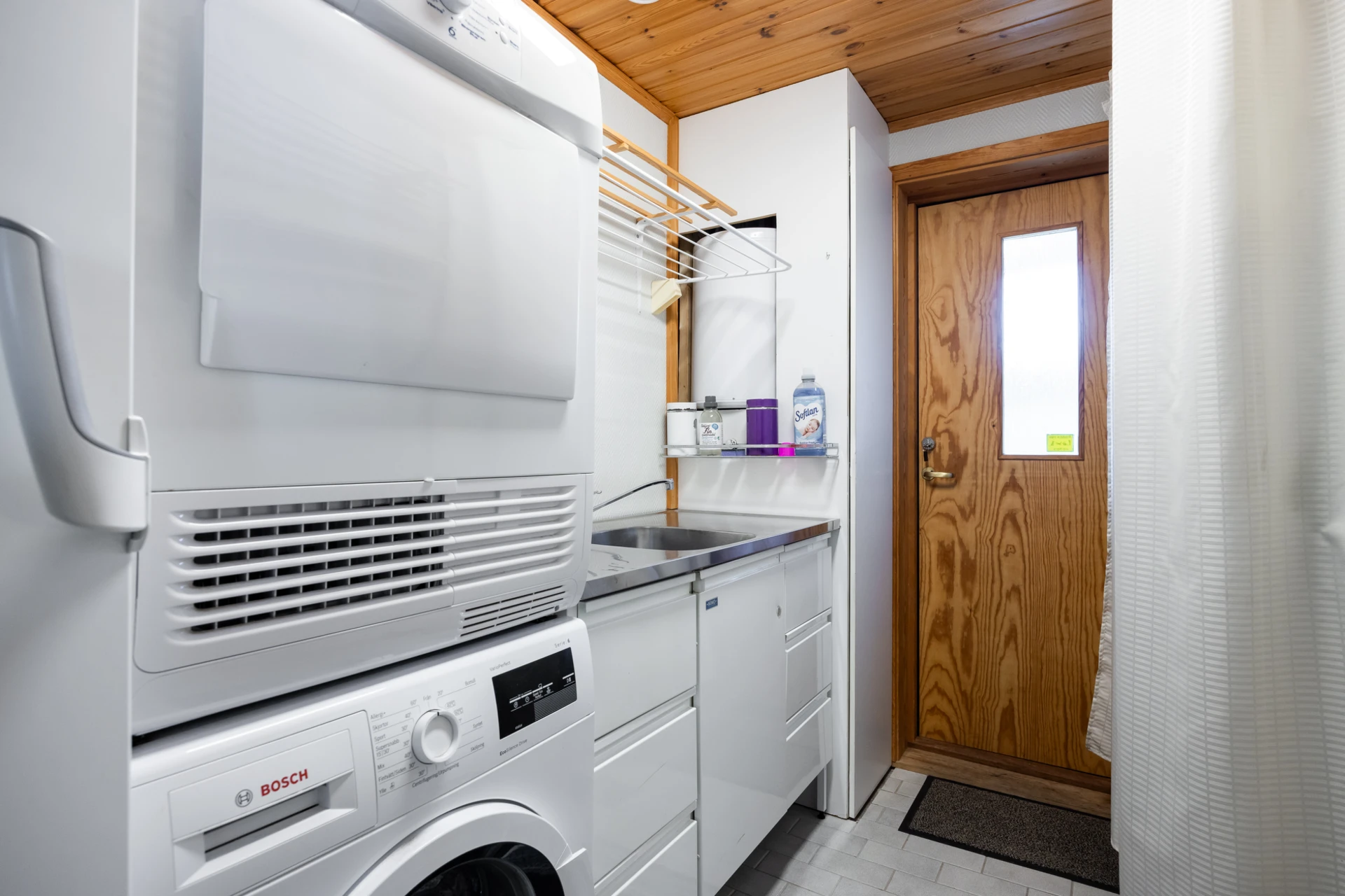 Tvättstuga med groventré, utrustad med tvättmaskin (-2017) och torktumlare (-2010).