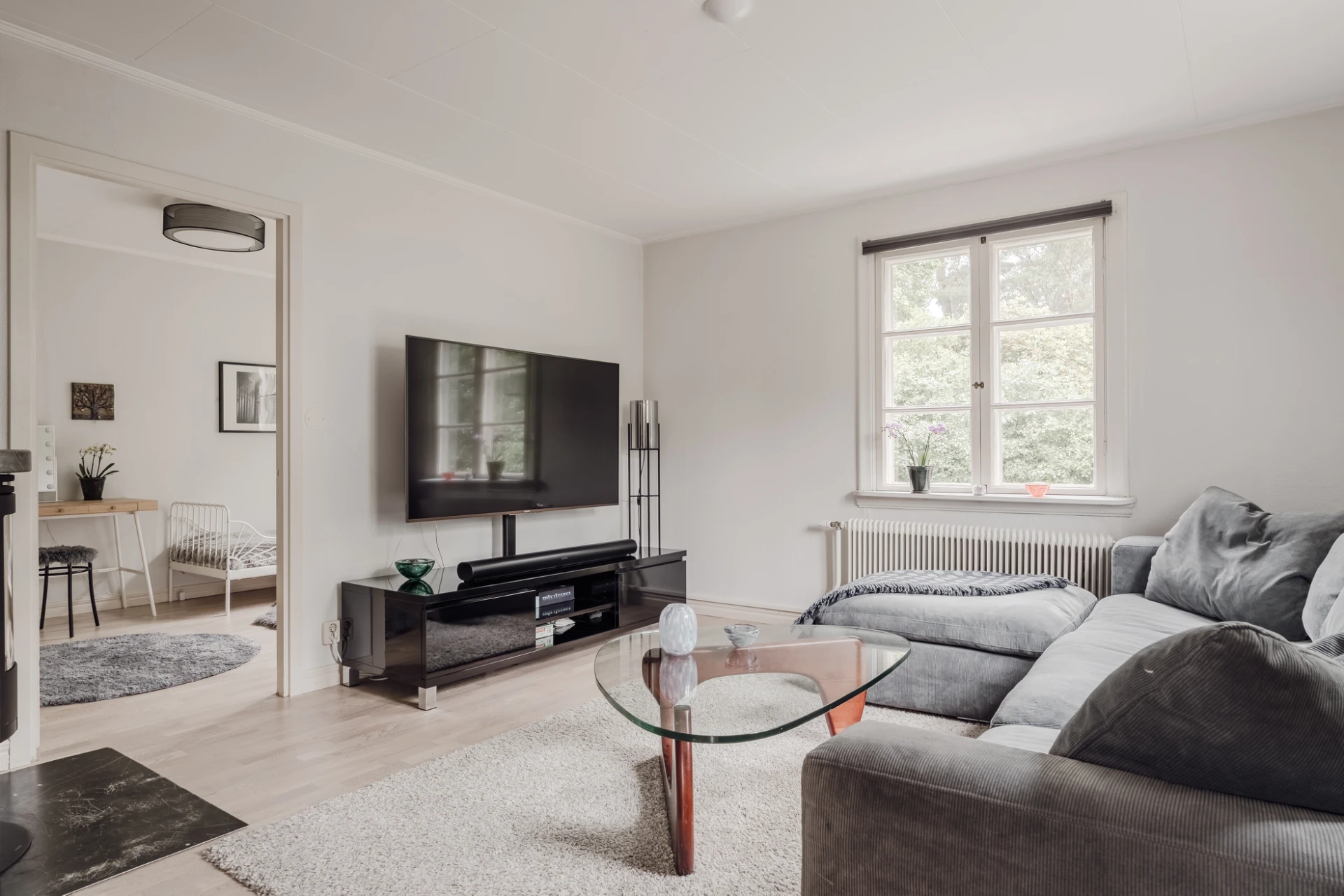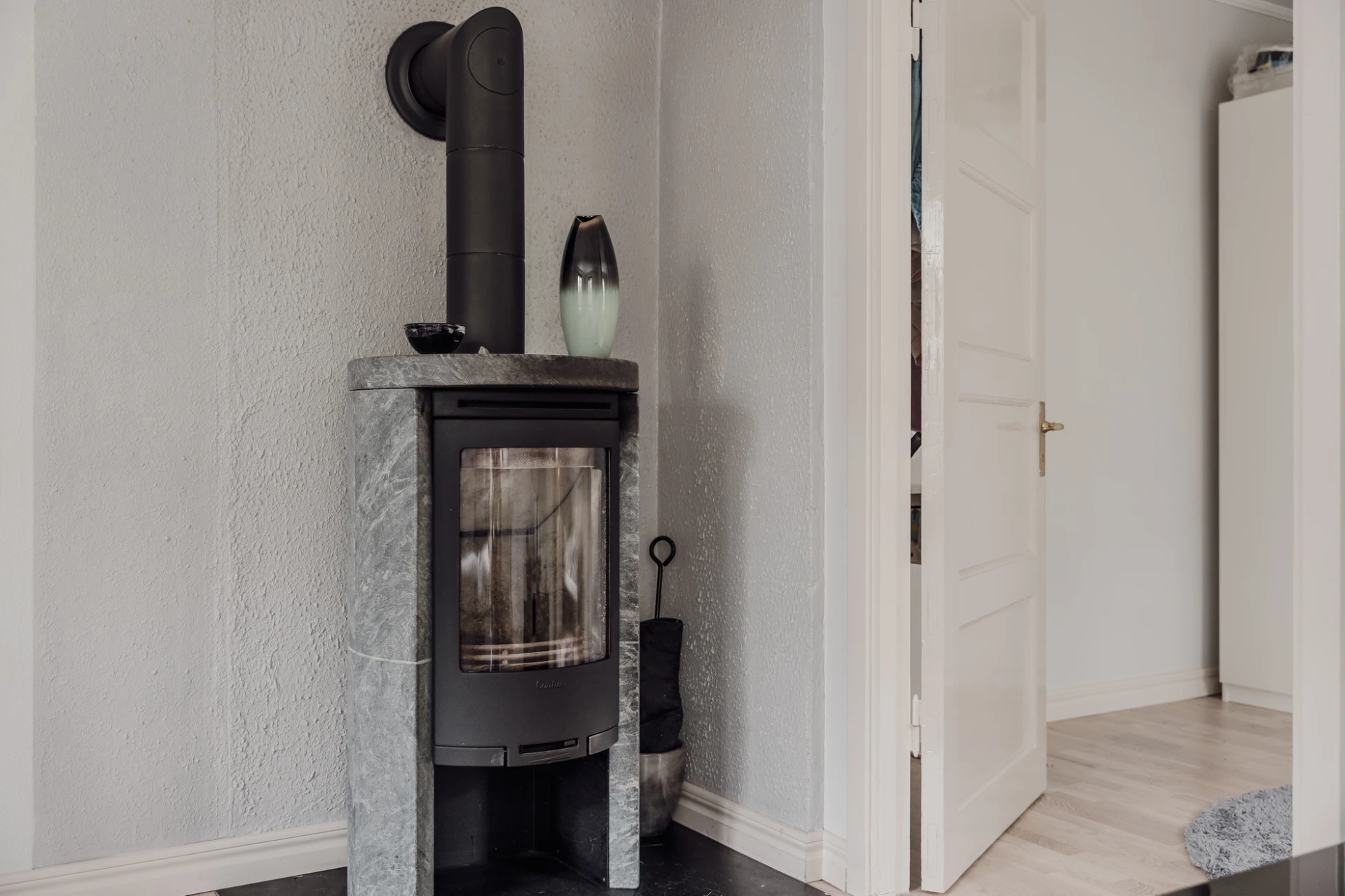 Parkettgolv och vitmålade väggar. Plats för soffgrupp och tv-möbel. En braskamin skänker värme och ljus.