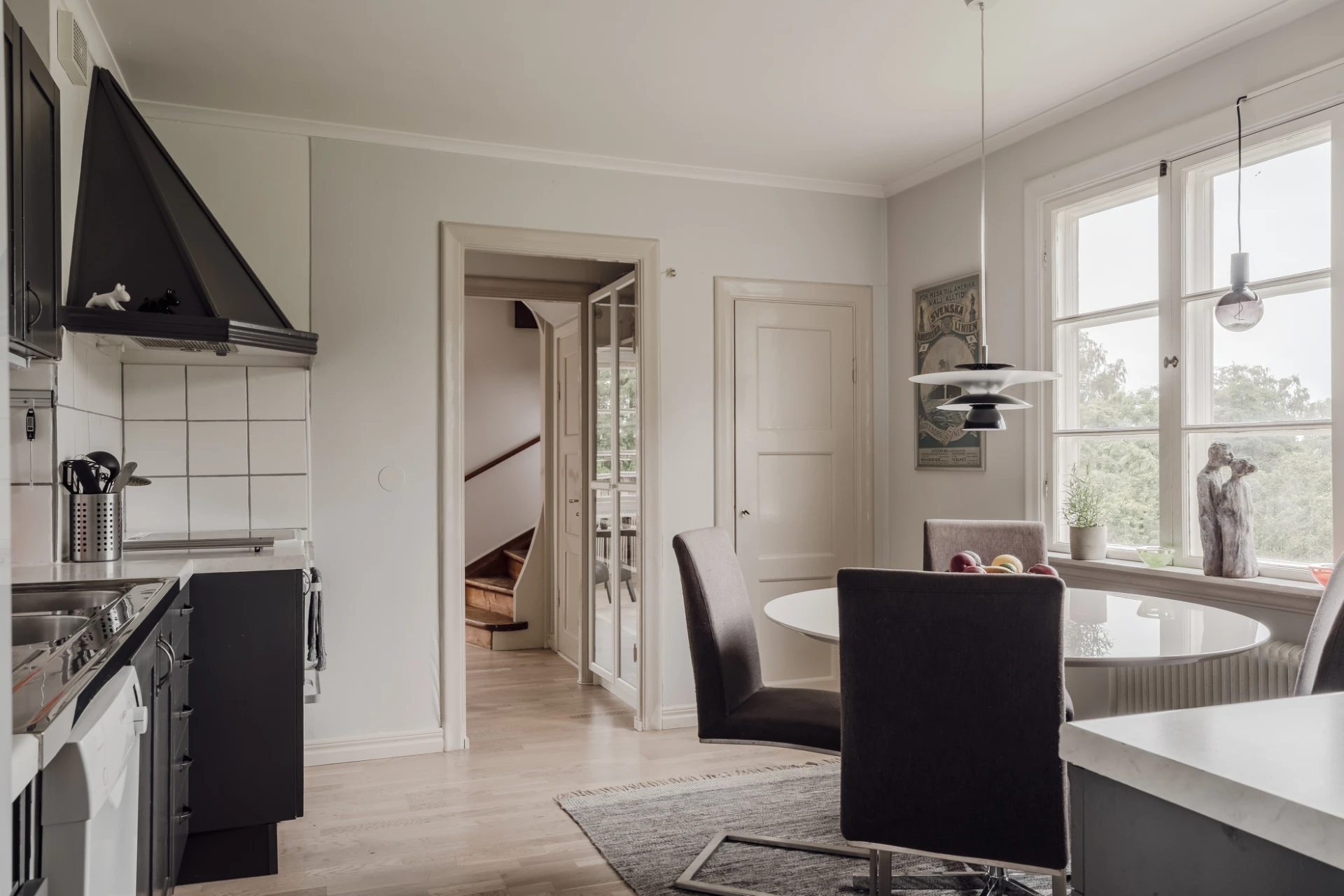 Villan är smakfullt renoverad med ljusa, stilrena materialval som harmonierar med husets ursprungliga karaktär. Originaldetaljer, som vackra fönster och generös takhöjd, skapar en varm och hemtrevlig atmosfär. Det rymliga köket erbjuder gott om arbetsytor och förvaring där även ett tidstypiskt skafferi återfinns, samt plats för matbord där hela familjen kan samlas. I vardagsrummet väntar en mysig braskamin – perfekt för kalla vinterkvällar eller avkoppling efter en lång dag.