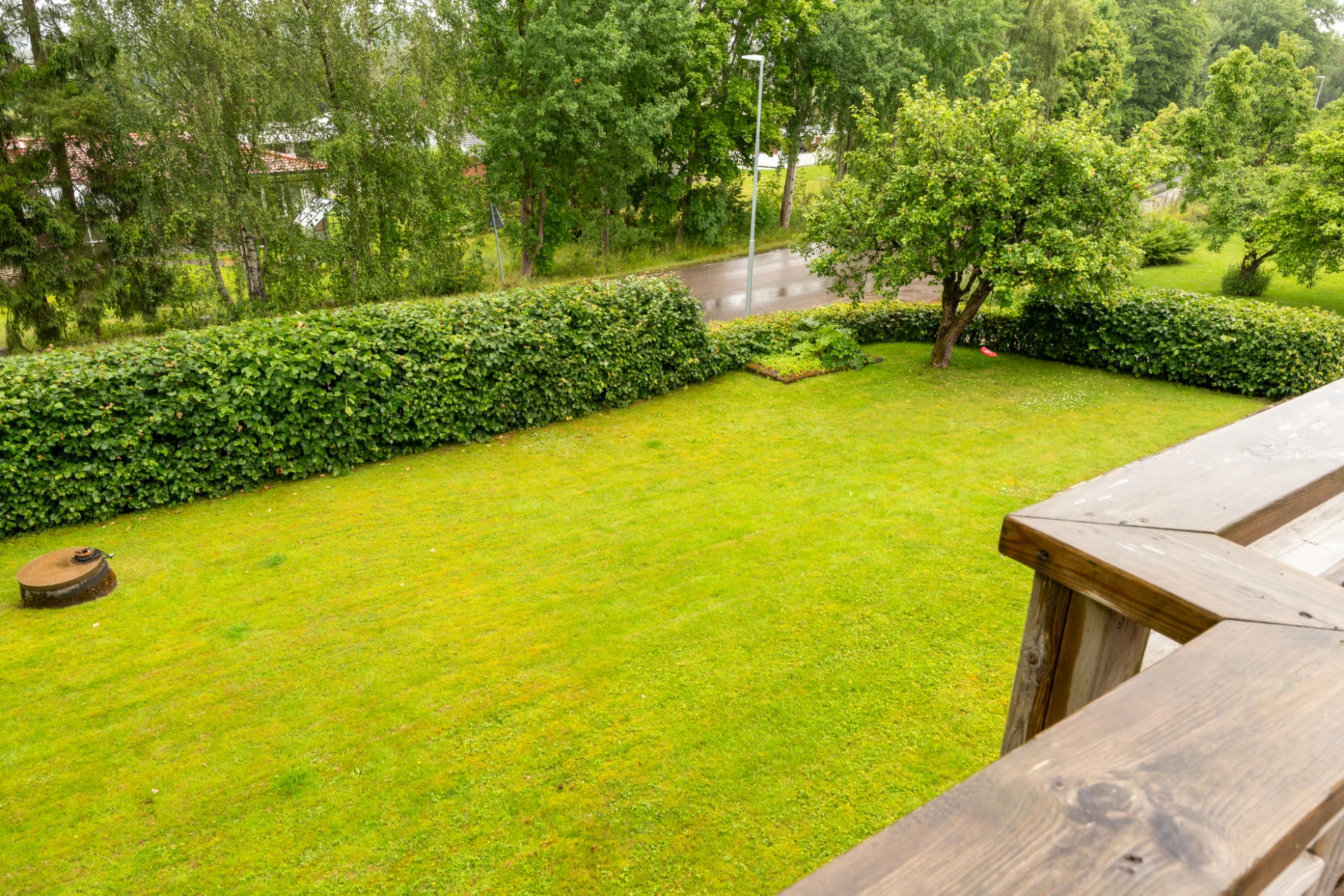 Tomtbeskrivning: Lummig och insynsskyddat trädgårdstomt med fina gräsytor.