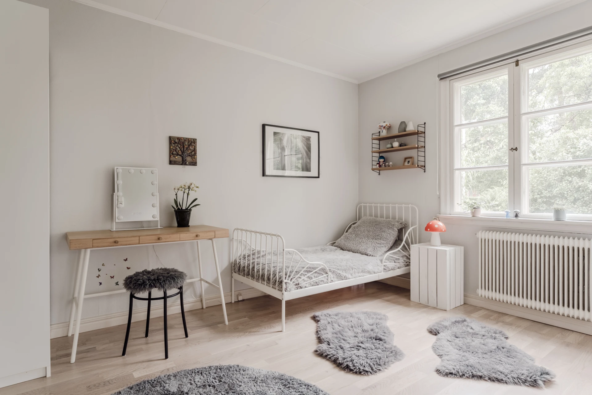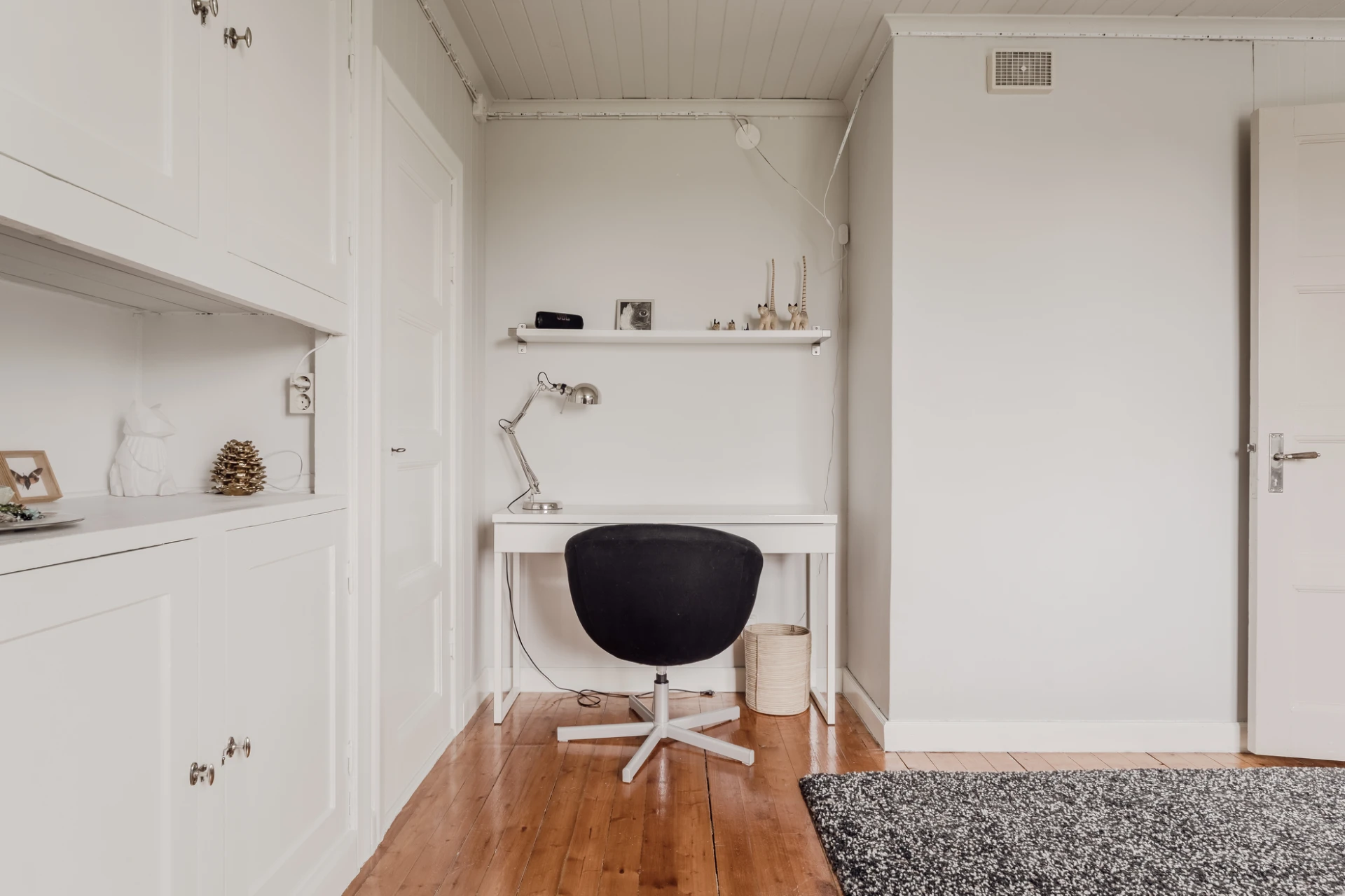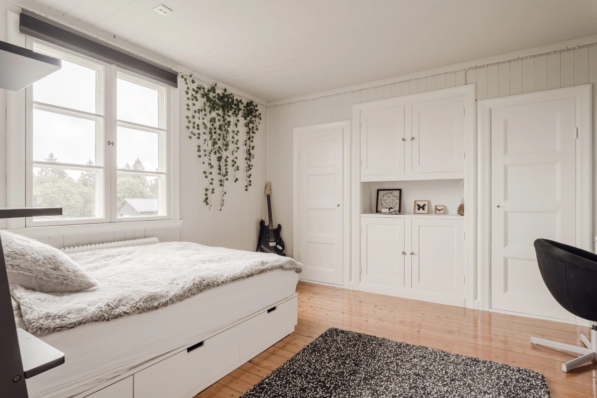 Brädgolv och ljusmålade väggar. Plats för enkelsäng och skrivbord. En platsbyggd garderob och bokhylla skänker rummet karaktär och förvaring.