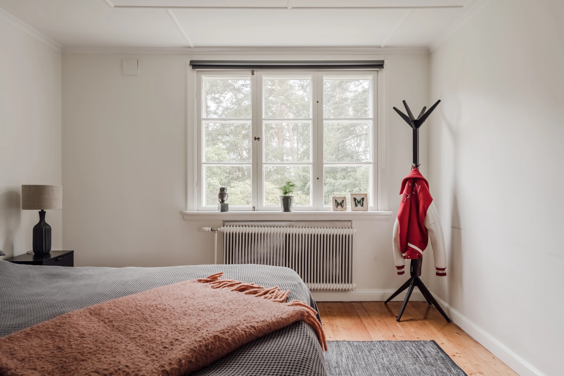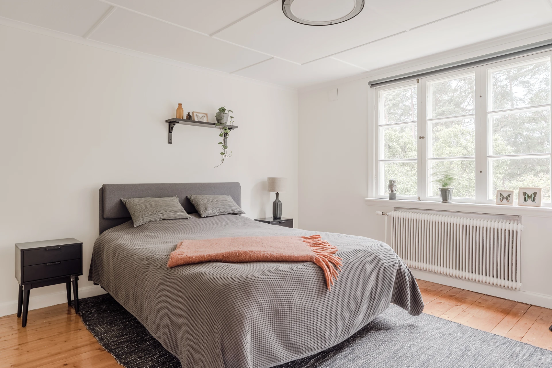 Parkettgolv och ljusmålade väggar. Plats för dubbelsäng.