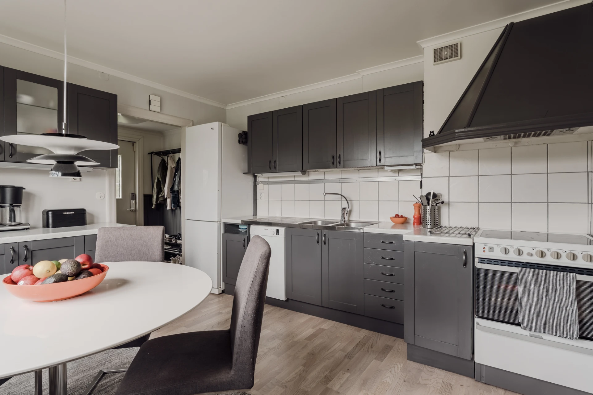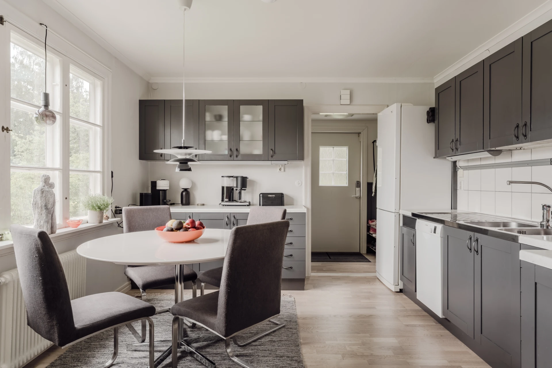 Parkettgolv och vitmålade väggar. Köksinredning i grått med vitt kakel ovan arbetsytan. Den maskinella utrustningen består av kombinerad kyl/frys, spis med ugn, fläktkåpa samt diskmaskin. Intill fönstret finns plats för ett matbord. Köket har gott om arbetsytor samt goda förvaringsutrymmen i flera skåp samt tidstypiskt skafferi.