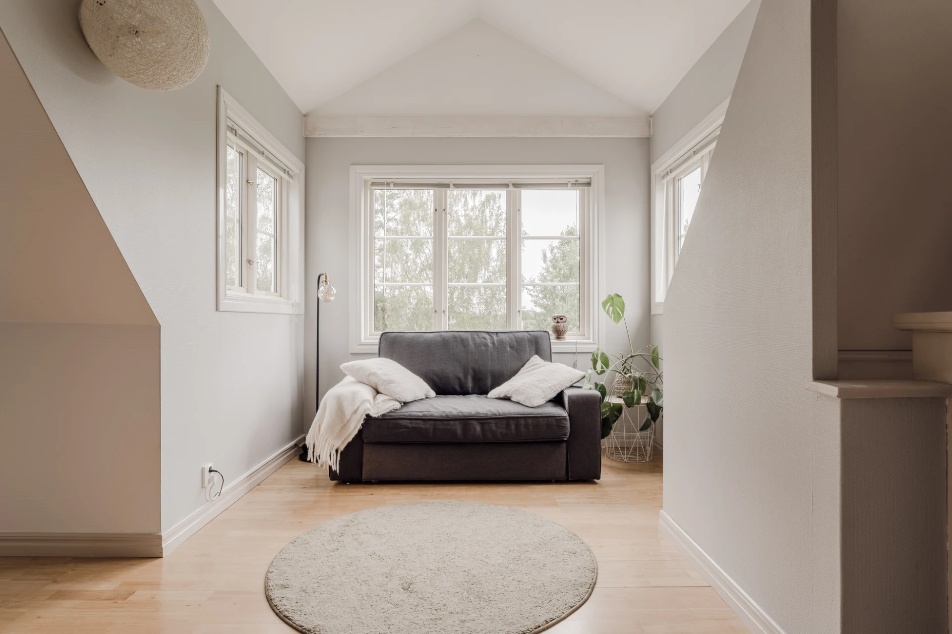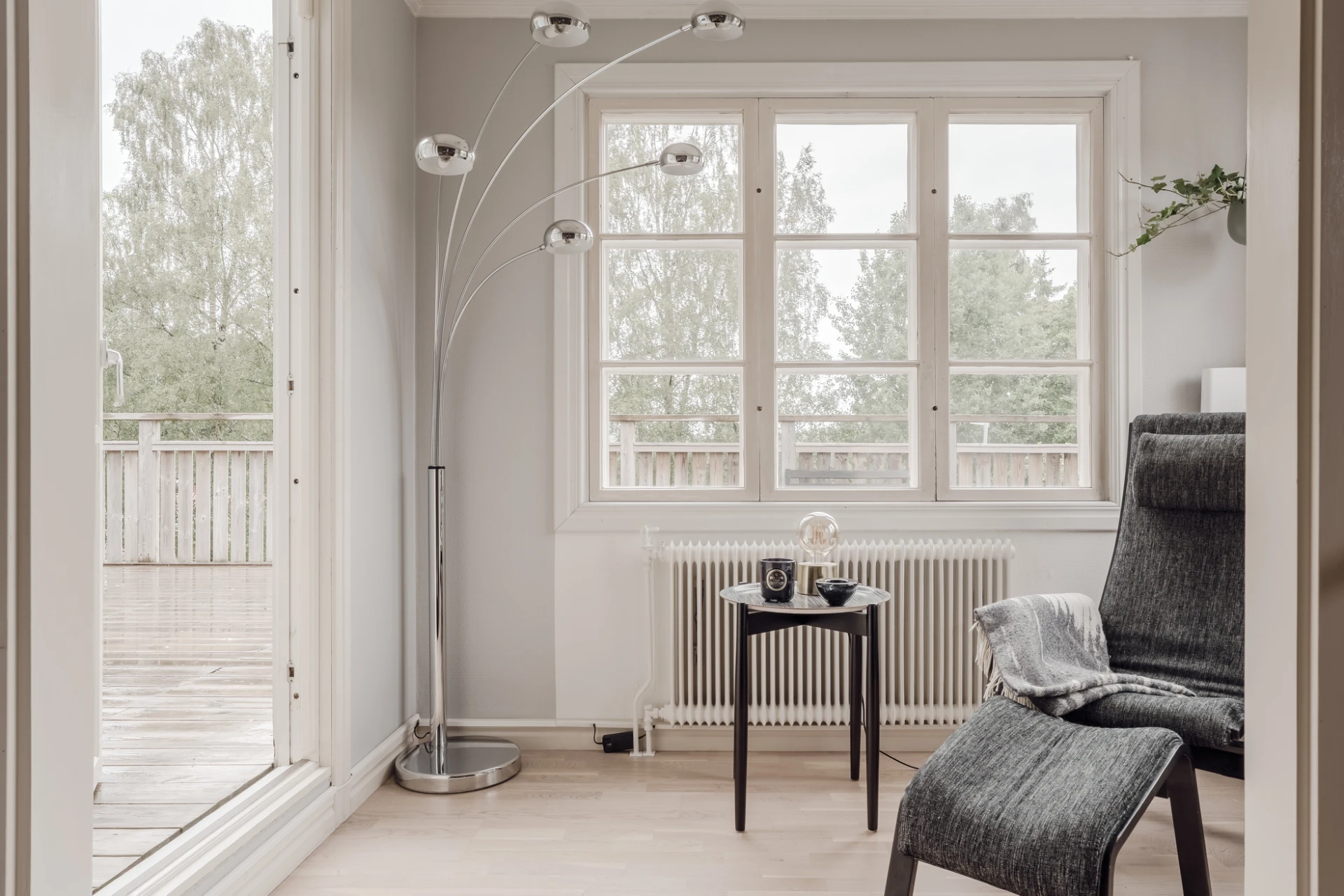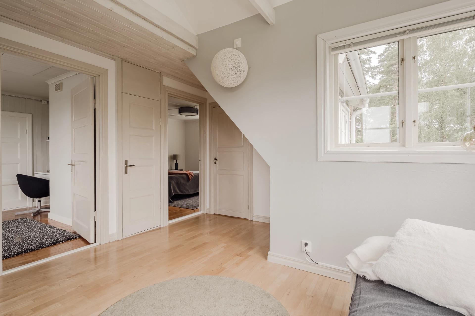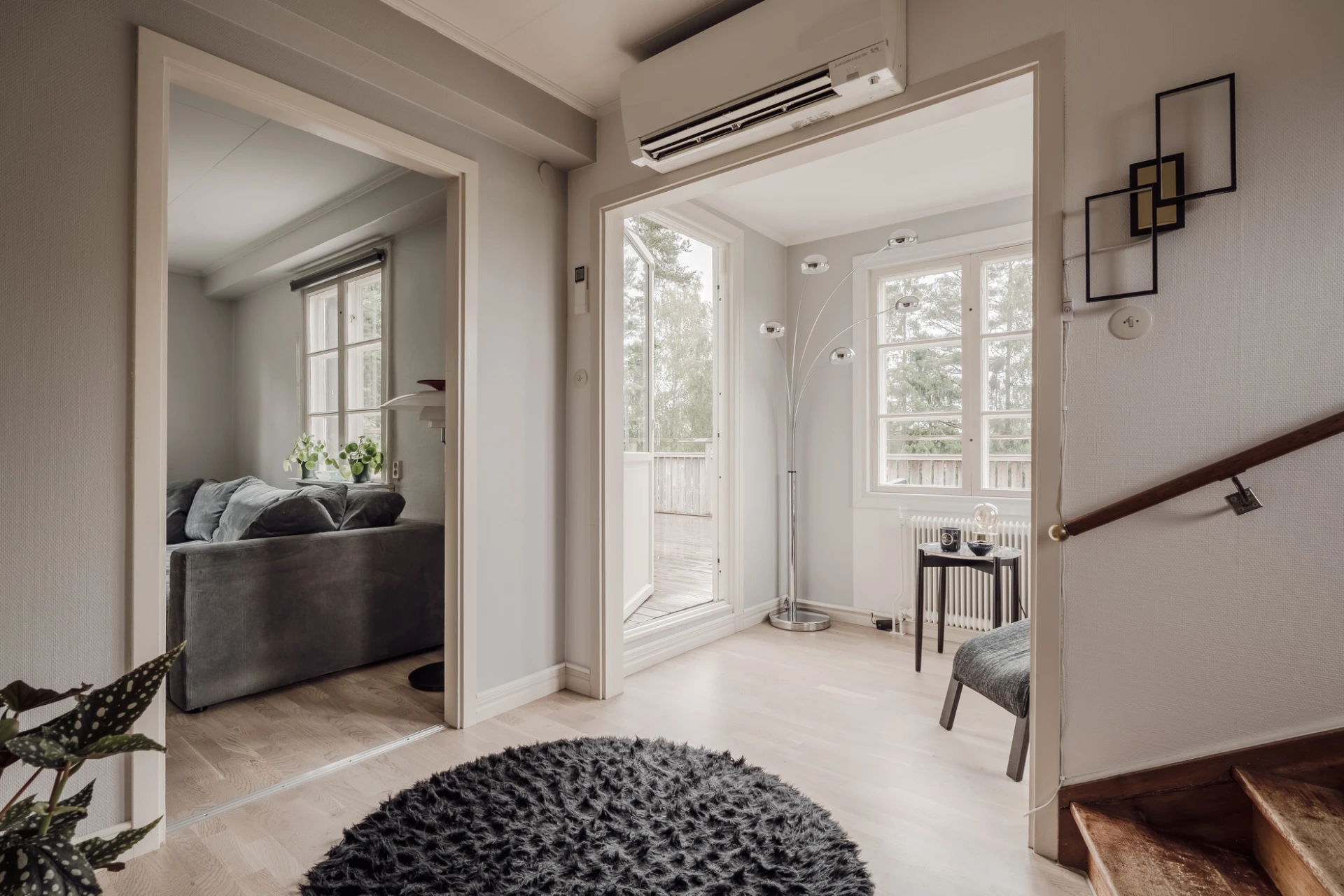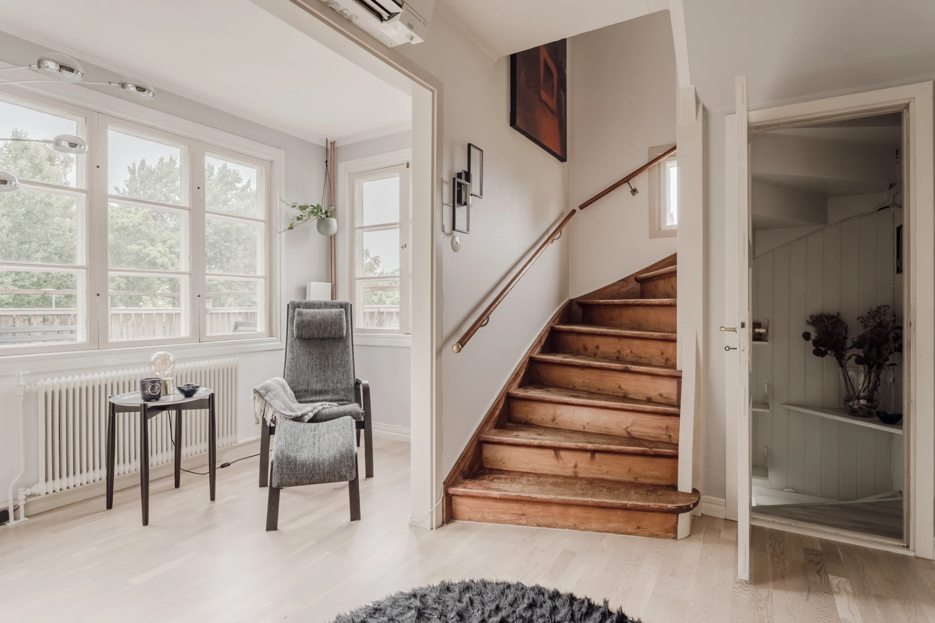 Parkettgolv och ljusmålade väggar. Plats för läsfåtölj. Från burspråket nås bostadens stora altan.
