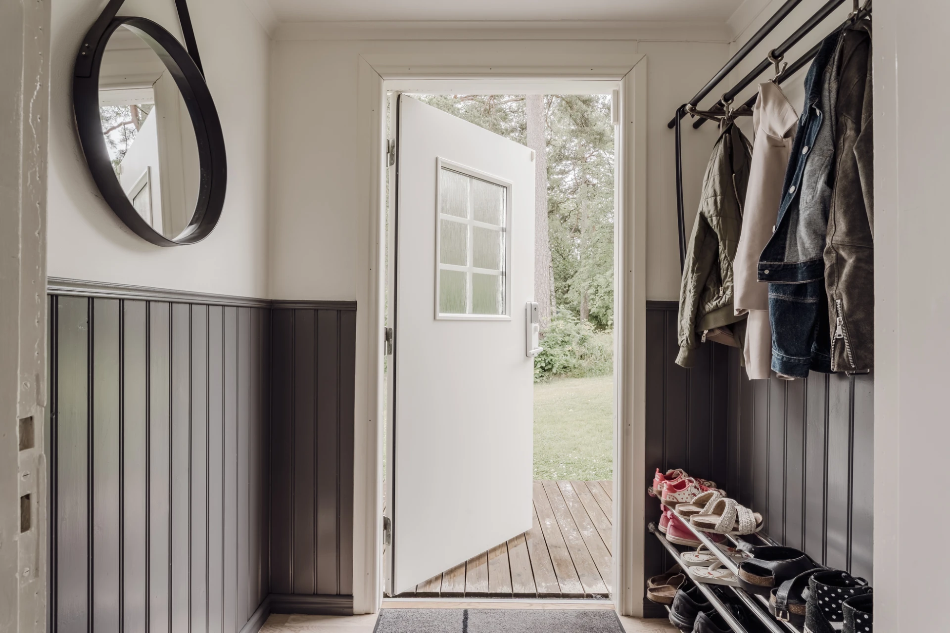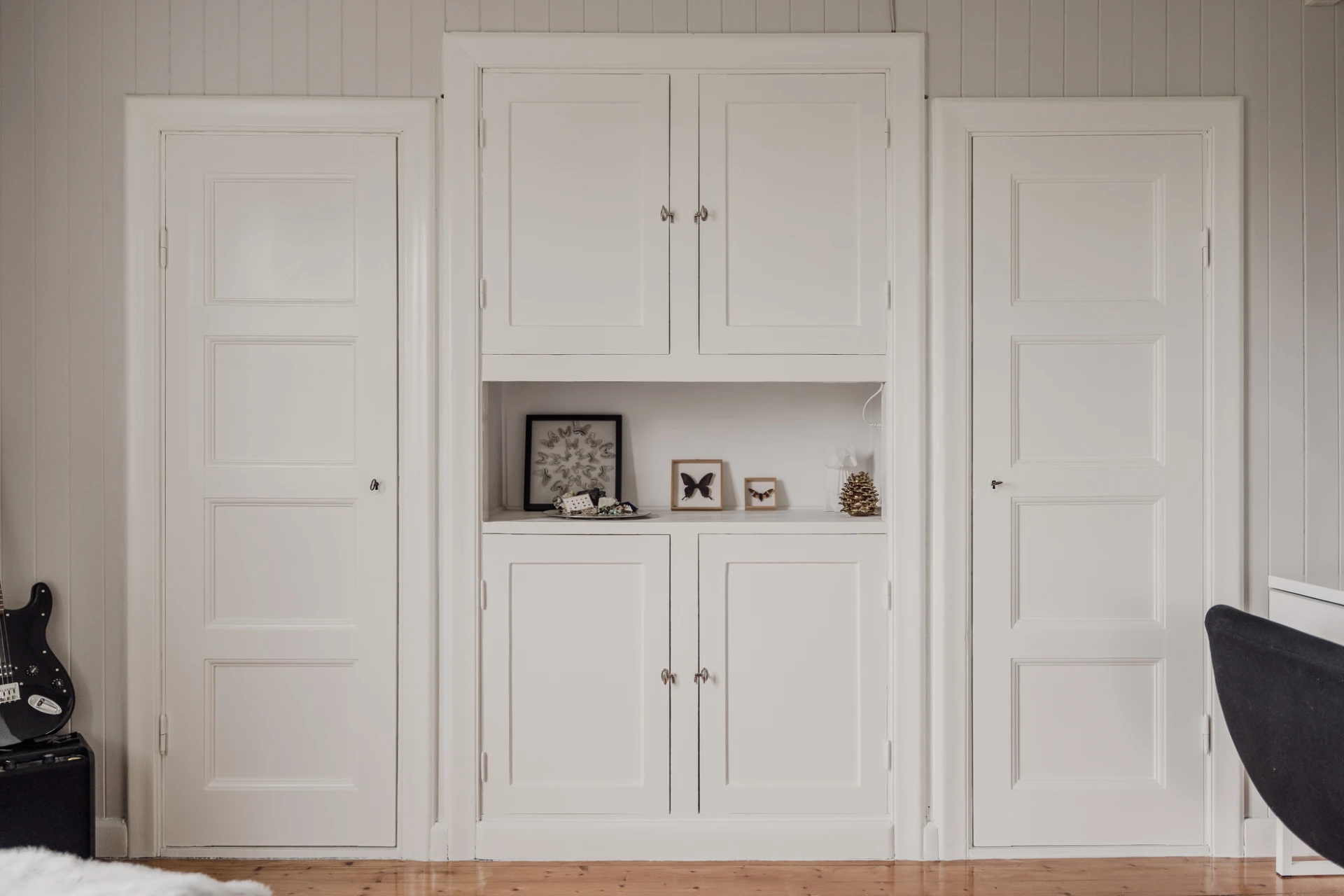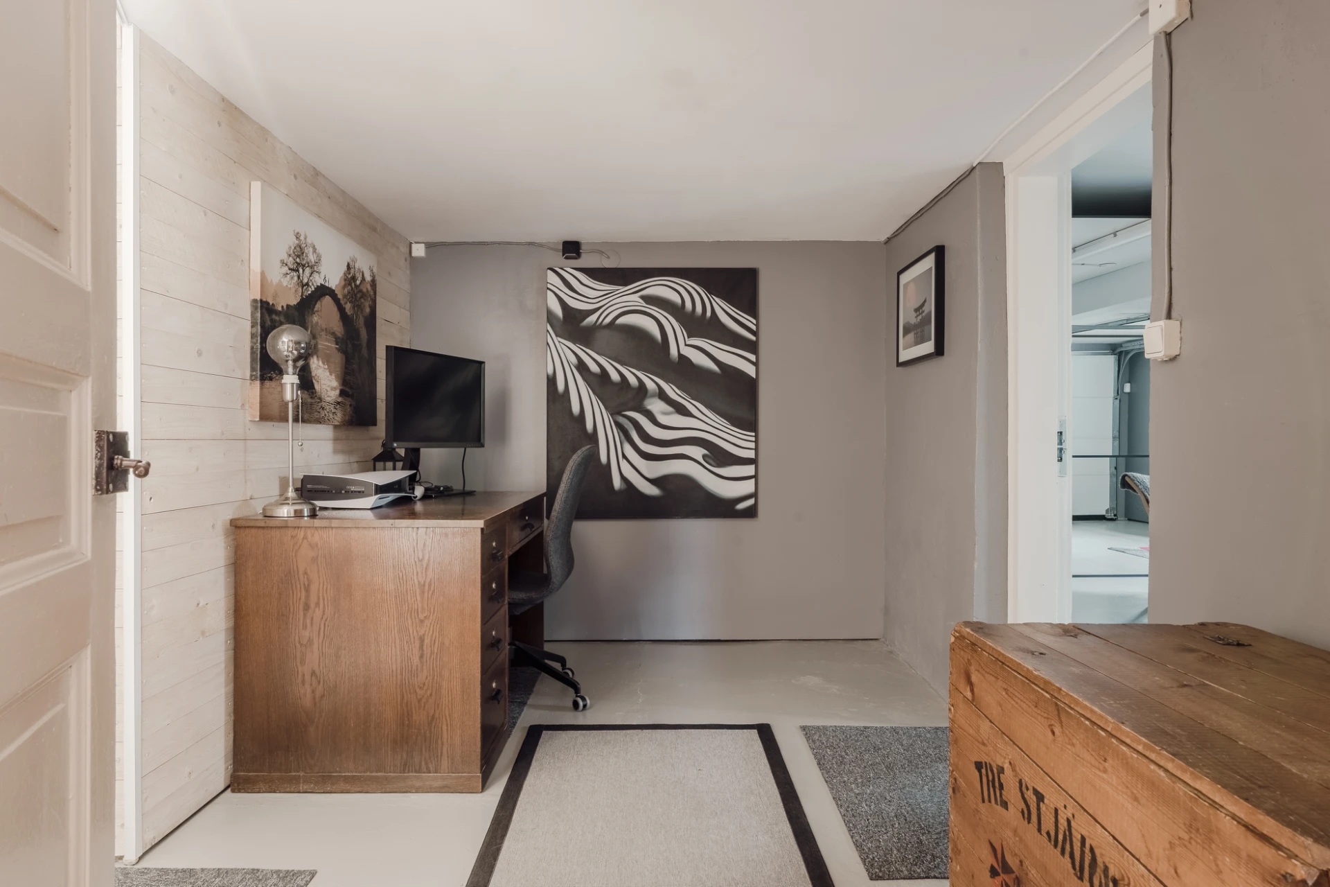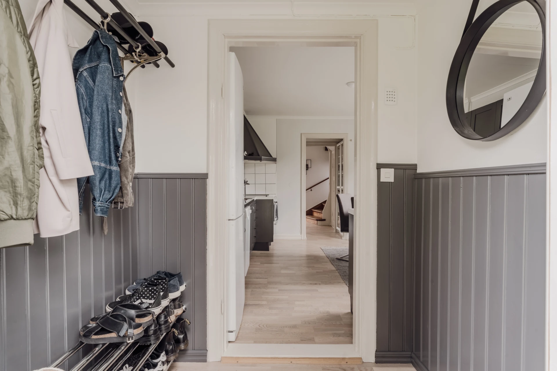 Parkettgolv och väggar klädda med grå bröstpanel och vita väggar.