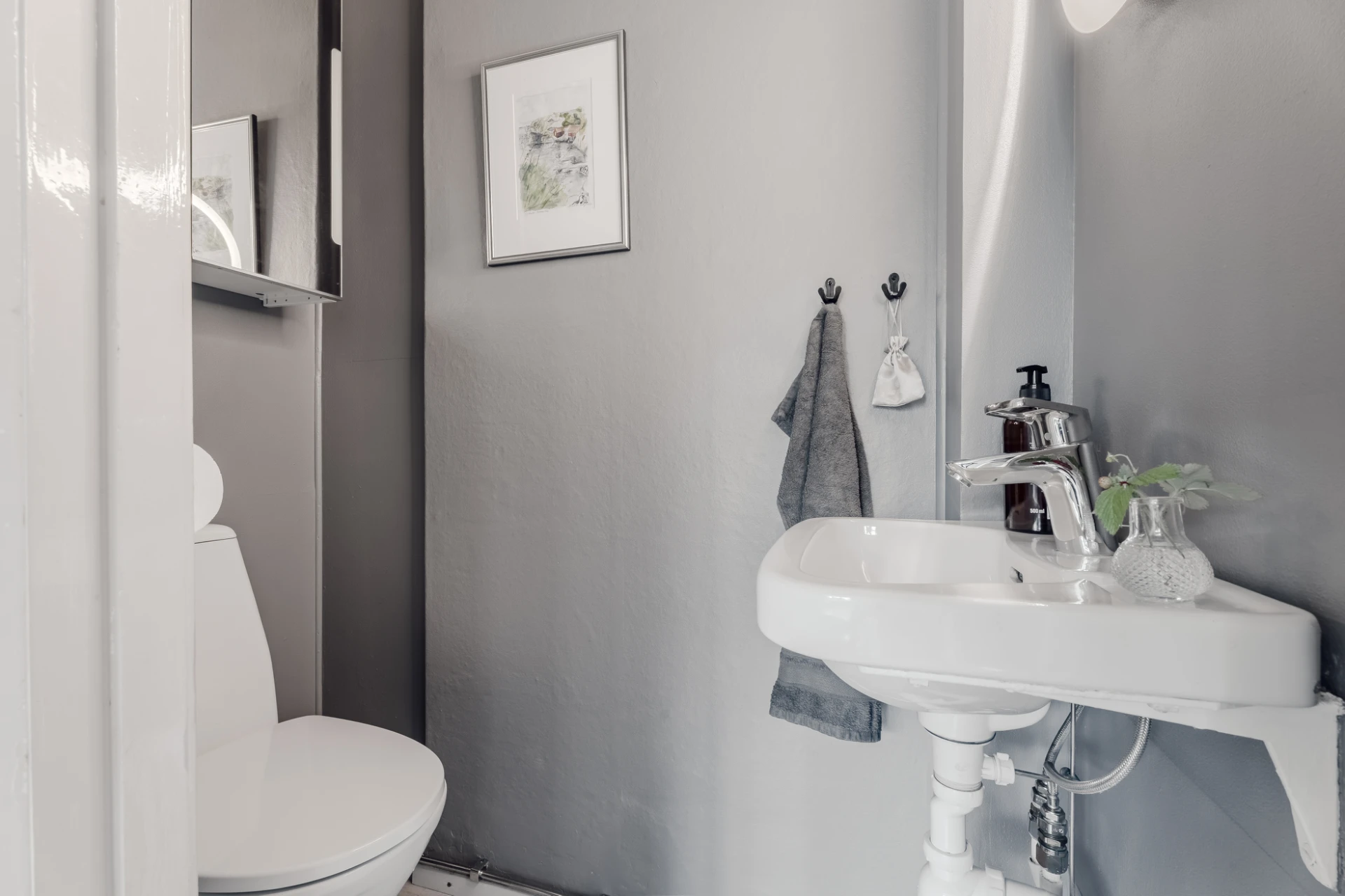 Laminatgolv och målade väggar. Här finns wc och handfat.