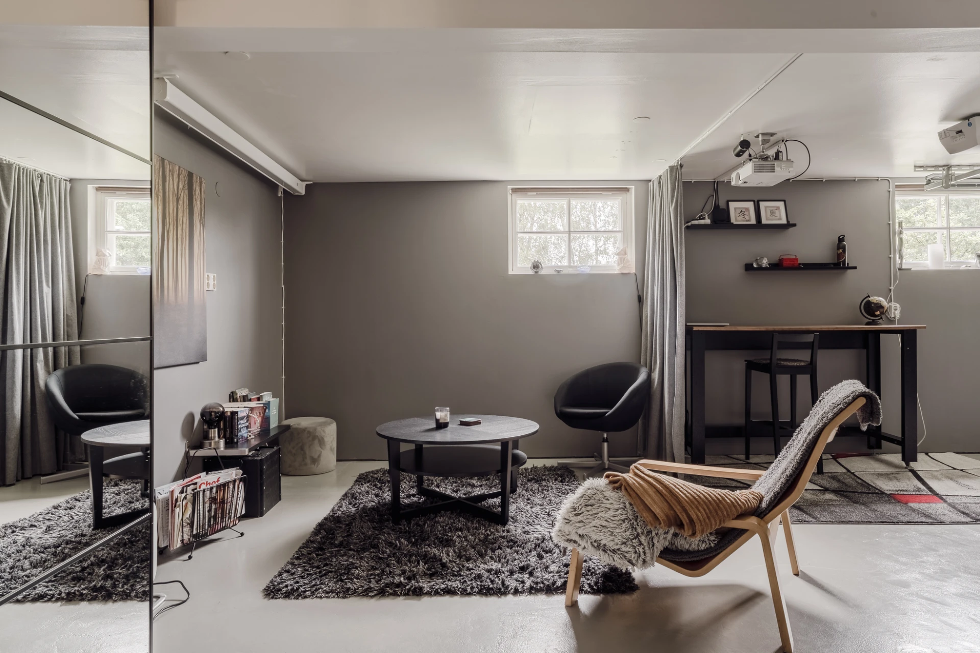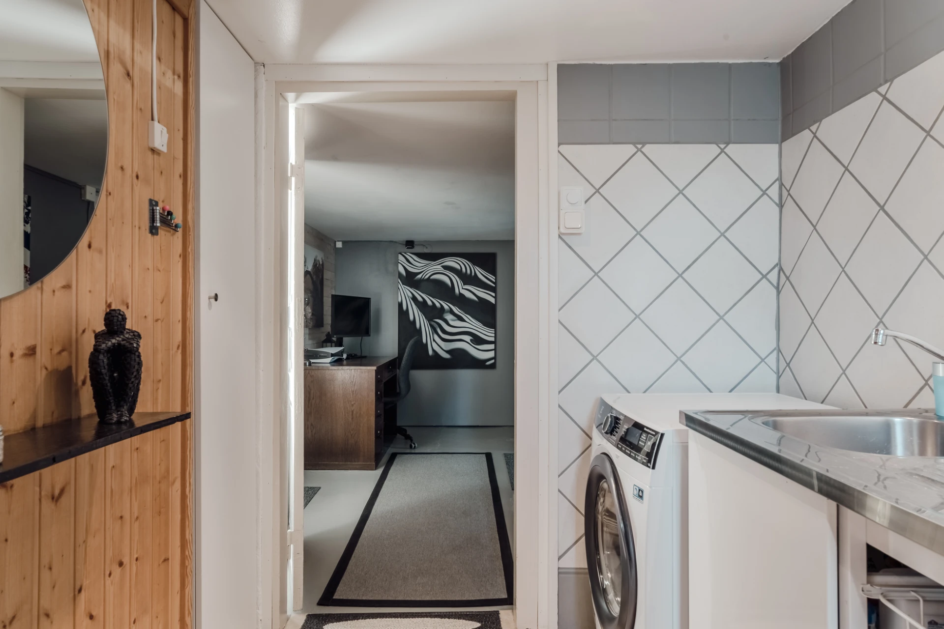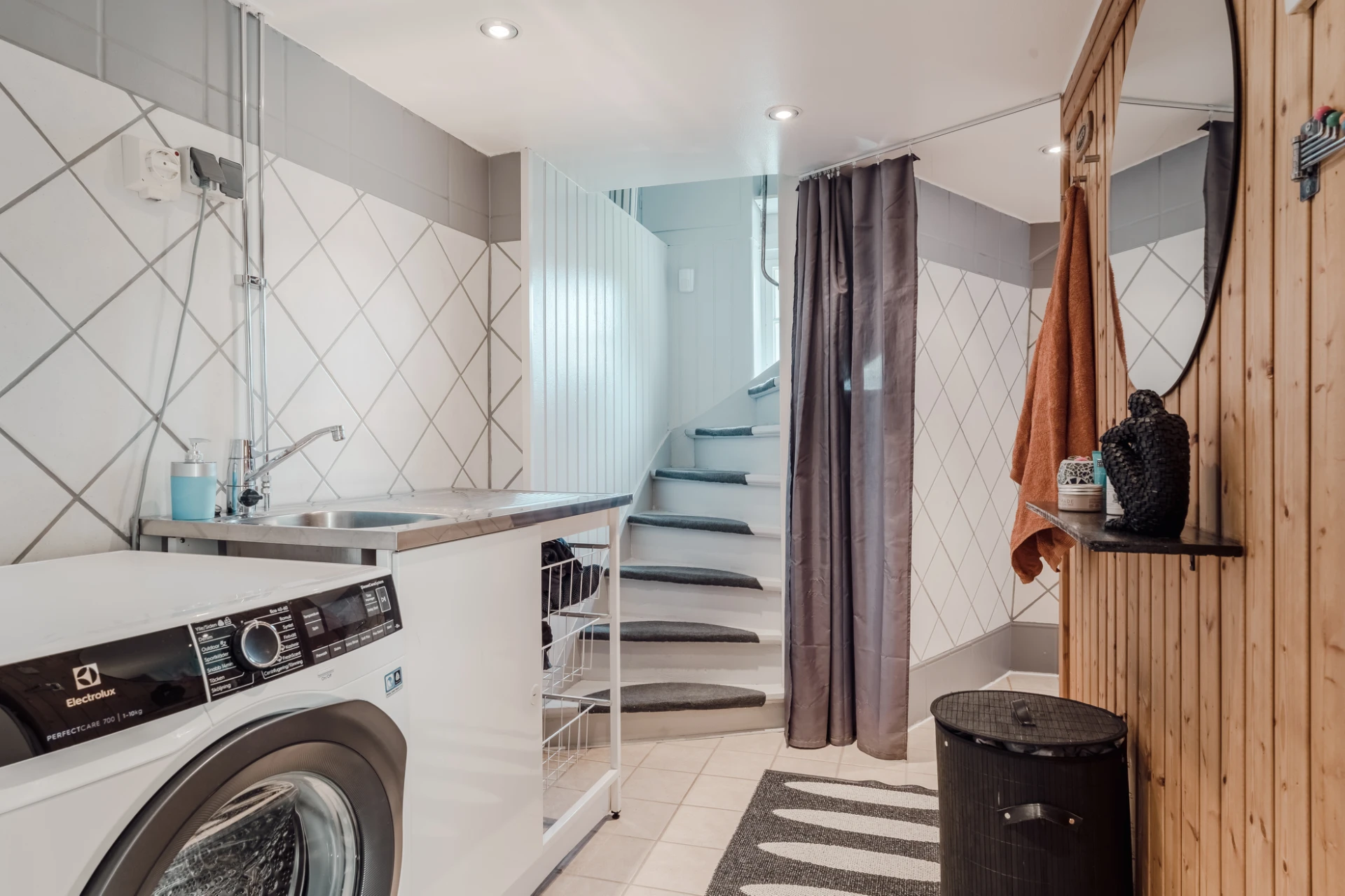 I källarplan finns tvättstuga, helkaklad dusch samt bastu. Från källaren nås även garaget.