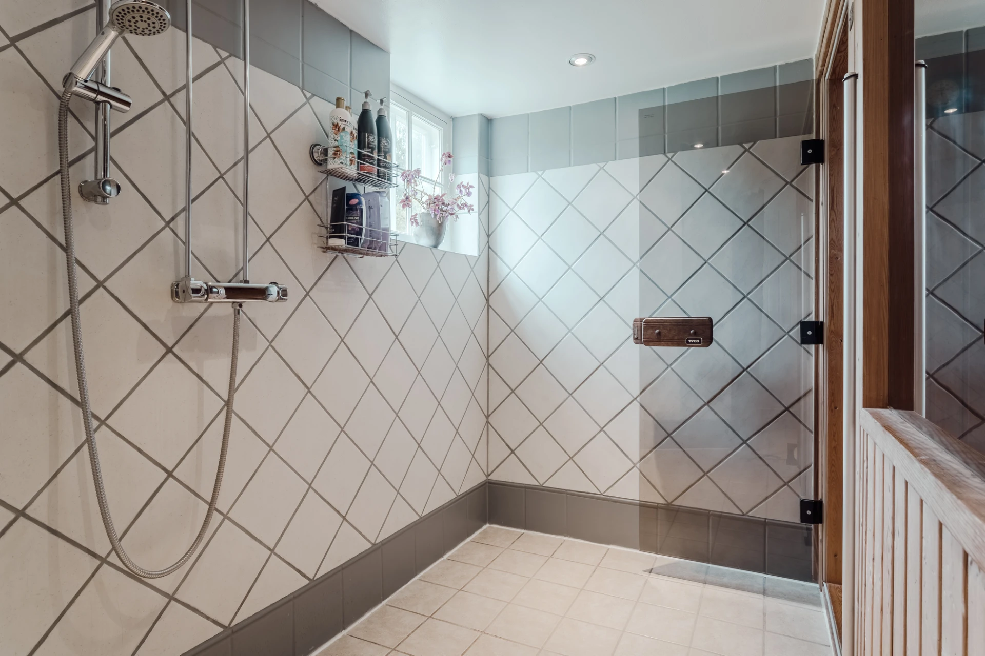 Klinkergolv med golvvärme och väggar klädda med vit pärlspont. Här finns wc, handfat med kommod, spegelskåp samt dusch.