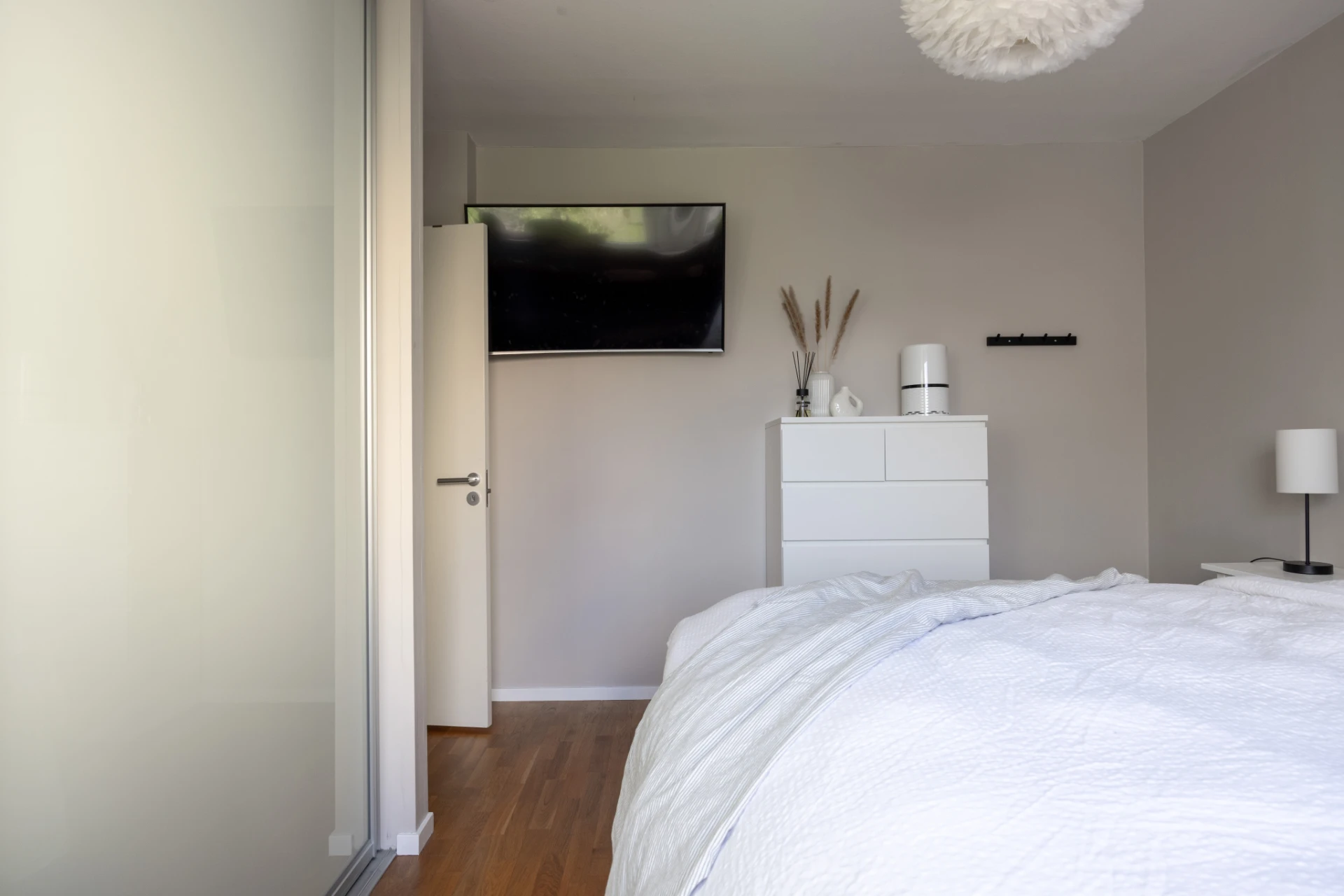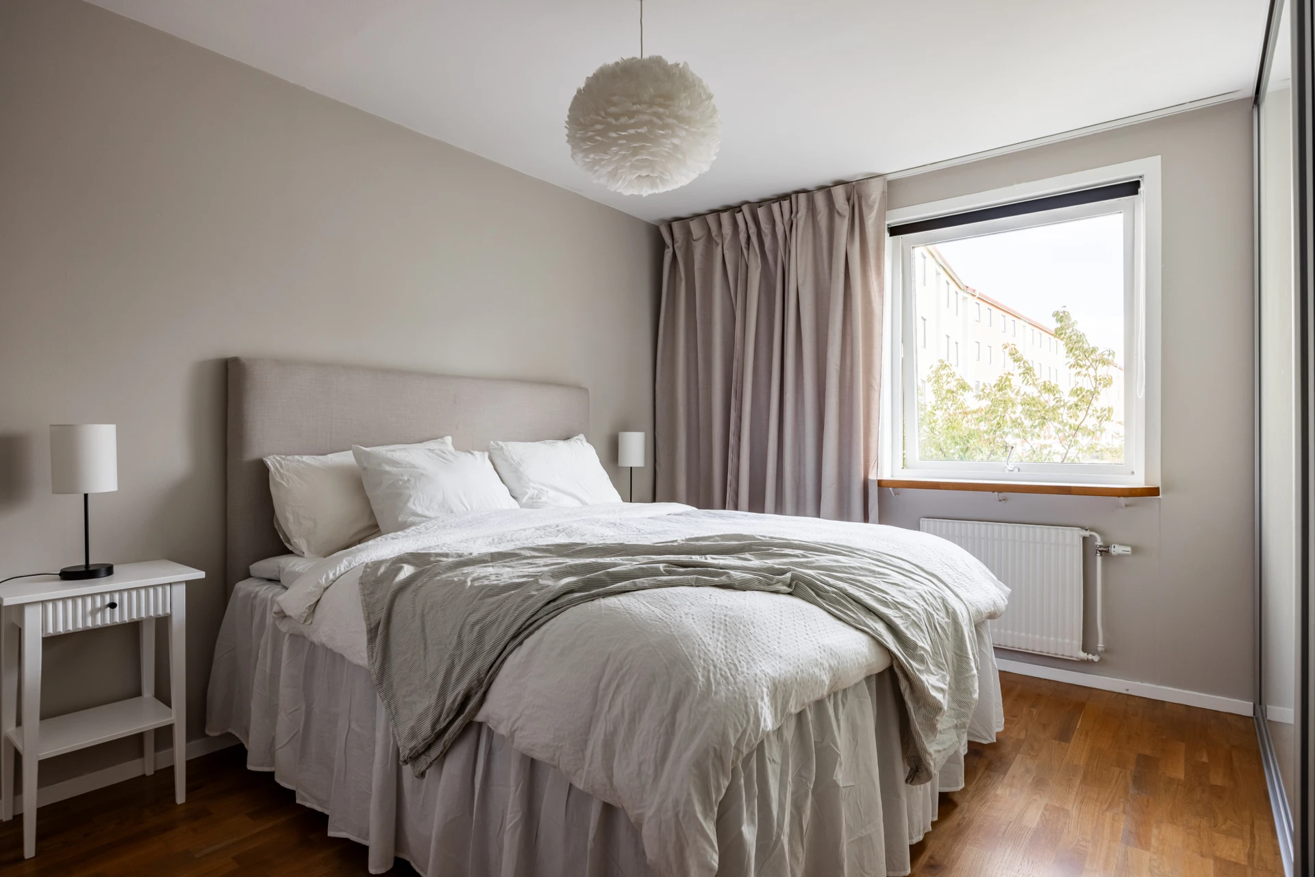 Parkettgolv och väggar målade i beige. Här finns plats för dubbelsäng med tillhörande möblemang. En skjutdörrsgarderob ger plats till kläder och tillhörigheter.