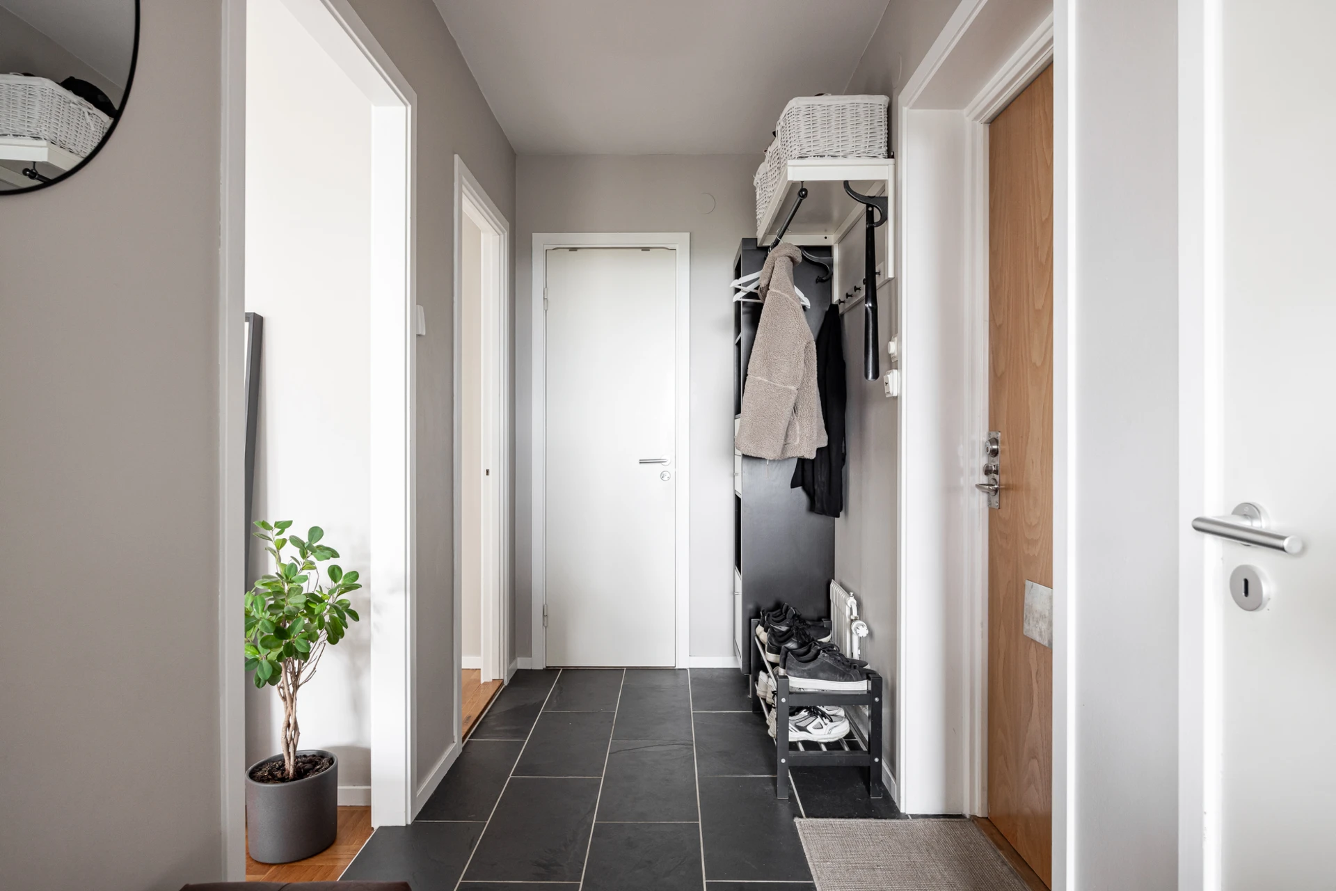 Klinkergolv i svart och väggar målade i beige. En klädkammare ger gott om plats för avhängning och förvaring.