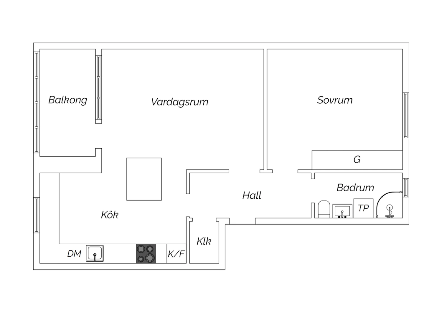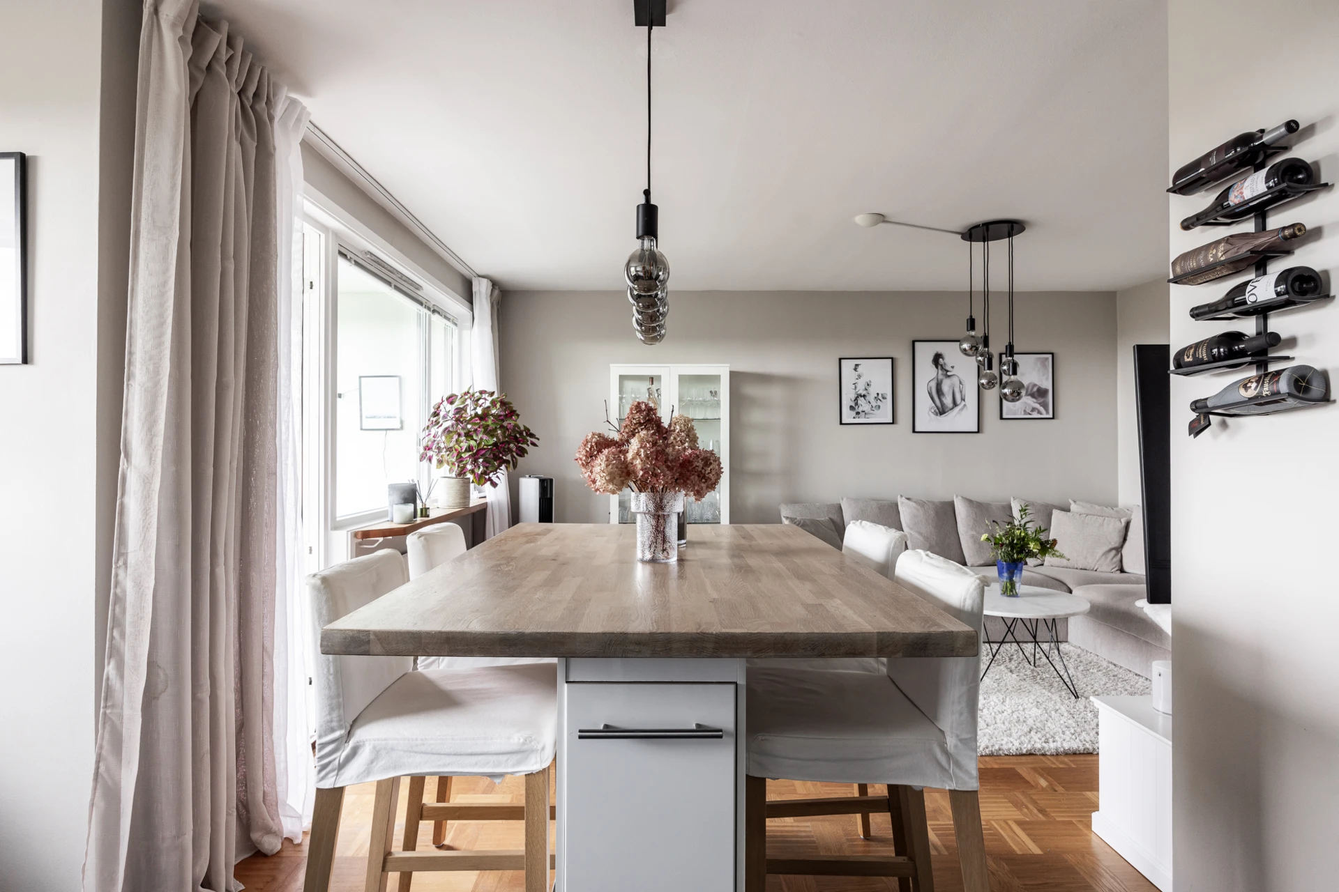 Parkettgolv i holländsk stil och målade väggar i beige. Här finns plats för soffgrupp med tillhörande möblemang och matsalsmöbel. Från vardagsrummet nås bostadens inglasade balkong i söderläge.