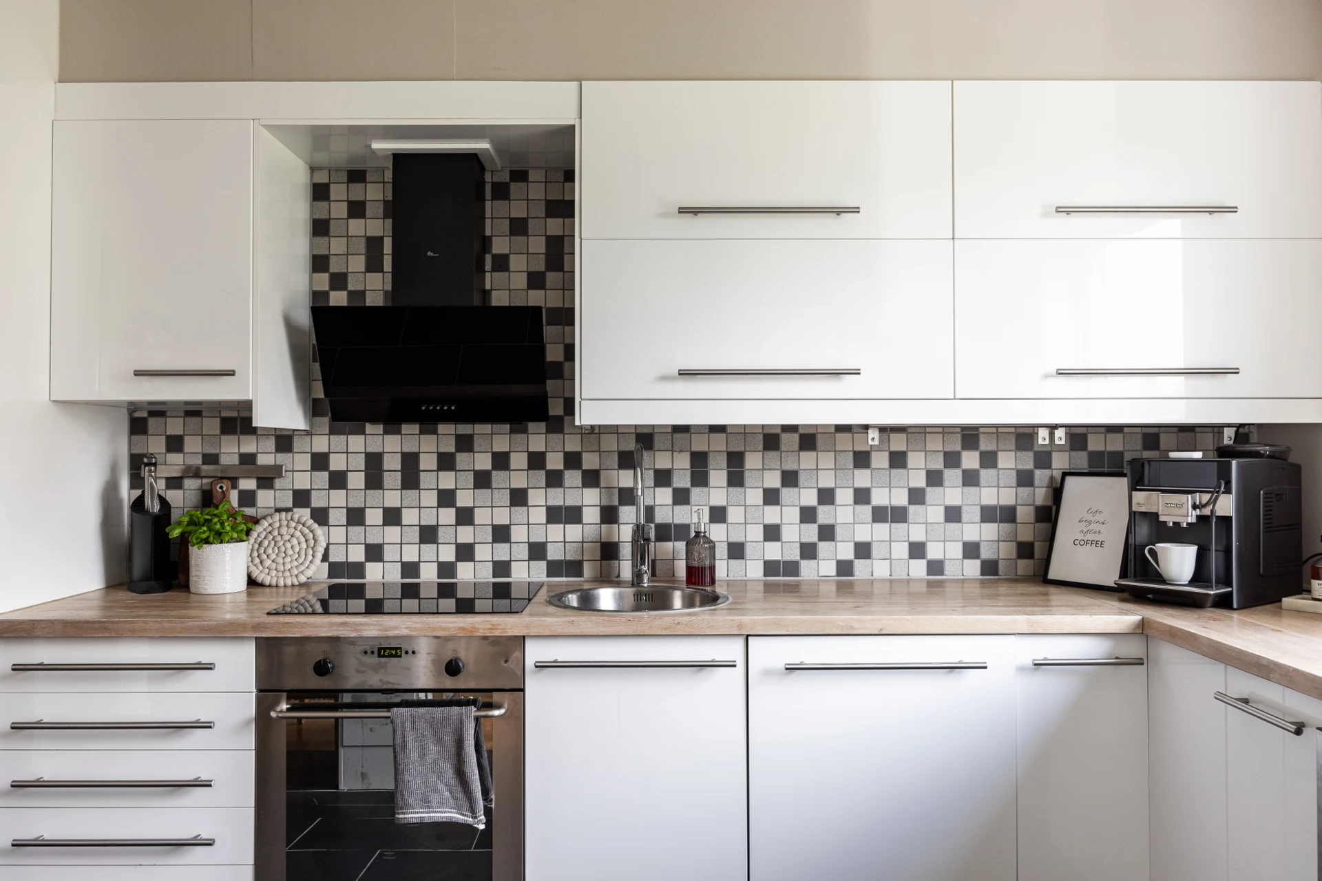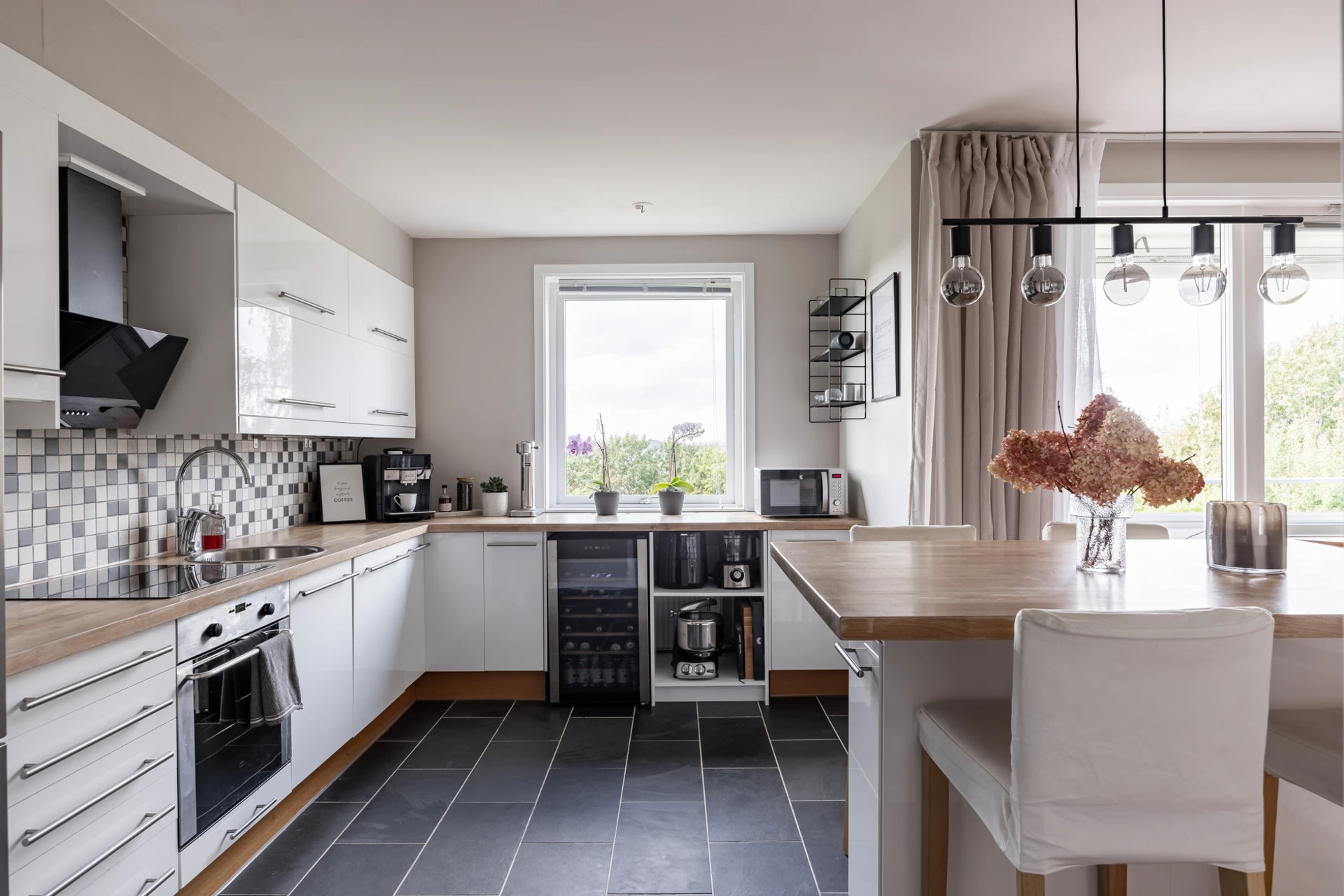 Klinkergolv i svart och väggar målade i beige. Köksinredning i vitt med mönstrat kakel ovan arbetsbänken i ek. Köket är utrustat med kombinerad kyl/frys (2025), induktionshäll, fläktkåpa (2025) varmluftsugn, mikro (2023) samt diskmaskin (2022). Plats för matbord.