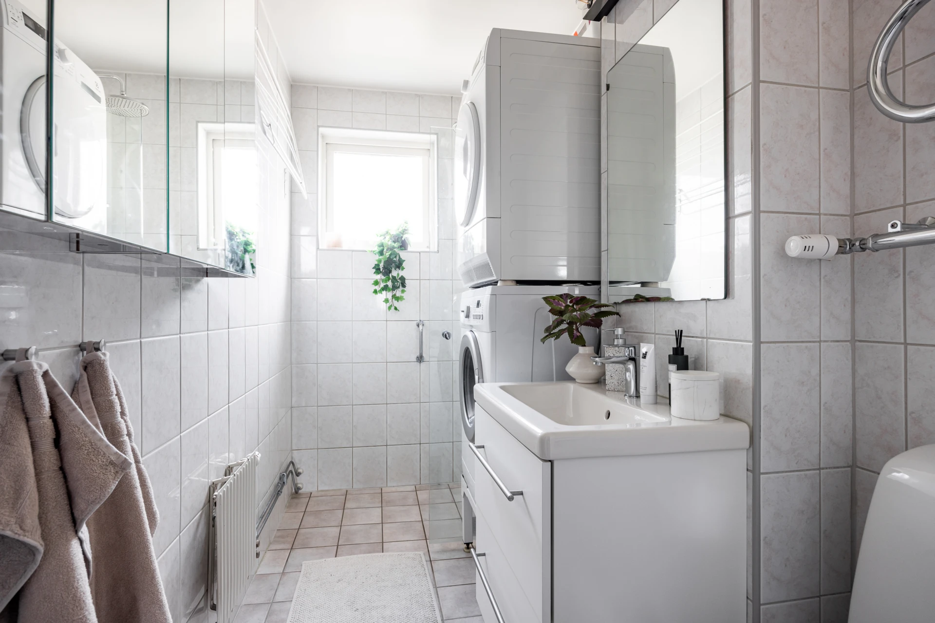 Ljust klinkergolv och ljusa helkaklade väggar. Här finns wc, handfat, spegelskåp samt dusch. Badrummet är även utrustat med en tvättpelare med tvättmaskin och torktumlare. Ett fönster förser rummet med naturligt ljusinsläpp och vädringsmöjligheter.