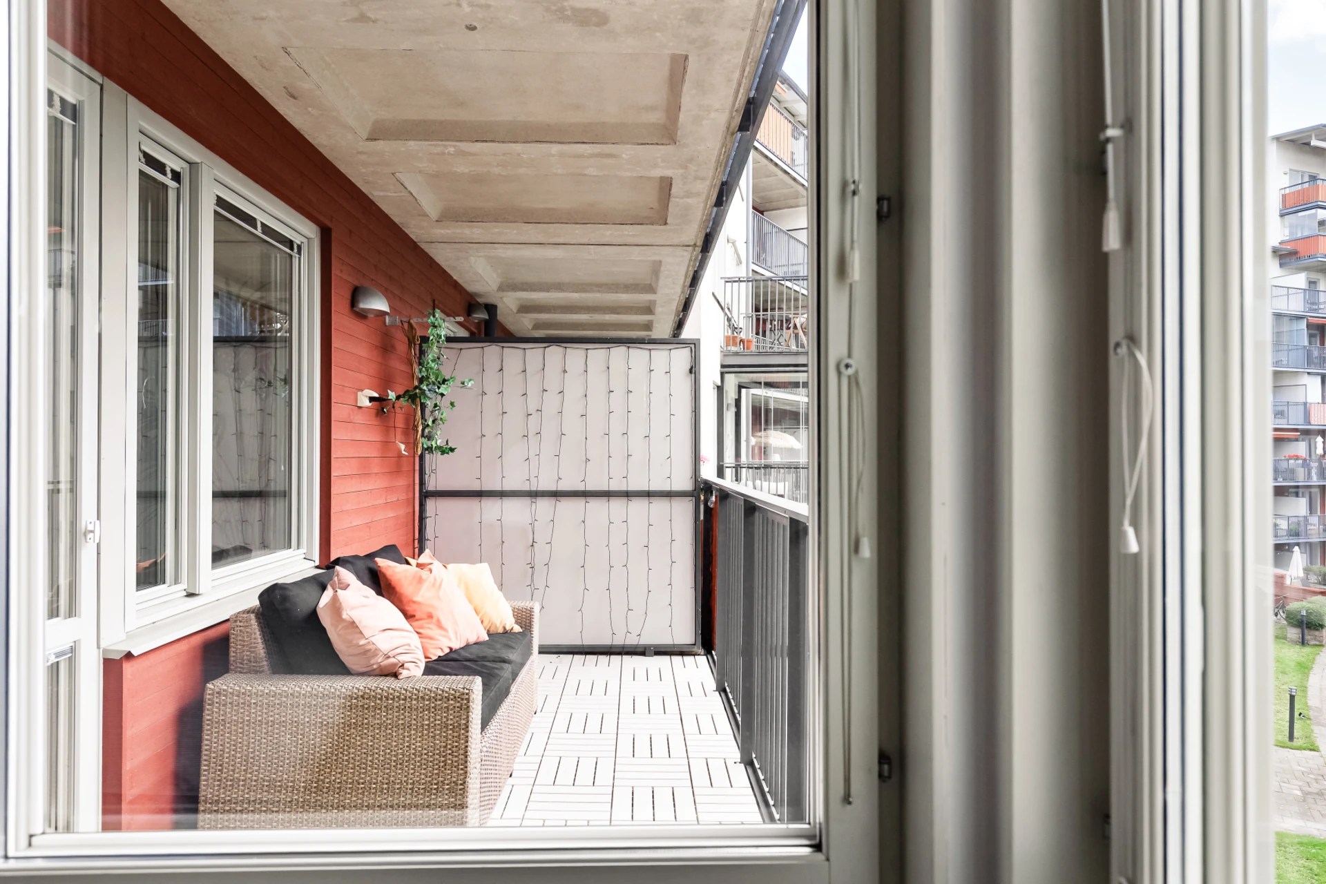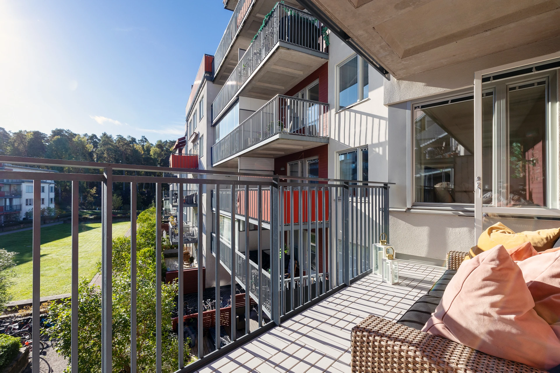 Stor balkong mot trevlig gård med trall. Gott om plats för utemöbler och egna planteringar.