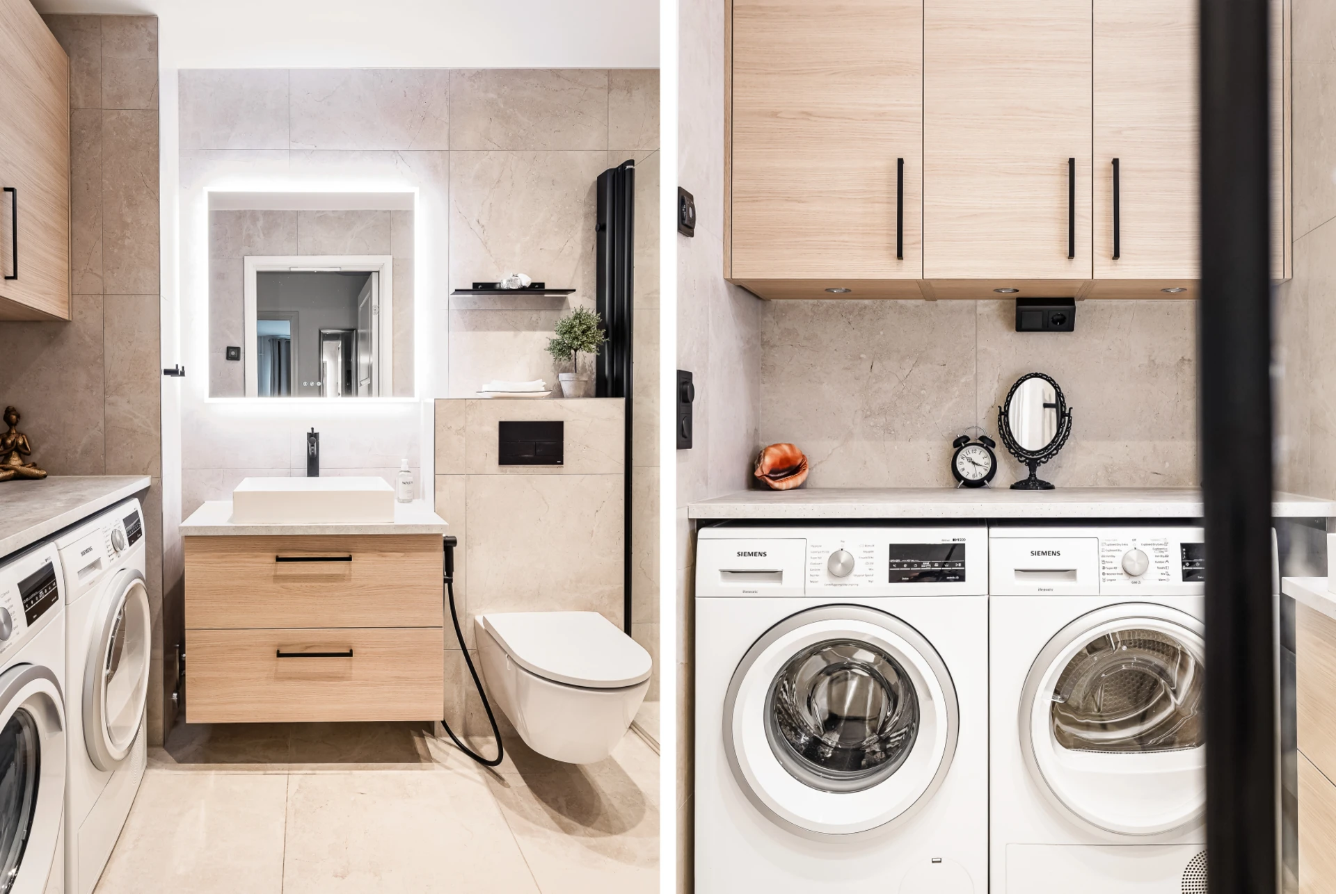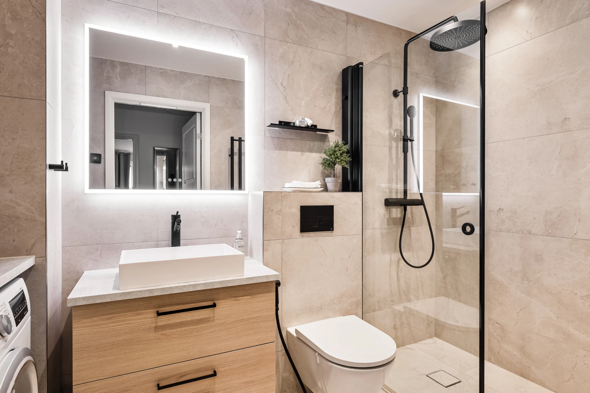 Renoverat badrum med ljust klinkergolv med golvvärme och kaklade ljusa väggar med svarta inrednings detaljer. Dusch med takdusch och glasvägg, WC, handfat med kommod och spegel med belysning samt handduksvärmare. Tvättmaskin och torktumlare (Siemens) under arbetsbänk med överskåp.