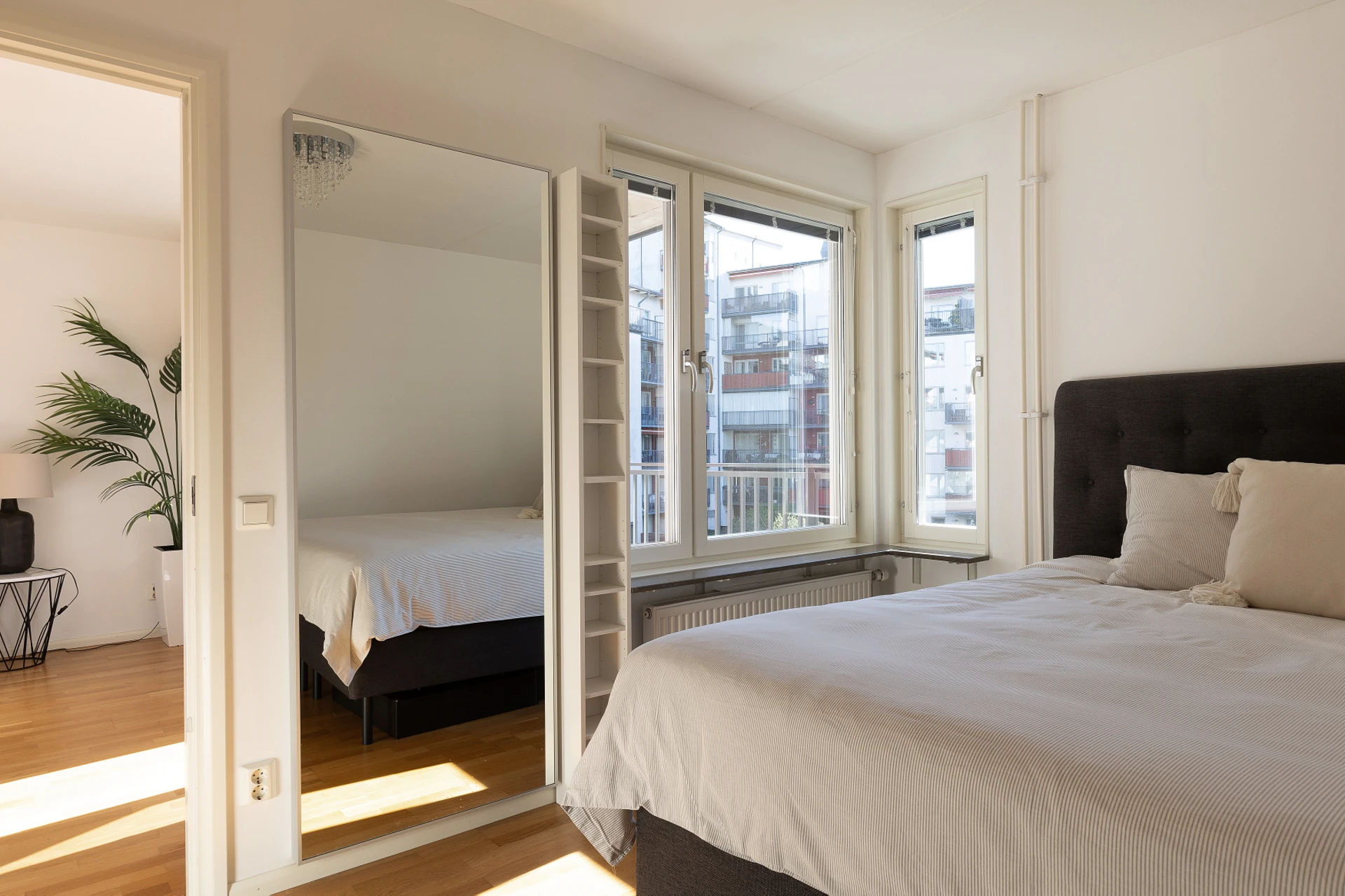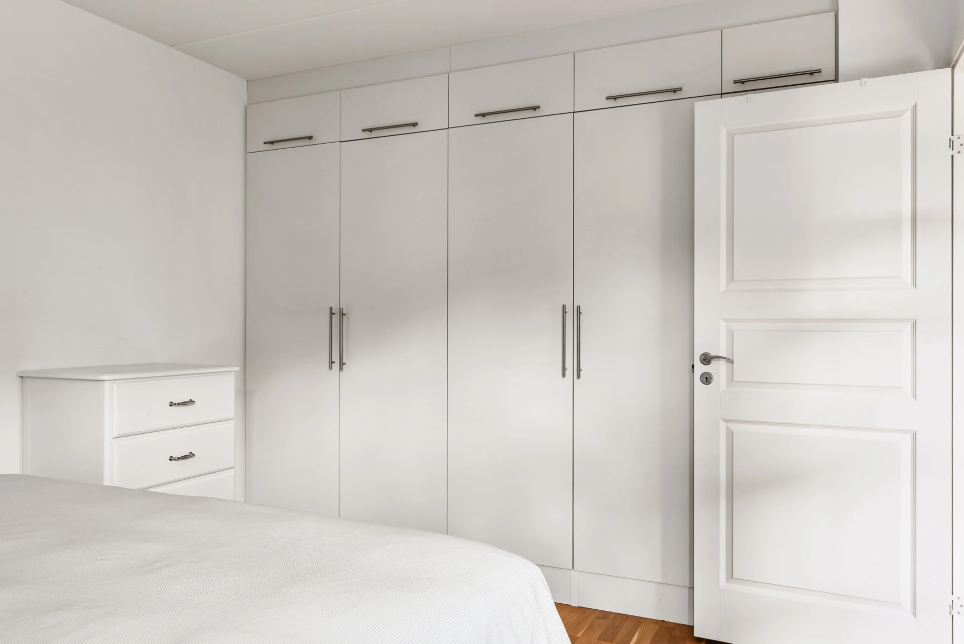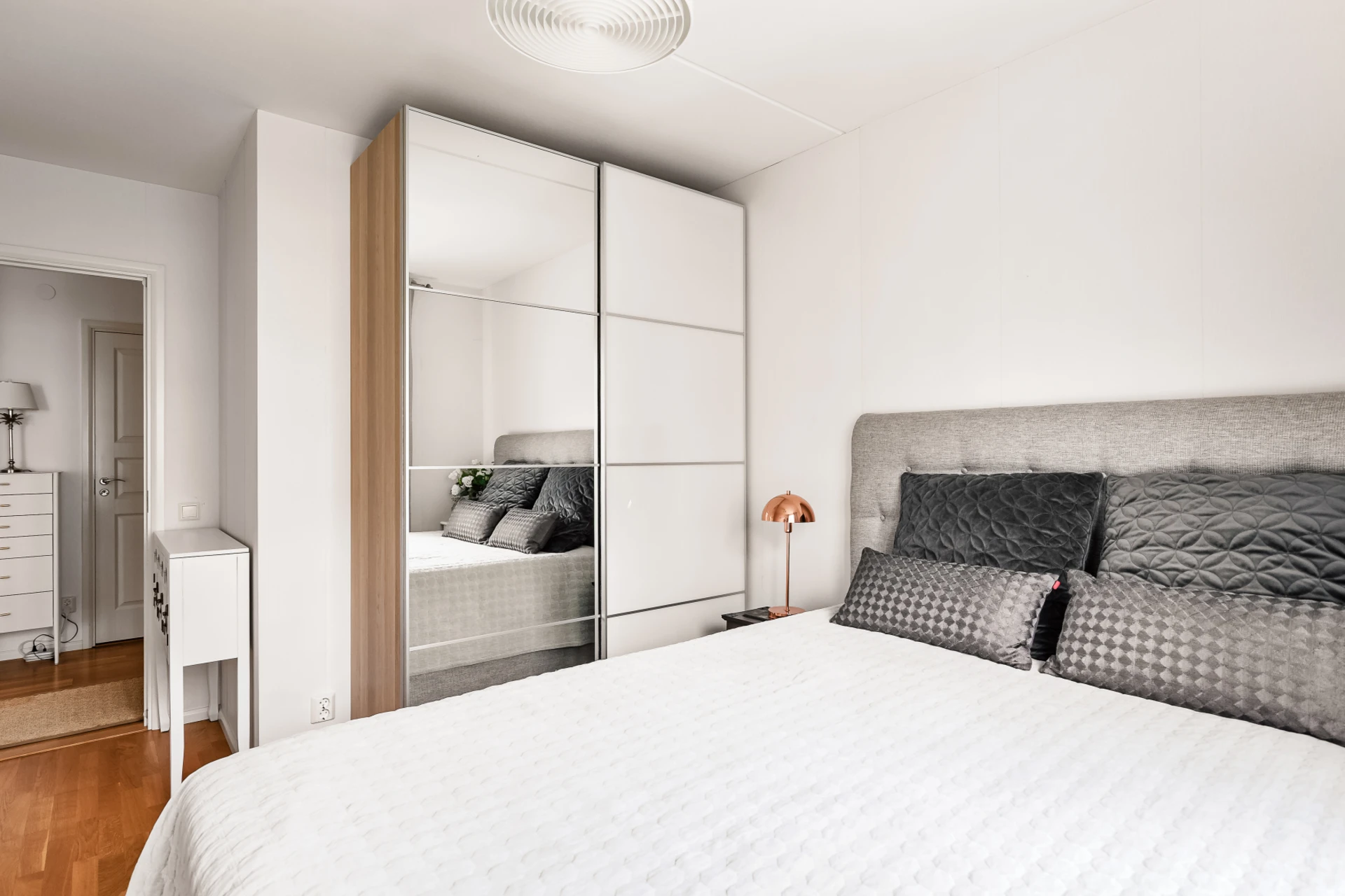 Parkettgolv och ljusa väggar. Garderob med skjutpartier. Fönster.