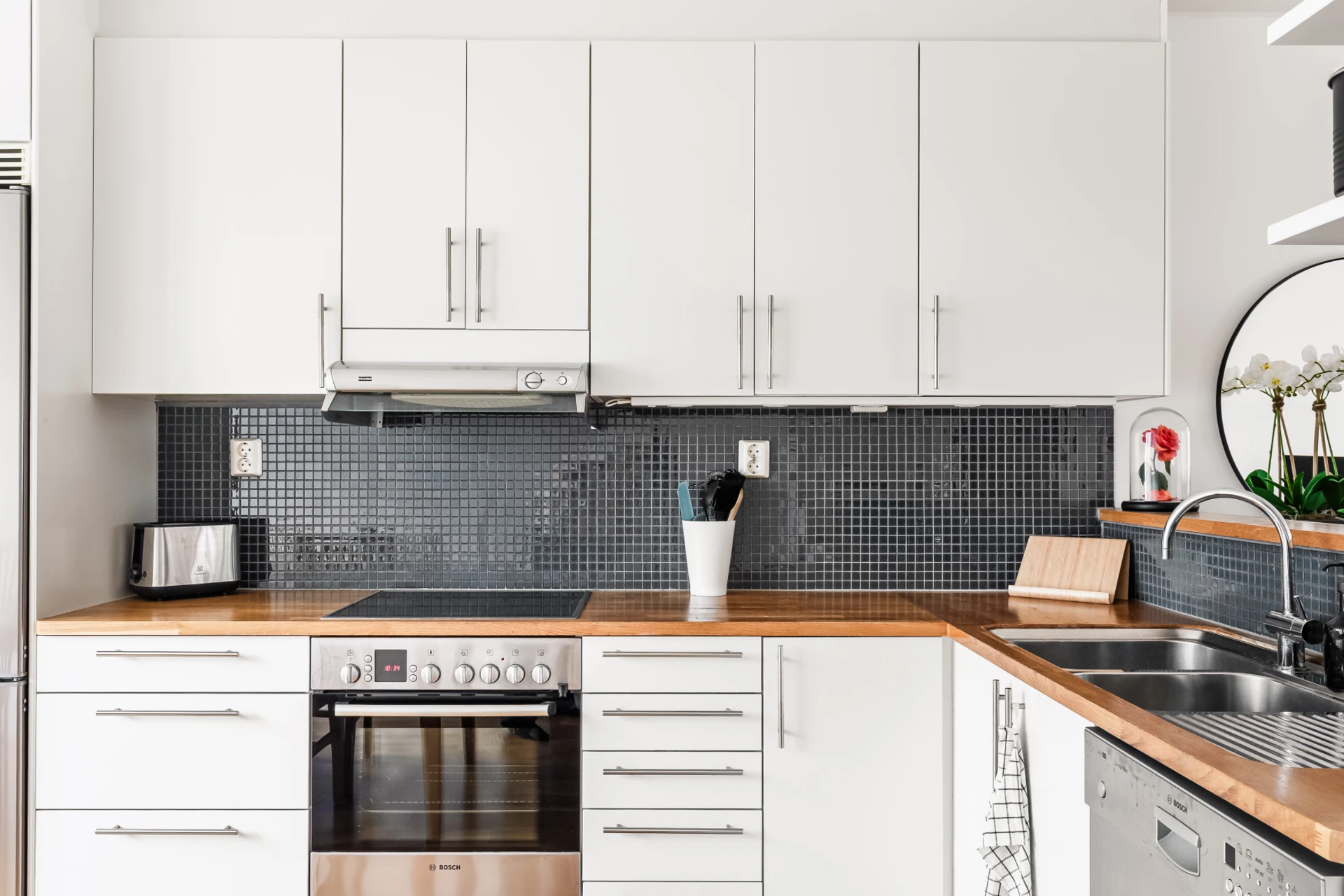 Parkettgolv och ljusa väggar. Ljusa skåpluckor och kakel/mosaik ovan arbetsbänk. Häll, fläkt (Franke), diskmaskin (Bosch) och inbyggd micro (Bosch) samt ugn (Bosch). Kyl och frys (Bosch). Delvis öppen planlösning mot vardagsrum och fönsterparti intill matplats.