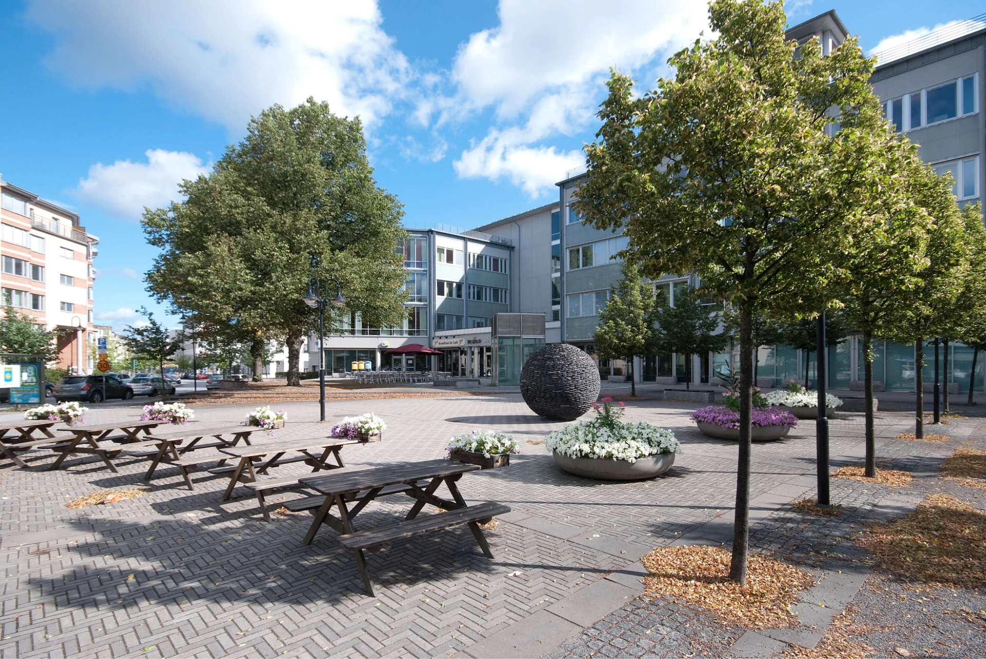 Trevlig innergård med stor gräsmatta och lekplats för barn. På gården finns även flera sittgrupper, grillplats. Träd, buskar och stor gräsyta angränsande mot skogsparti.