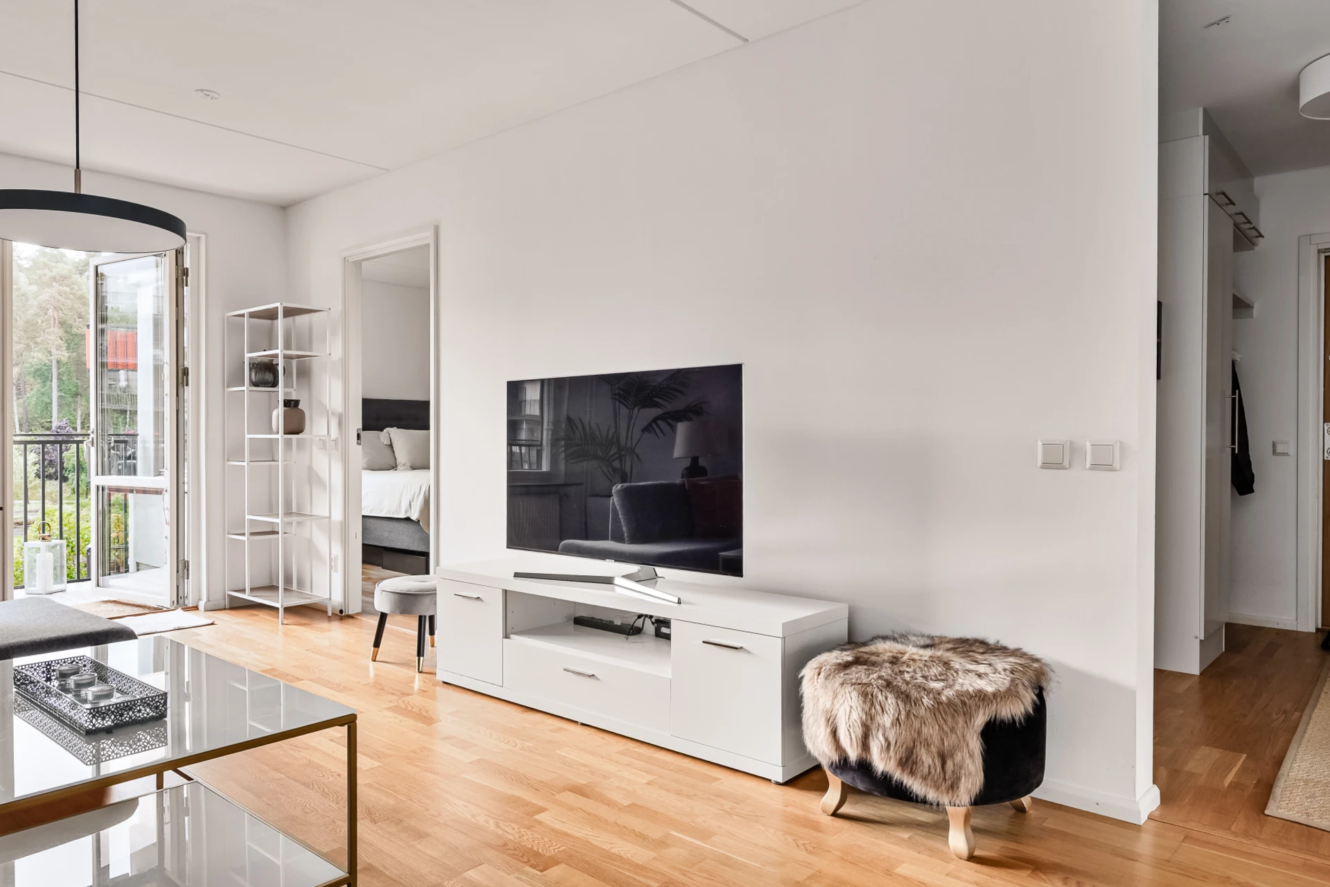Parkettgolv och ljusa väggar. Fönsterparti och utgång till balkong.