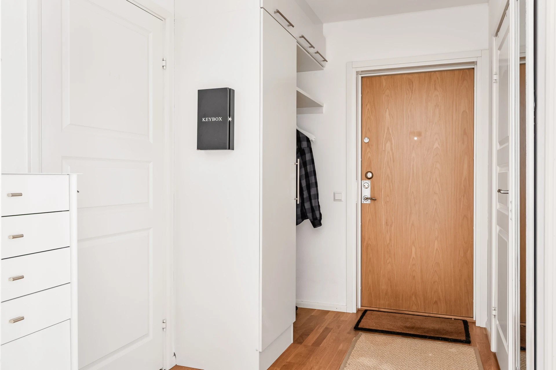 Parkettgolv och ljusa väggar. Garderob med hatthylla och överskåp samt ingång till klädkammare med hyllplan och klädstänger.