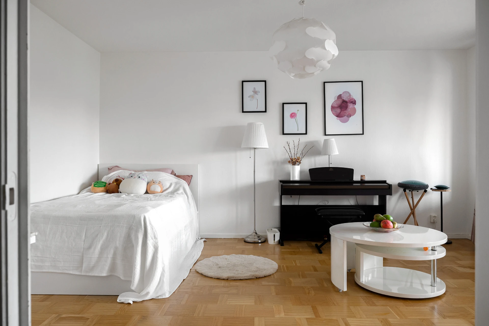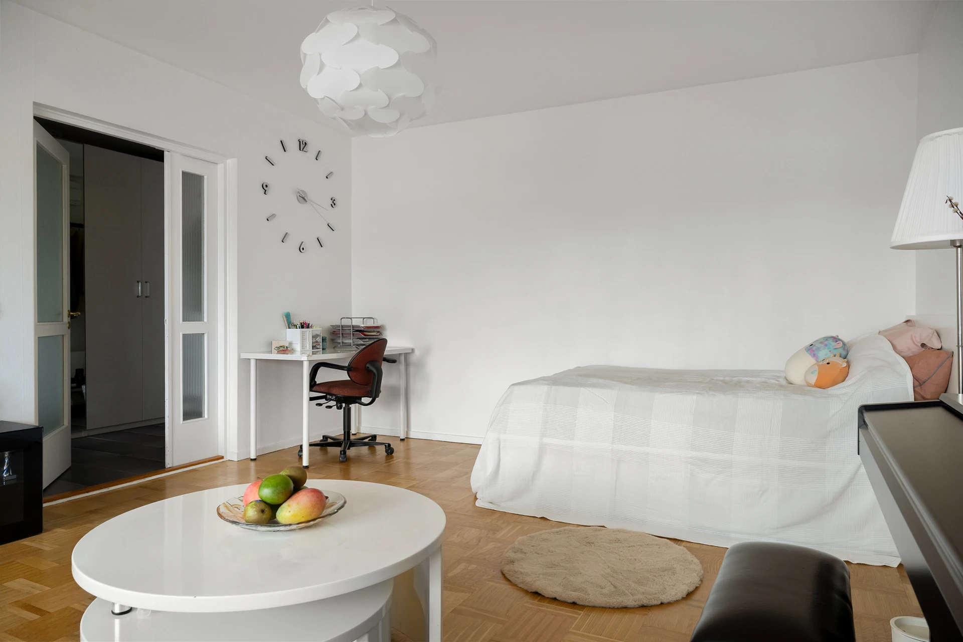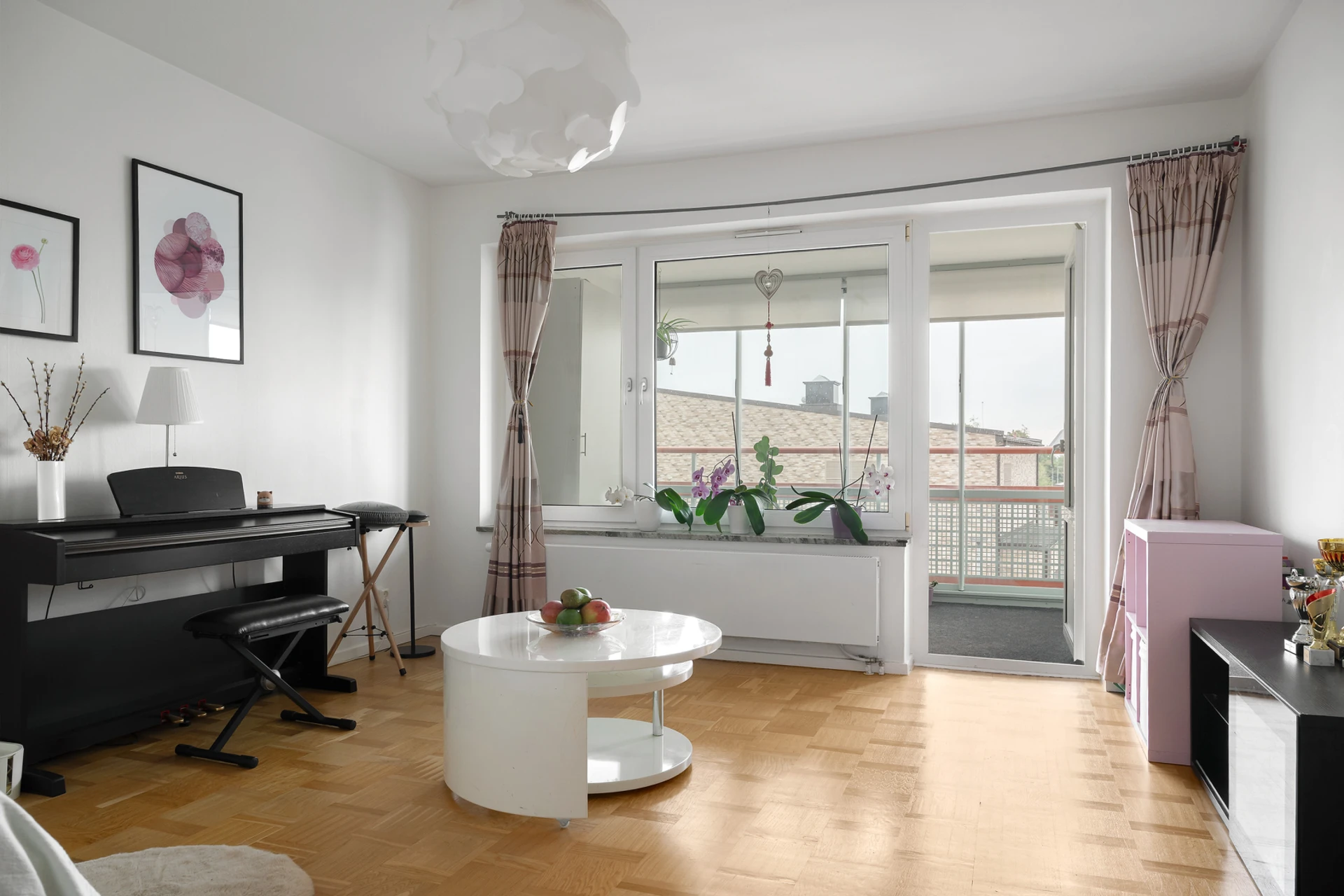 Parkettgolv i original och ljusa väggar. Utgång till inglasad balkong i söder.