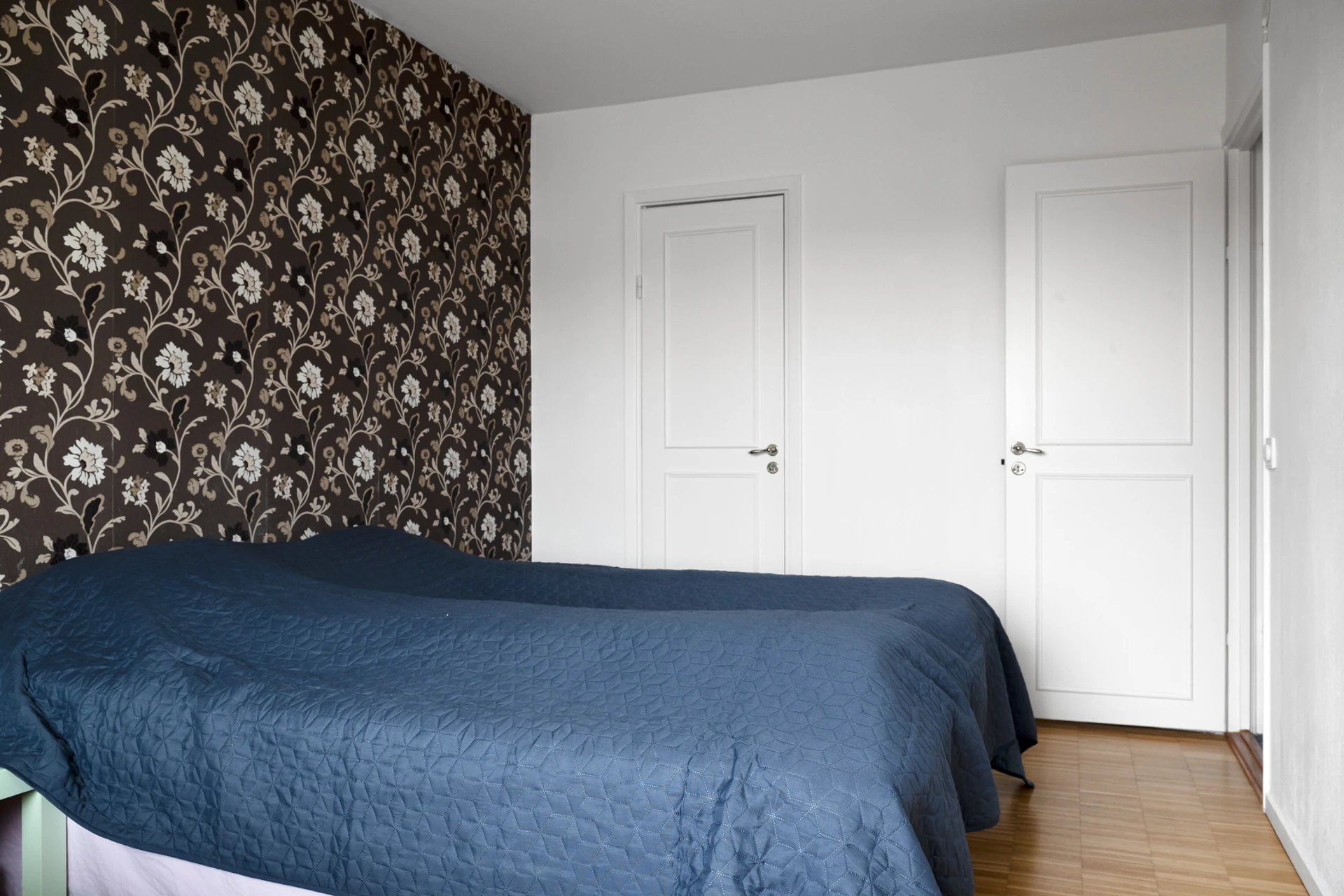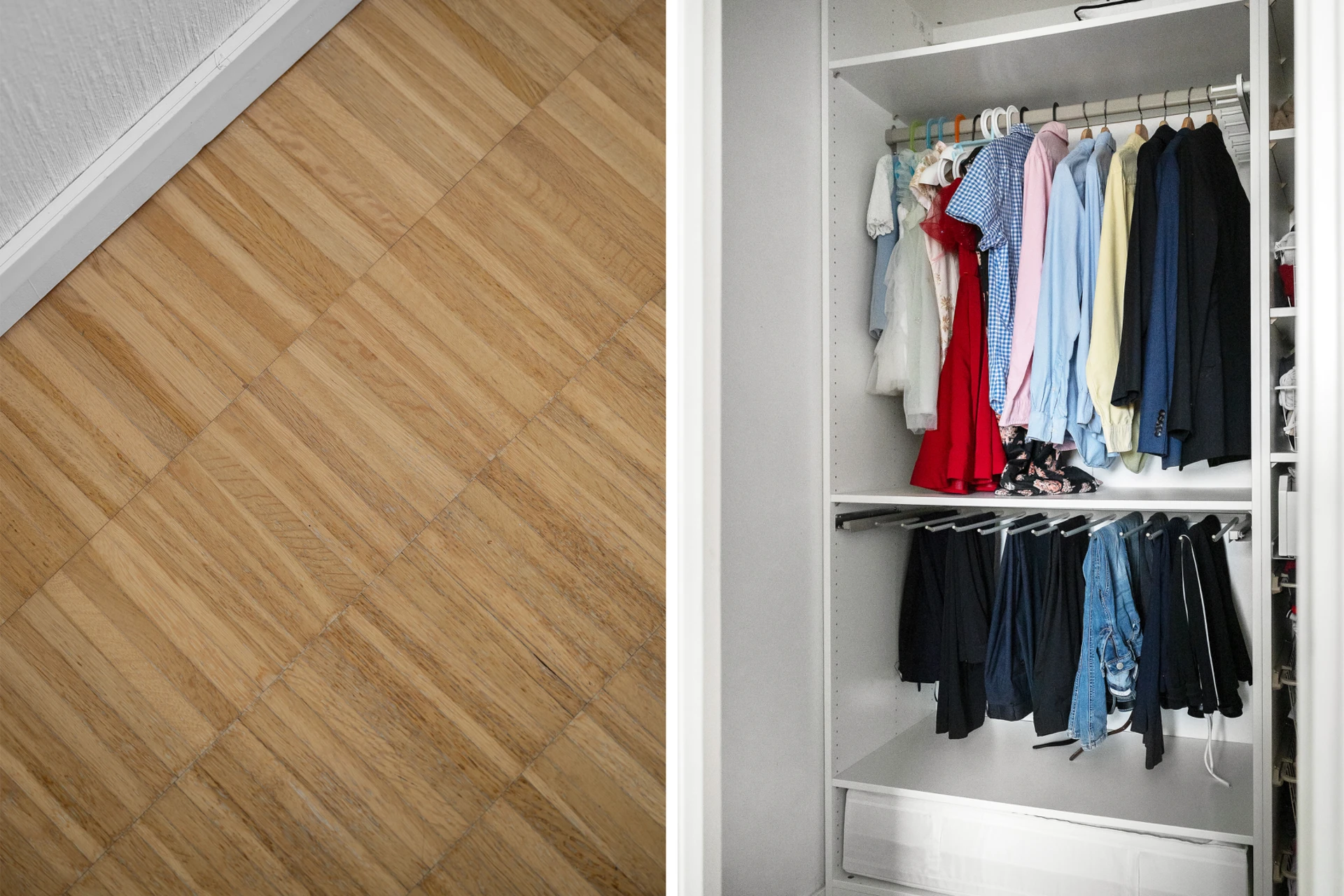 Stavparkett och ljusa väggar samt mönstrad fondvägg. Klädkammare.