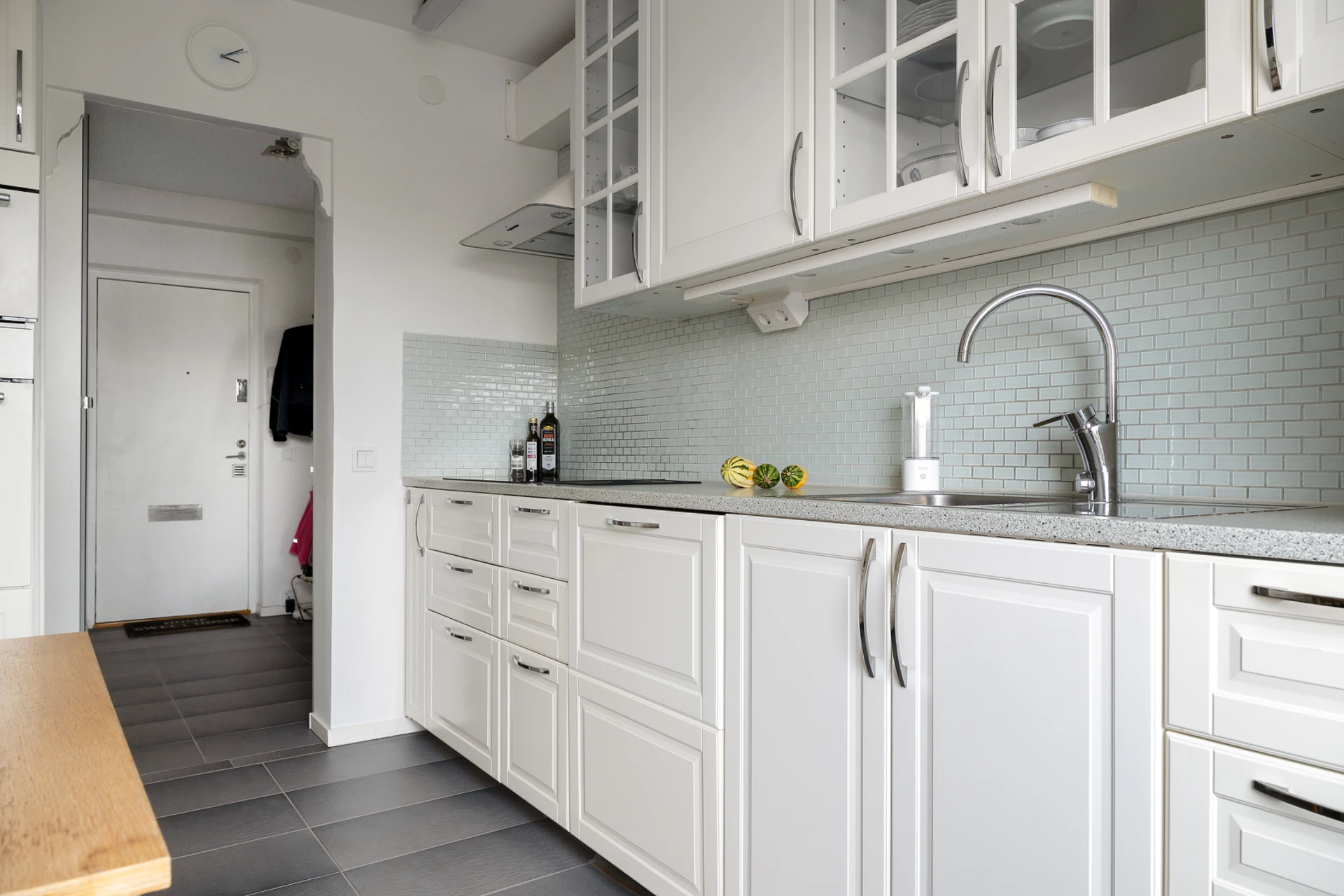 Grått laminatgolv och ljusa väggar samt mönstrad tapet. Vit köksinredning och mosaik ovan arbetsbänk i laminat. Glaskeramikhäll, fläkt, integrerad diskmaskin, kyl/frys och inbyggd ugn samt mikrovågsugn.