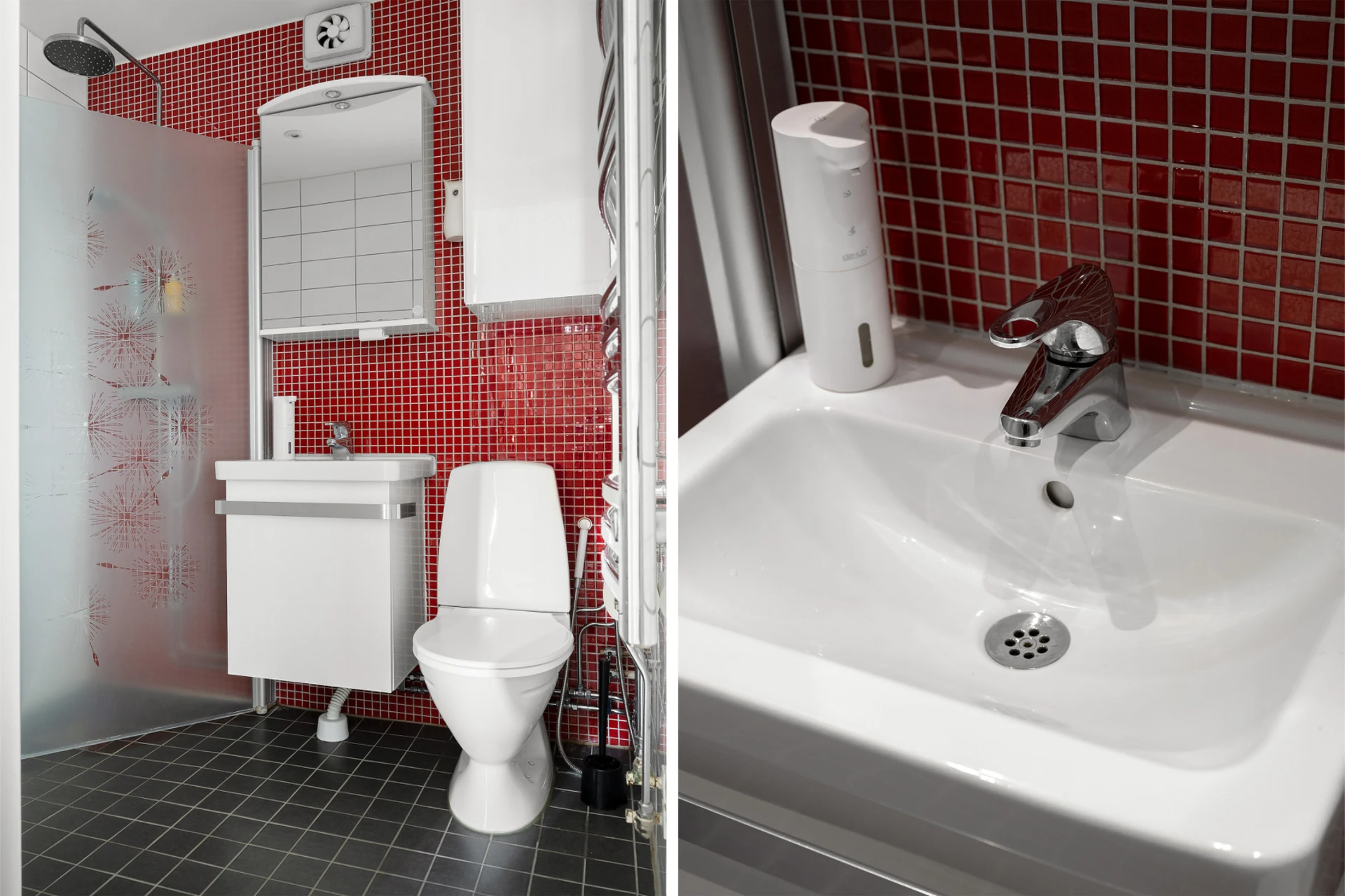 Svart klinker och vitt kakel sam röd mosaik. Takdusch med infällbar duschvägg, handfat med kommod, spegelskåp och WC.