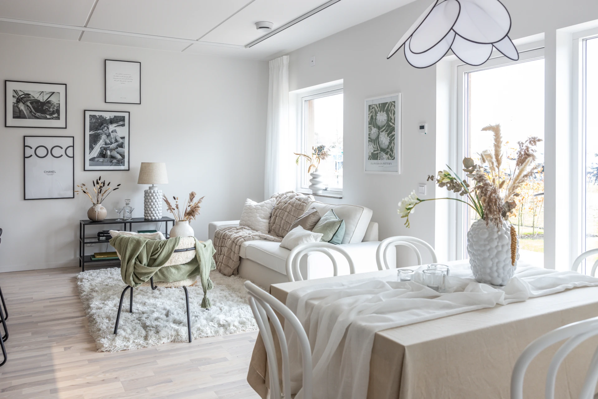 Askparkett på golvet och vitmålade väggar. Här finns plats för soffgrupp med tillhörande möblemang. Härifrån nås den härliga uteplatsen.