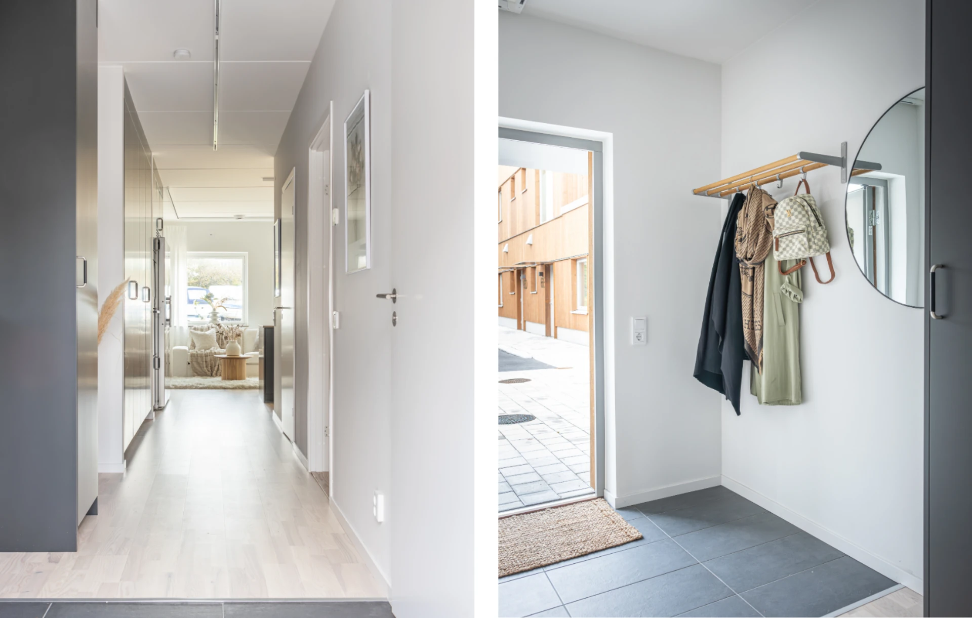 Klinkergolv i övergående askparkett och vitmålade väggar. Här finns plats för avhängning och förvaring i en platsbyggd garderob.