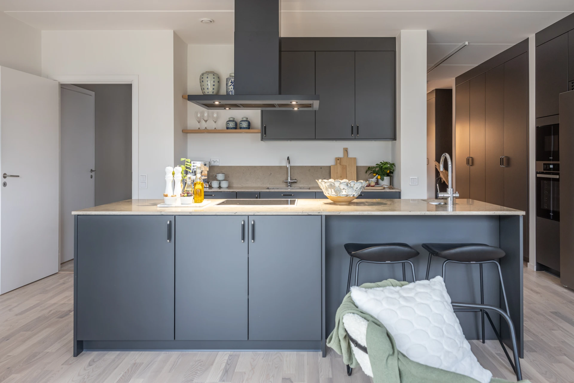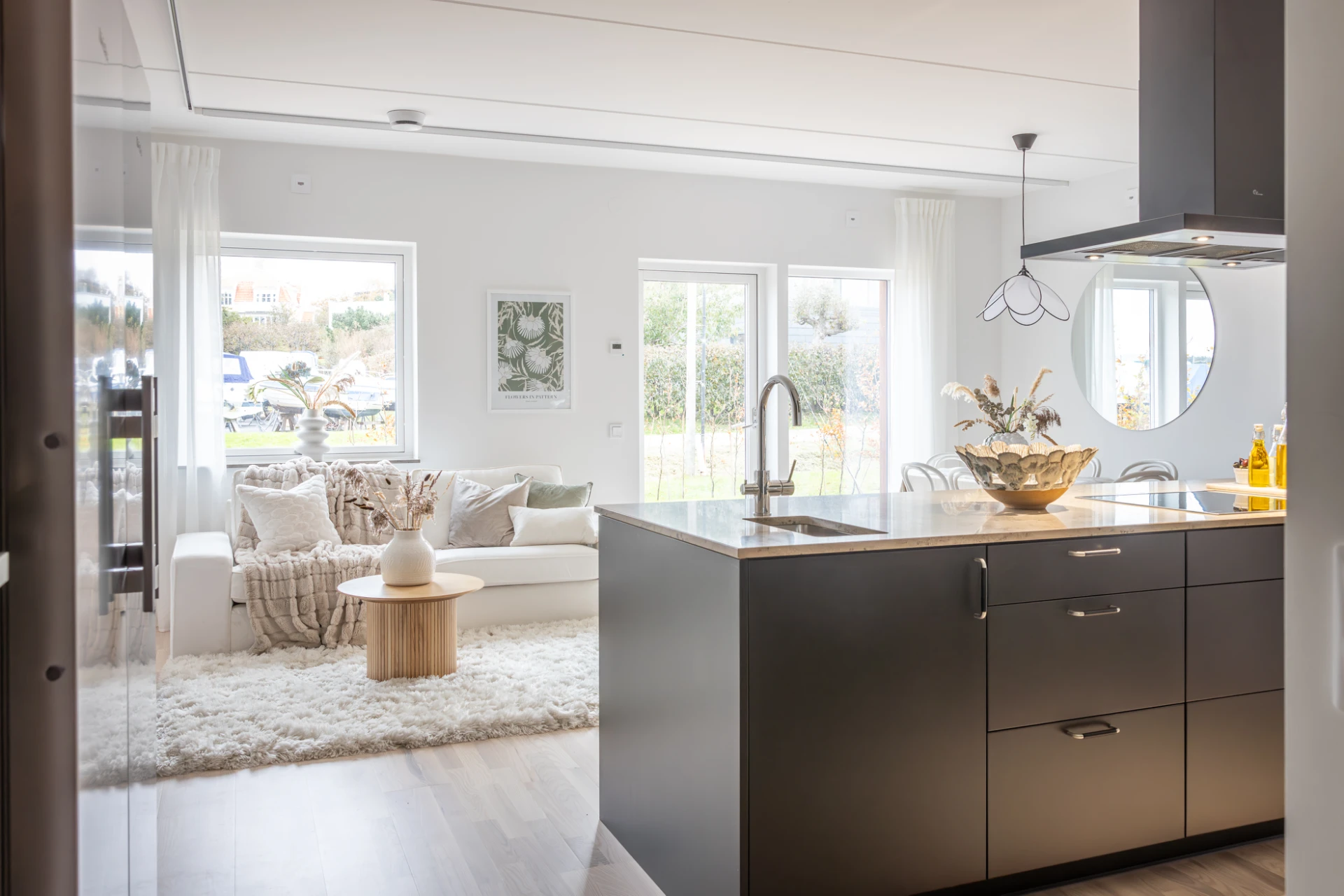 Nu ges möjligheten att förvärva ett smakfullt och exklusivt hem med grönskande uteplats och utsikt över Hovås Hamn! Här möts ni av en modern och harmonisk bostad där generösa fönsterpartier släpper in ett behagligt ljus och skapar en trivsam atmosfär. Tack vare den genomtänkta planlösningen smälter kök och vardagsrum samman i en social och ljus helhet, där köket får ta plats som bostadens levande centrum. Det kvalitativa köket från småländska Lundins erbjuder generösa arbetsytor och integrerade vitvaror från Miele. Från vardagsrummet nås den härliga, grönskande uteplatsen – en plats för avkoppling med fri vy över området och dess marina inslag. Här ges en känsla av att bo i villa, med direkt access till utomhusmiljö och möjlighet att njuta av lugnet utanför dörren. Sovrummen är generösa, där det större har plats för dubbelsäng och möblering samt direkt tillgång till en walk-in closet och badrum. Förvaringen är både integrerad och diskret med god kapacitet. Bostaden har enhetliga och påkostade materialval: tröskelfri askparkett och varmt beige väggar skapar ett sobert helhetsintryck. Det helkaklade badrummet i naturnära toner är utrustat med produkter från HAFA, dusch med vikbara glasväggar samt tvättmaskin och torktumlare under arbetsbänk med överskåp. Vattenburen golvvärme, FTX-ventilation och dimmerstyrd belysning via Plejd ger komfort och flexibilitet. Ett boende med hög standard, villakänsla och genomtänkt design i varje detalj.