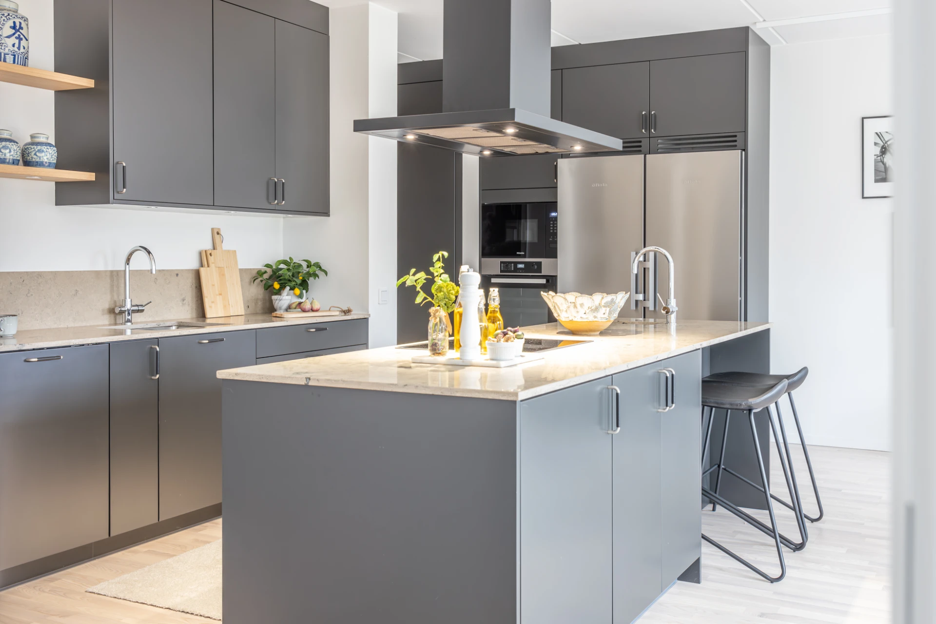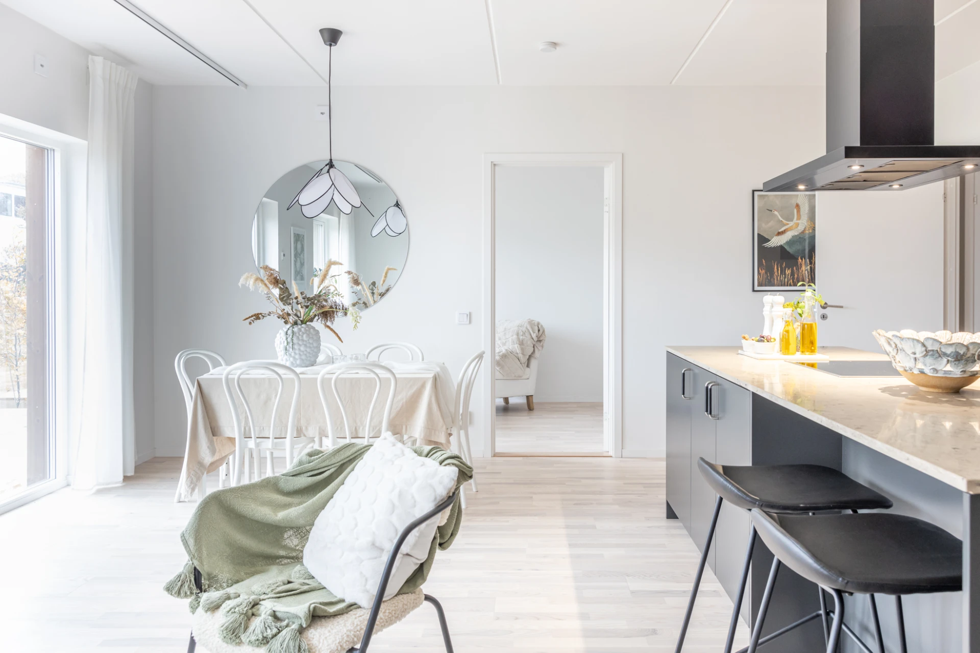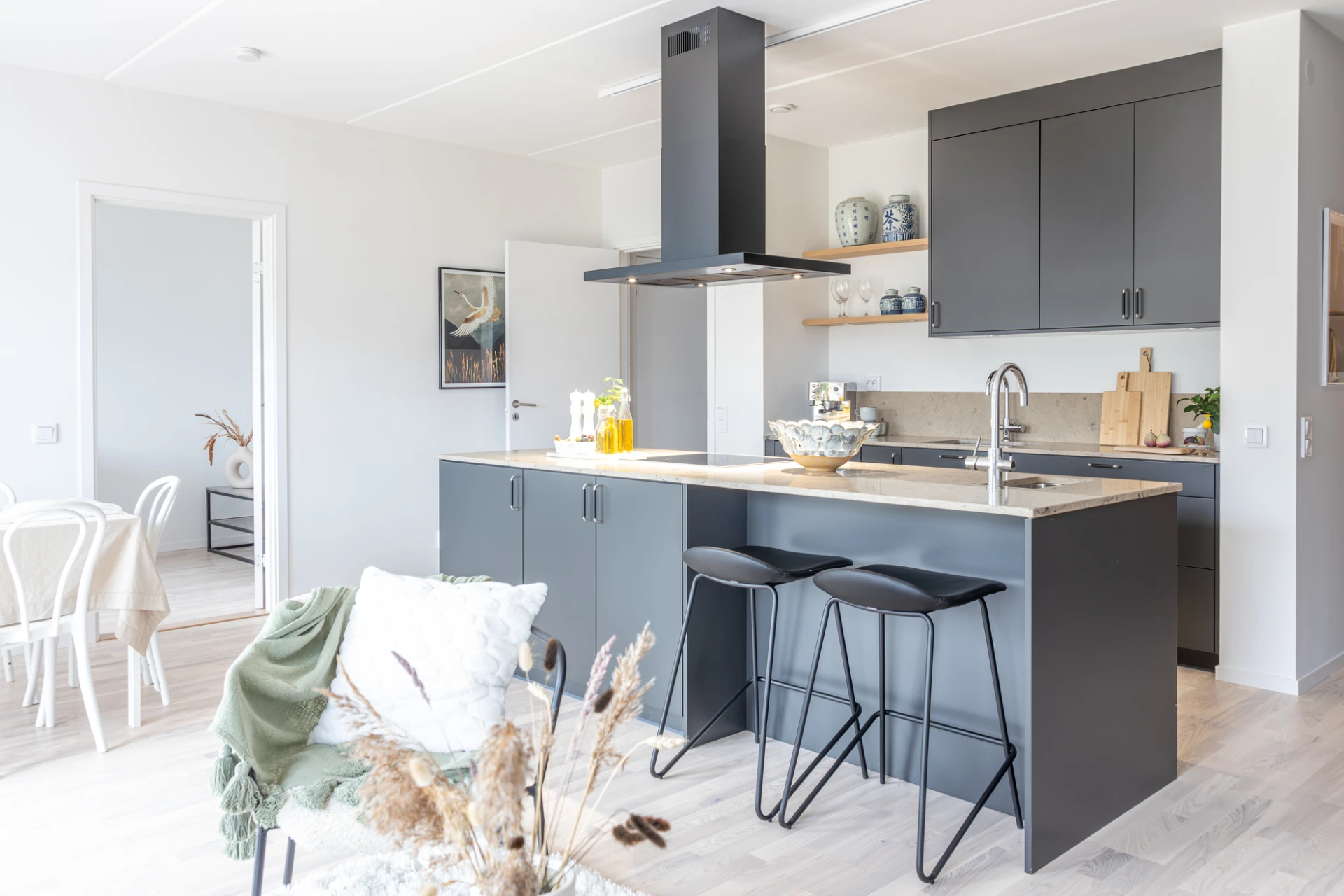 Askparkett på golvet och vitmålade väggar. Köksinredning från Lundins i en mörk grå ton och bänkskiva i kalksten. Vitvarorna består av induktionshäll, köksfläkt, inbyggnadsugn, kyl/frys, diskmaskin samt mikrovågsugn. Här finns plats för större matsalsbord. Öppen planlösning mot vardagsrum. Vitvarorna är av fabrikat Miele.