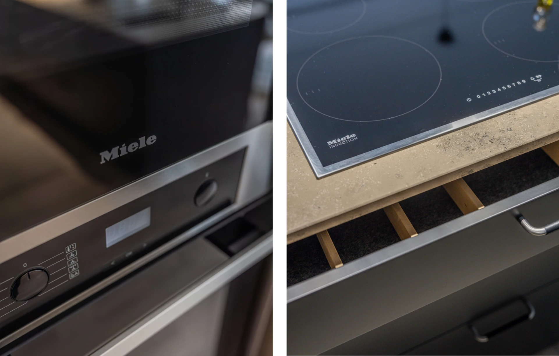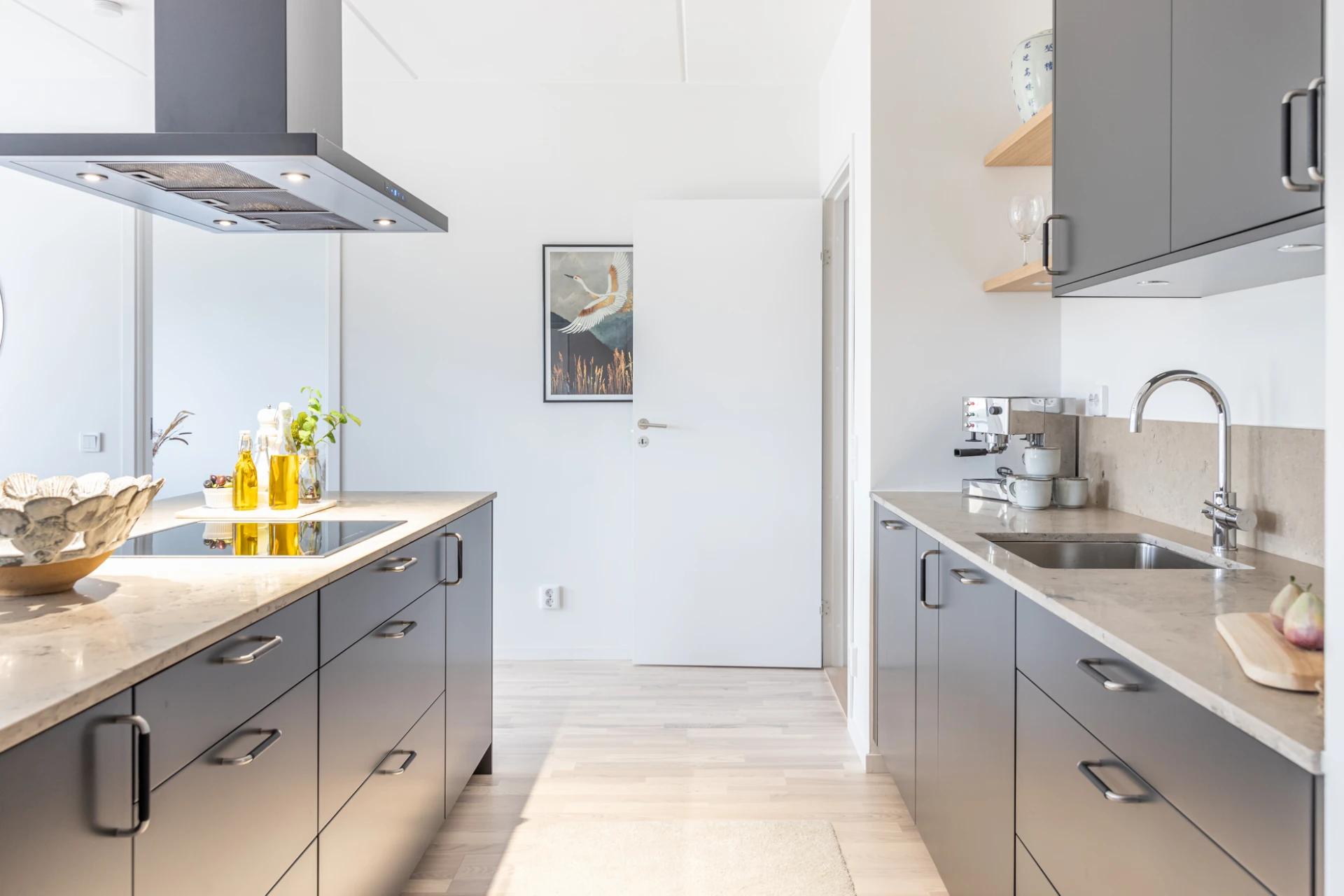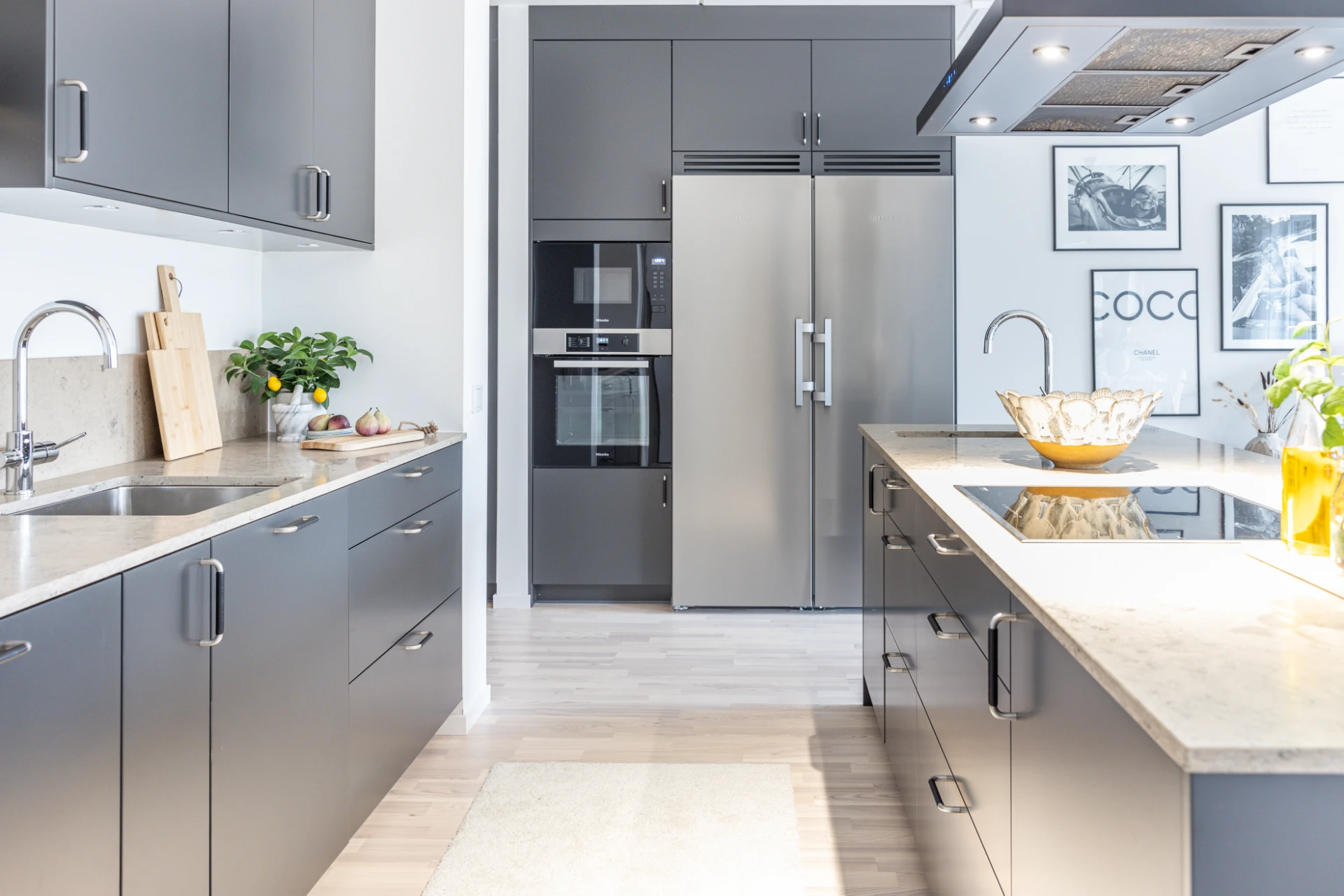 Askparkett på golvet och vitmålade väggar. Köksinredning från Lundins i en mörk grå ton och bänkskiva i kalksten. Vitvarorna består av induktionshäll, köksfläkt, inbyggnadsugn, kyl/frys, diskmaskin samt mikrovågsugn. Här finns plats för större matsalsbord. Öppen planlösning mot vardagsrum. Vitvarorna är av fabrikat Miele.