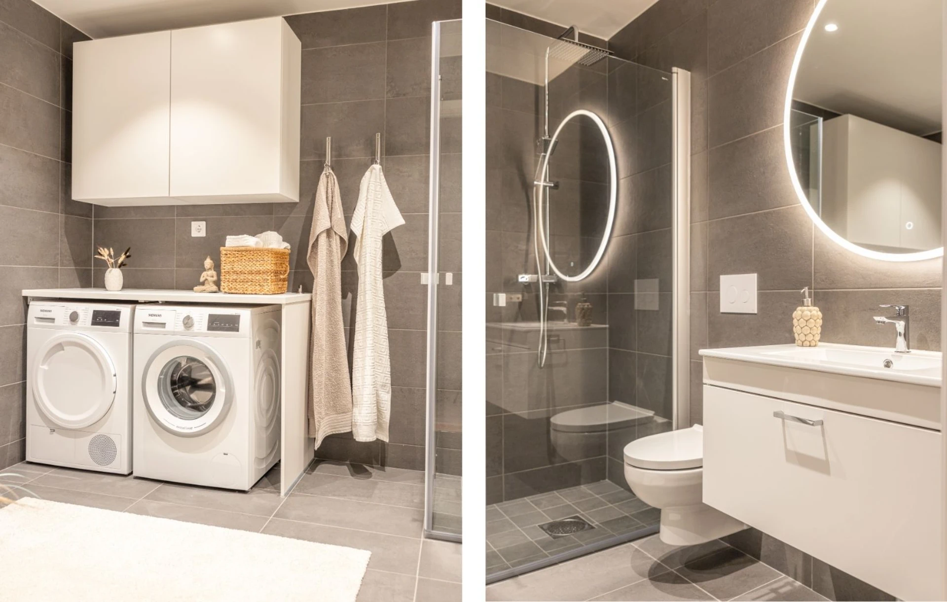 Klinkergolv och helkaklade väggar i grått. Badrumsinredningen består av vägghängd WC, handfat med kommod, spegel med inbyggd LED-belysning, dusch med glasdörrar, handdukstork, förvaringsskåp samt egen tvättutrustning bestående av tvättmaskin och torktumlare. Badrumsinredningen är från Hafa.