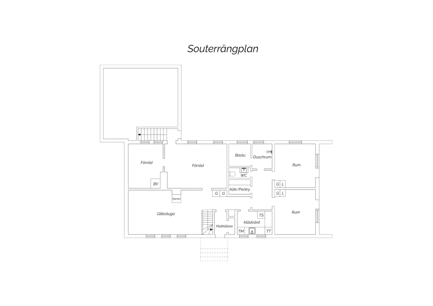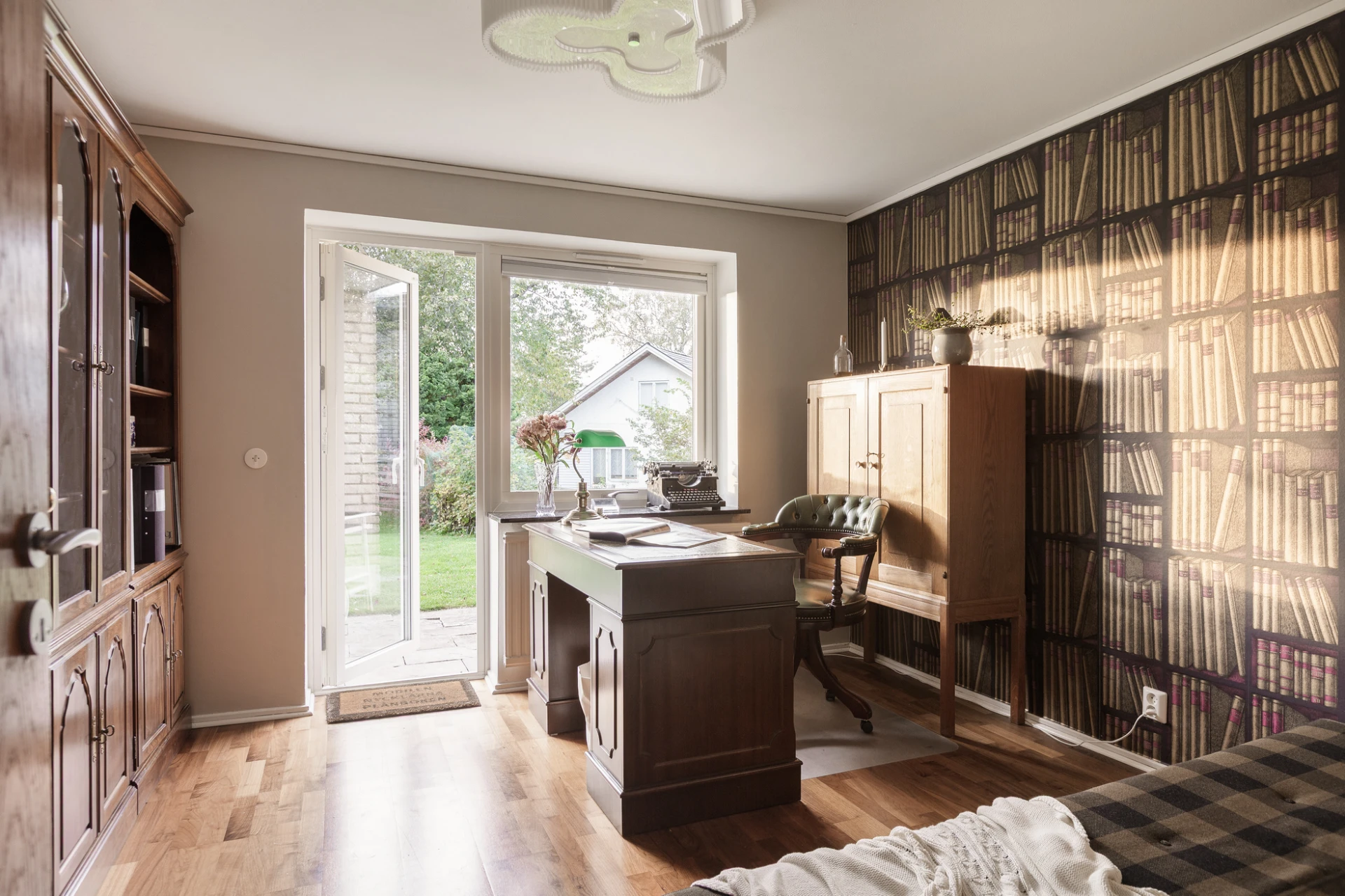 Laminatgolv och tapetserade väggar. Kontor och gästrum idag med utgång till trädgården via altandörr. 2 garderober.